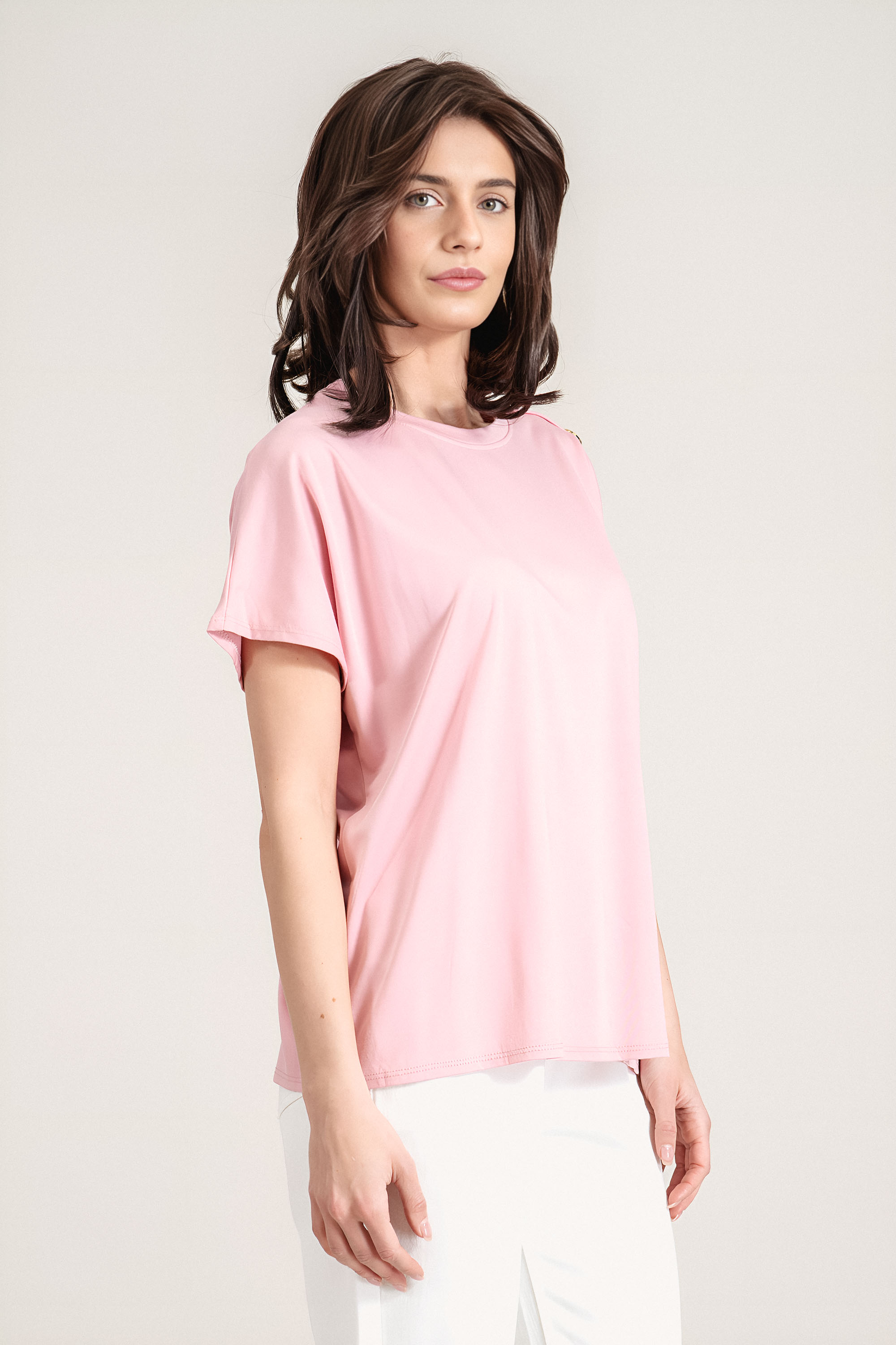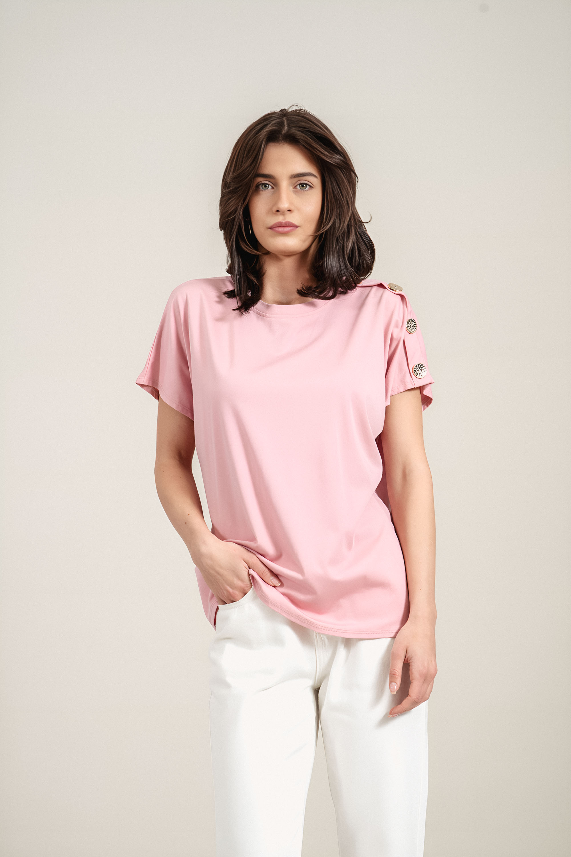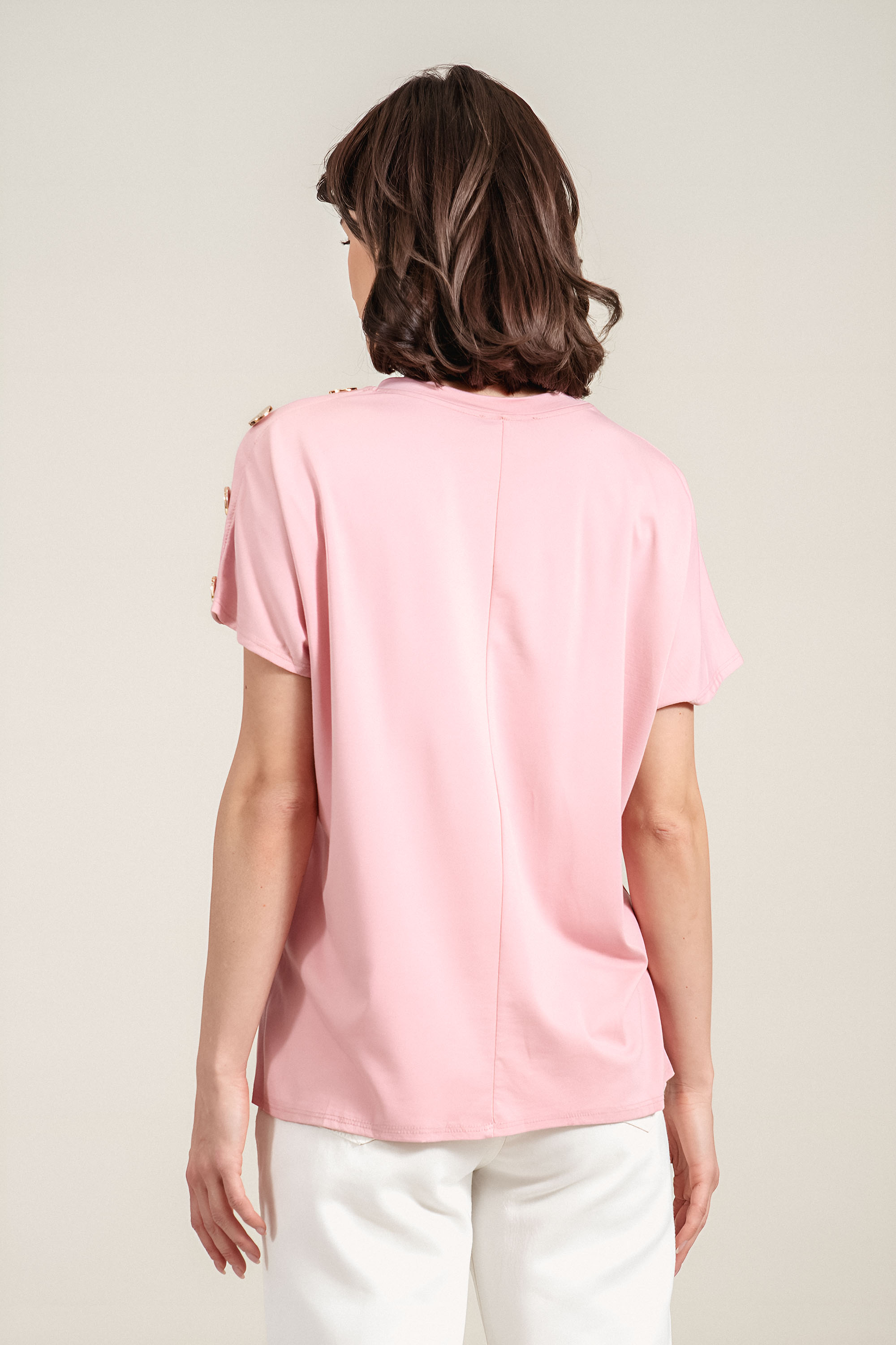 Изчистена блуза от трико с модерен минималистичен дизайн и фин акцент със златисти копчета по рамото. Свободната кройка и меката материя осигуряват комфорт и лекота при носене през целия ден. Облото деколте подчертава нежно линията на шията, а розовият нюанс позволява лесно съчетаване с различни визии. Подходящ избор за ежедневие, офис или пътуване.