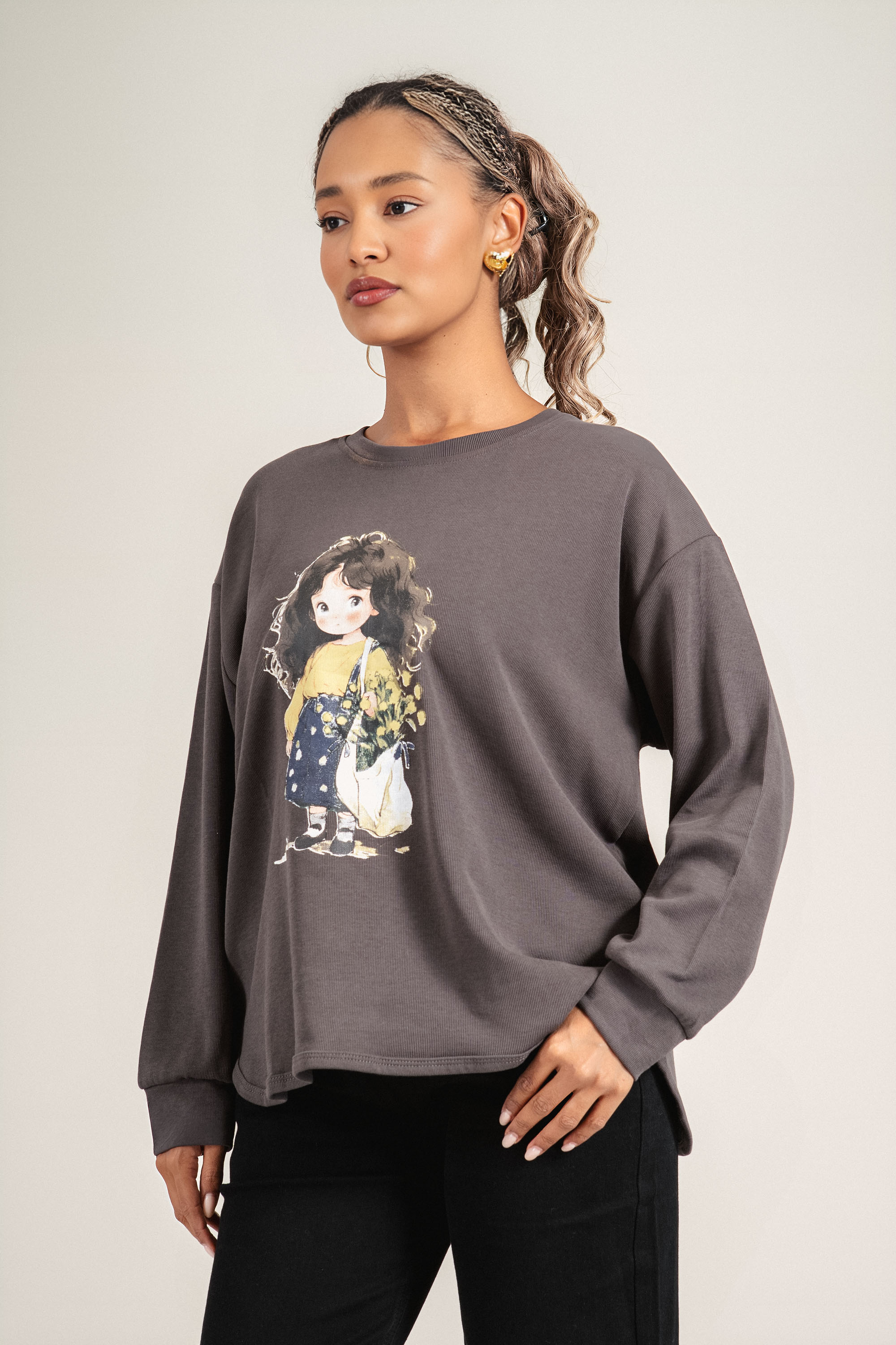 Дамска блуза в сиво с щампа момиче с чанта и цветя