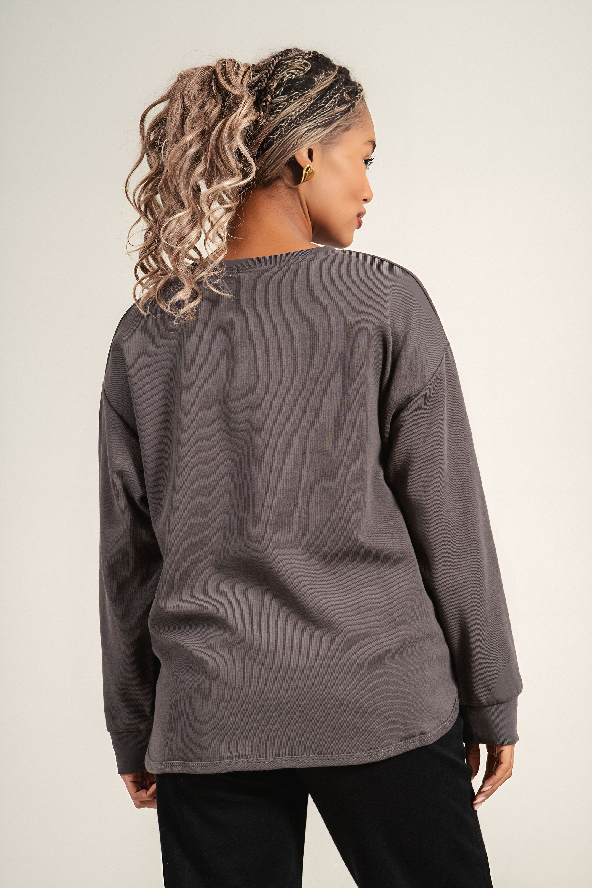 Блуза с оригинален принт – мимичес чанта и цветя, съчетаваща артистичен почерк и комфорт. Mатерията е приятна на допир, а свободната кройка и заобленият долен край придават женствен силует. Подходяща за ежедневието и по-креативна визия.