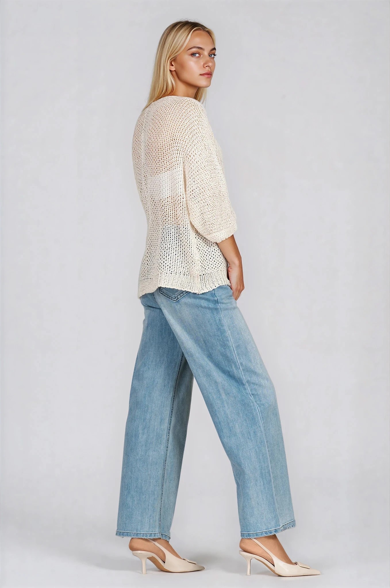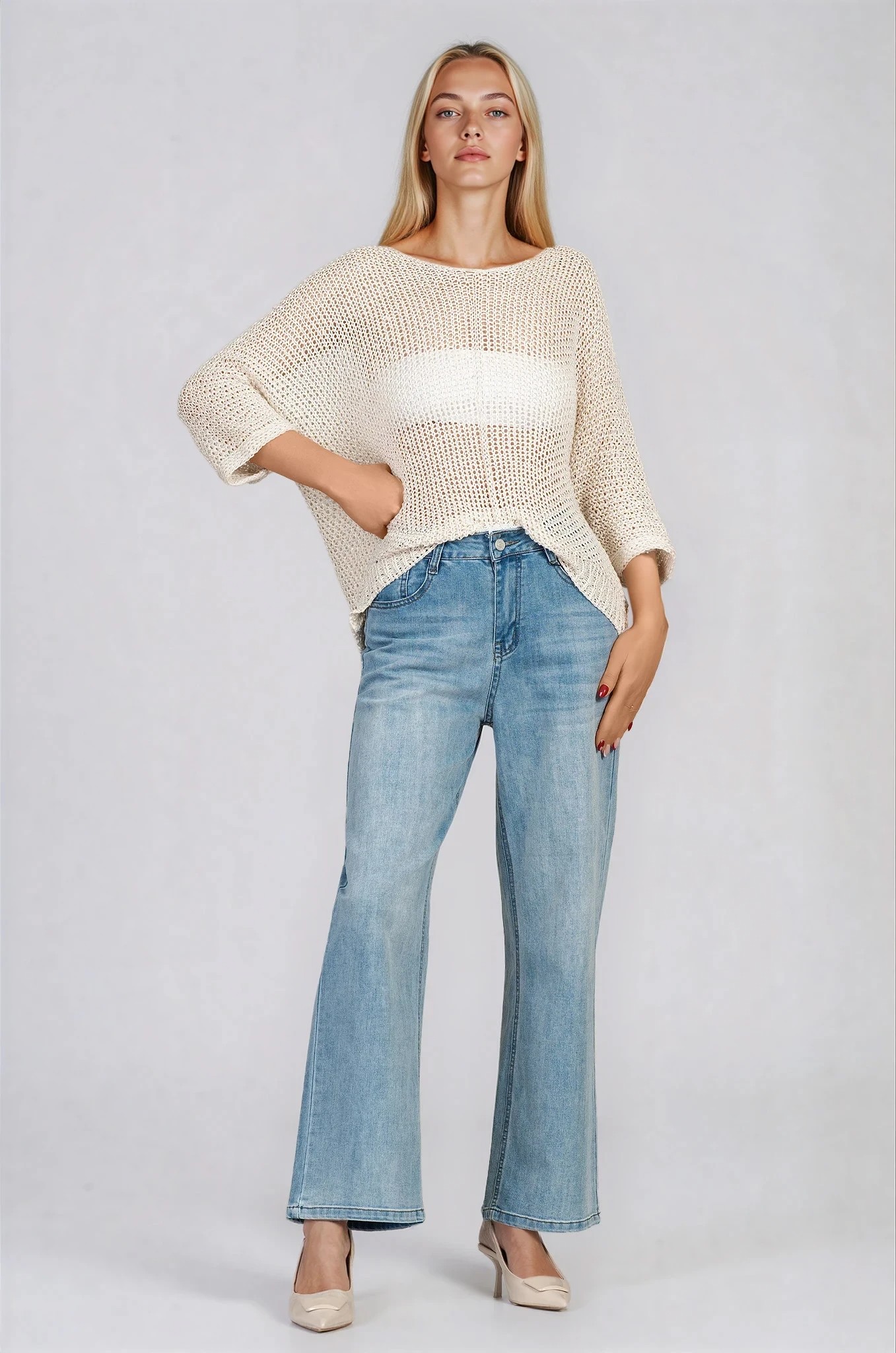 Елегантна туника от едро плетиво в нежен бежов нюанс. Моделът е с обло деколте и свободен силует, който пада естествено по тялото и осигурява комфорт през целия ден. Едрата плетка и издълженият гръб създават модерен силует и визуален баланс. Подходяща е за пролетно-летния сезон и се комбинира лесно с деним или светли панталони. Произведена в Италия с внимание към качеството и детайла.