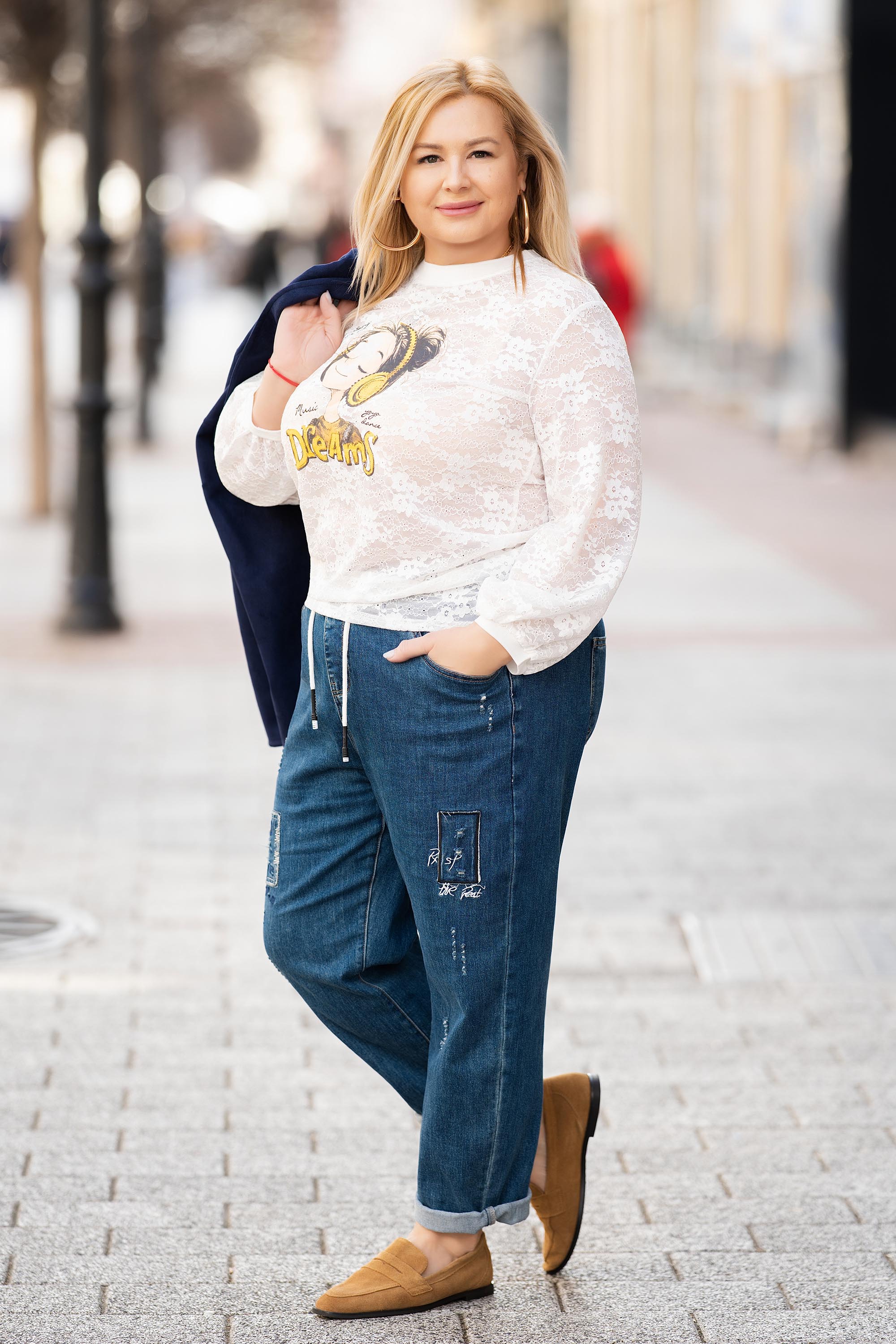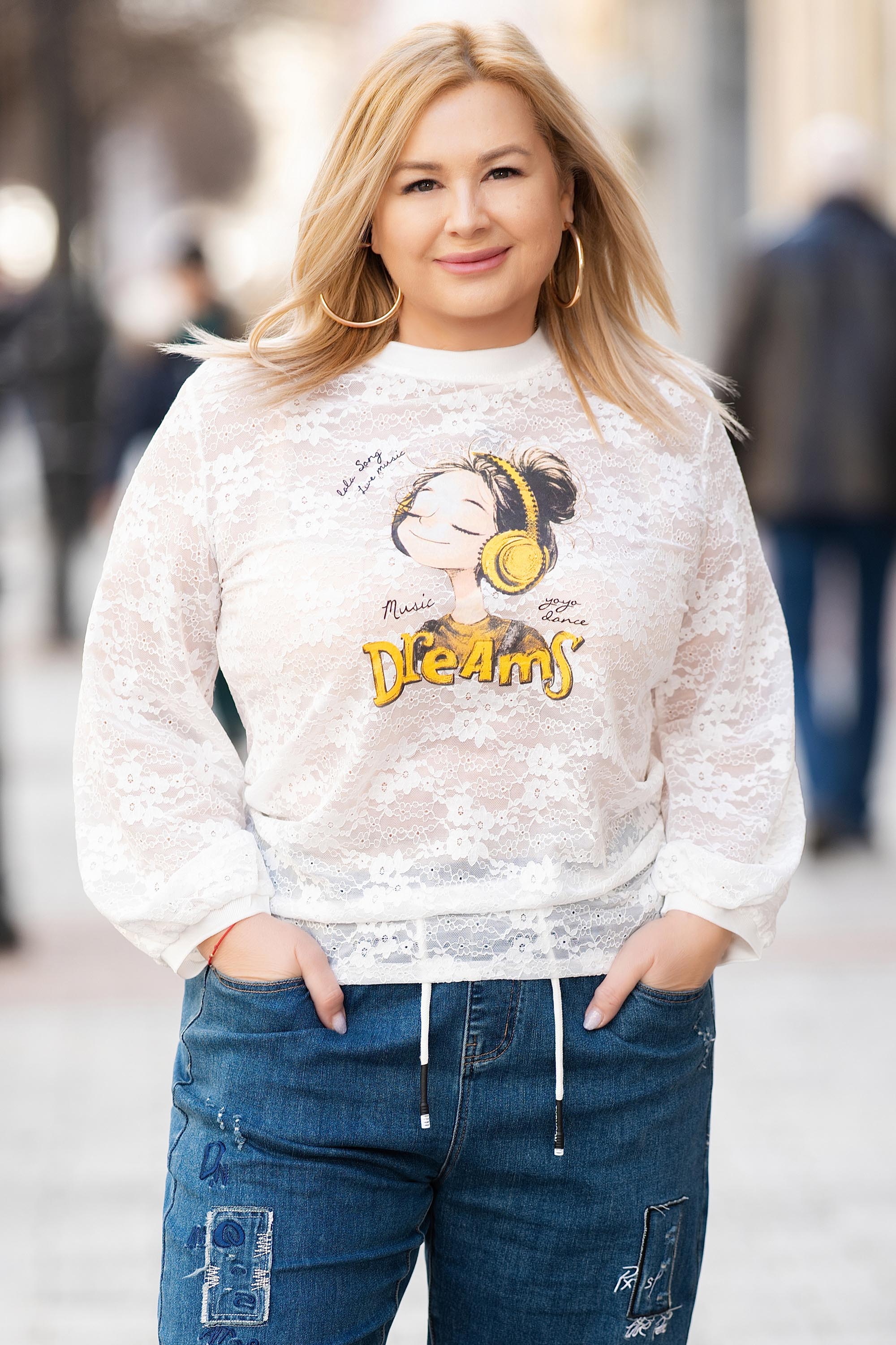 МАКСИ бяла блуза от дантелена мрежа с щампа момиче и надпис