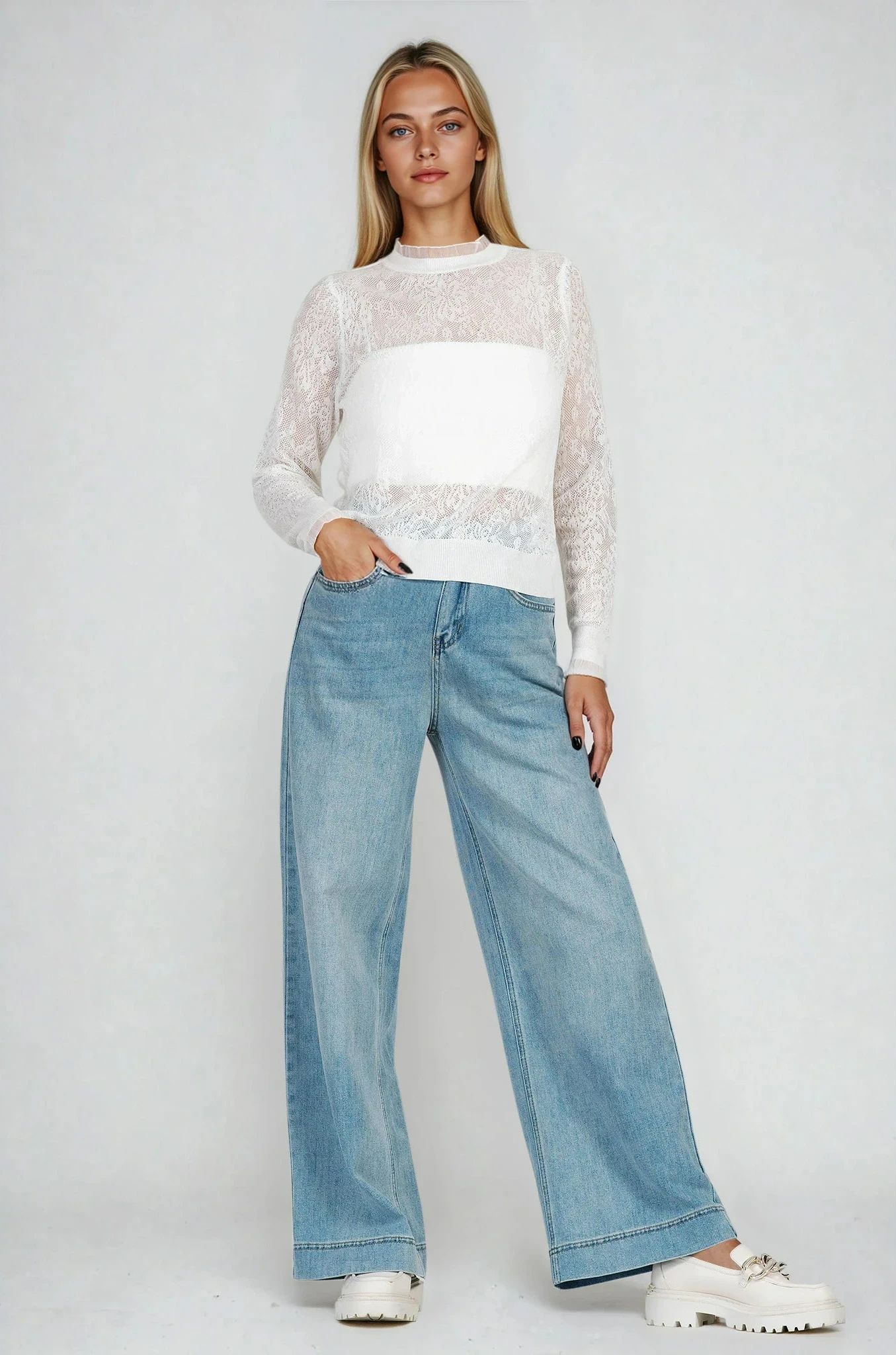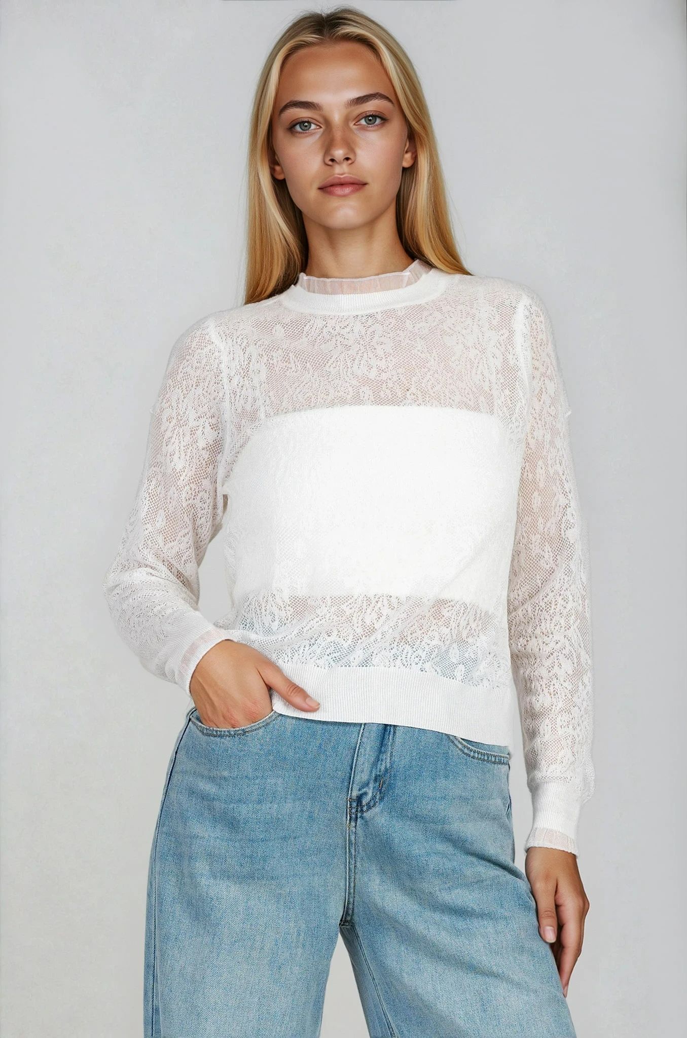 Дамска бяла блуза от фино плетиво с бродерия и тюл на деколтето