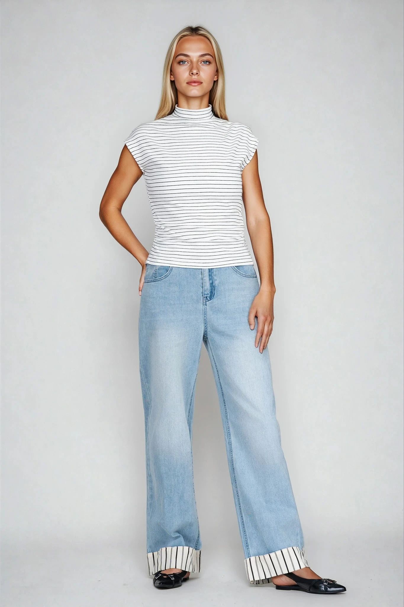 Тази блуза от меко трико съчетава минимализъм и модерна елегантност. Моделът е с висока яка, а фините хоризонтални райета в черно подчертават фигурата. Материята е с високо съдържание на вискоза и еластичност, което осигурява комфорт и прилягане. Отличен избор за градски стил, офис или ежедневно носене.