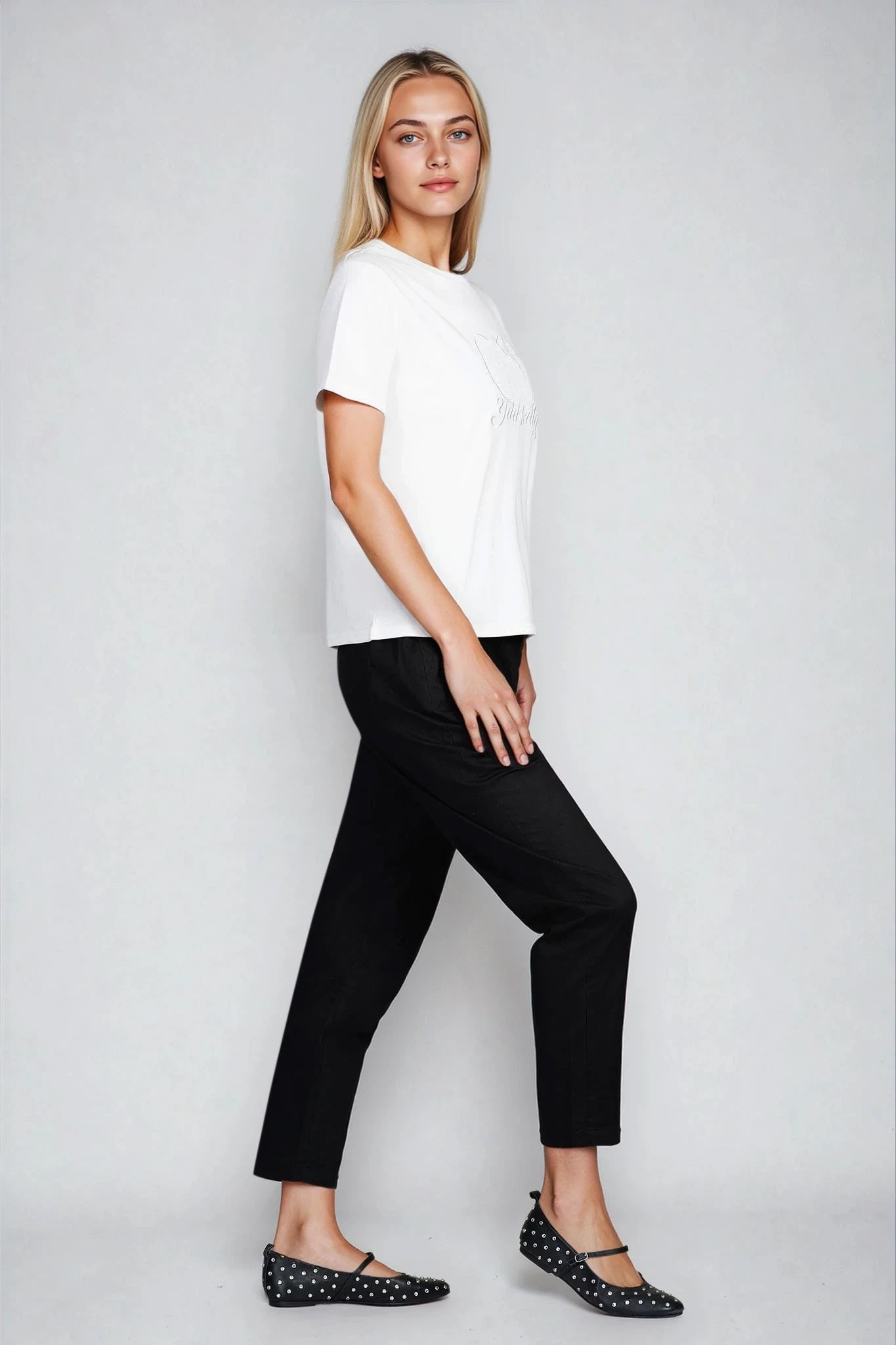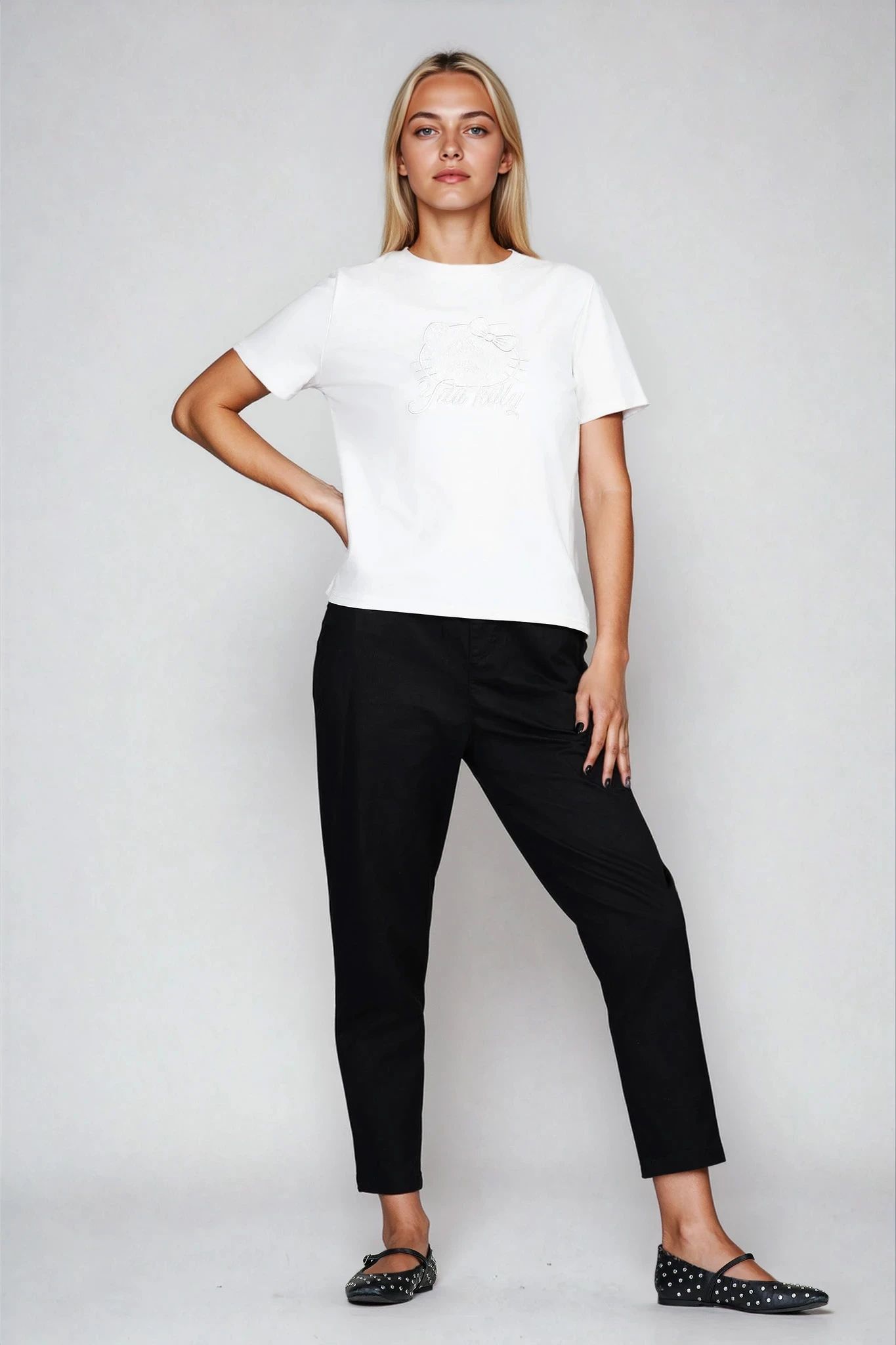 Тази тениска в класическо бяло впечатлява с деликатна бродерия на коте с панделка и надпис. Изработена от памучна материя с еластичност, тя приляга комфортно по тялото, без да ограничава движенията. Облото деколте и изчистената кройка я правят лесна за съчетаване с дънки, поли или спортни панталони.