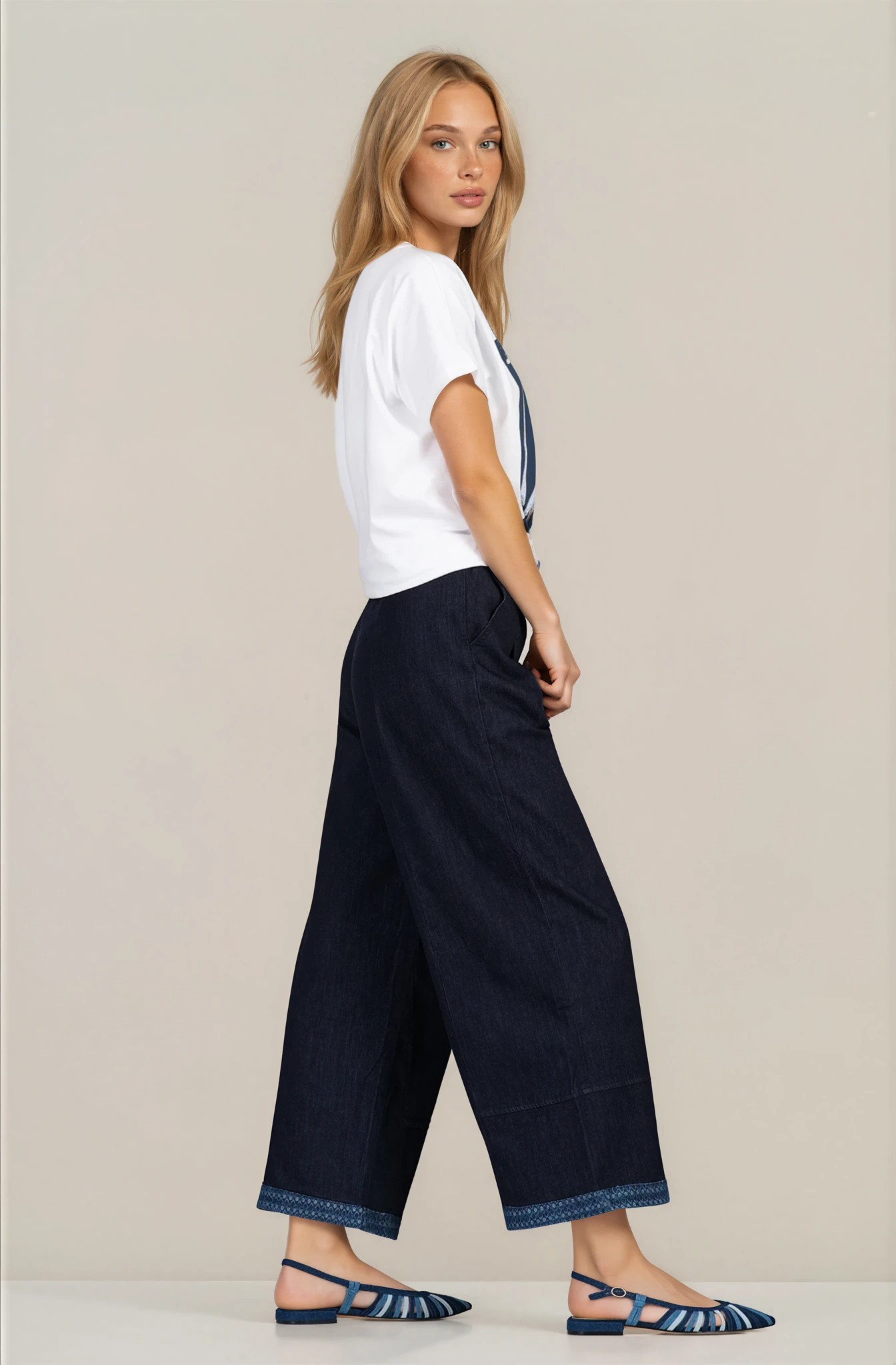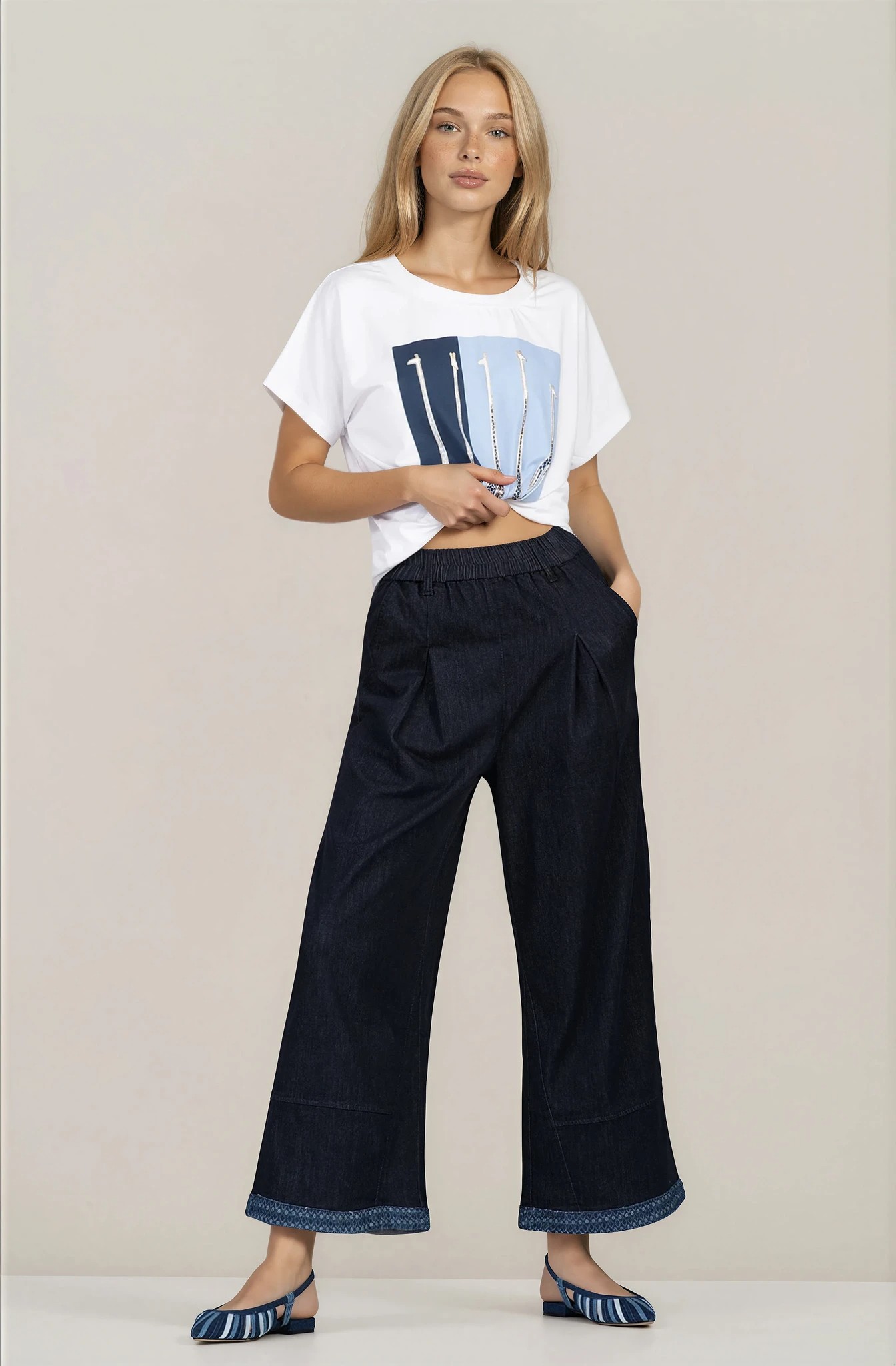 Свеж модел от памучно трико с лека еластичност, създаден за максимален комфорт през топлите дни. Правата кройка пада свободно по тялото и позволява лесно комбиниране с дънки, панталони или поли. Контрастната синя щампа добавя характер и подчертава индивидуалния стил. Италианското производство гарантира внимание към детайла и устойчиво качество.