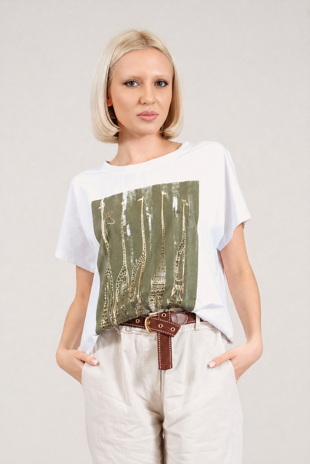Дамска бяла тениска от памук с щампа в зелено със златисти жирафи
