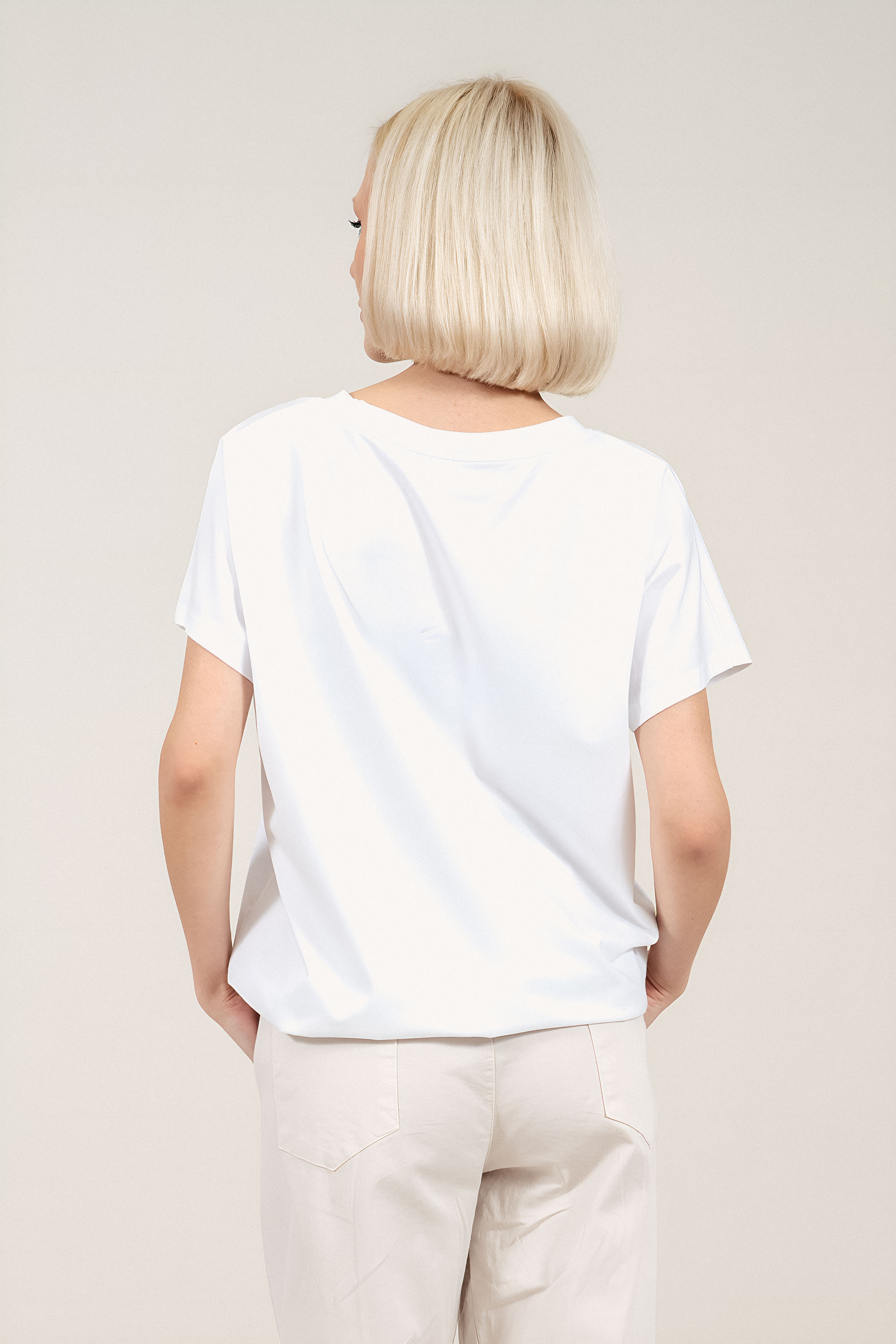 Свеж модел от памучно трико с лека еластичност, създаден за максимален комфорт през топлите дни. Правата кройка пада свободно по тялото и позволява лесно комбиниране с дънки, панталони или поли. Контрастната зелена щампа добавя характер и подчертава индивидуалния стил. Италианското производство гарантира внимание към детайла и устойчиво качество.