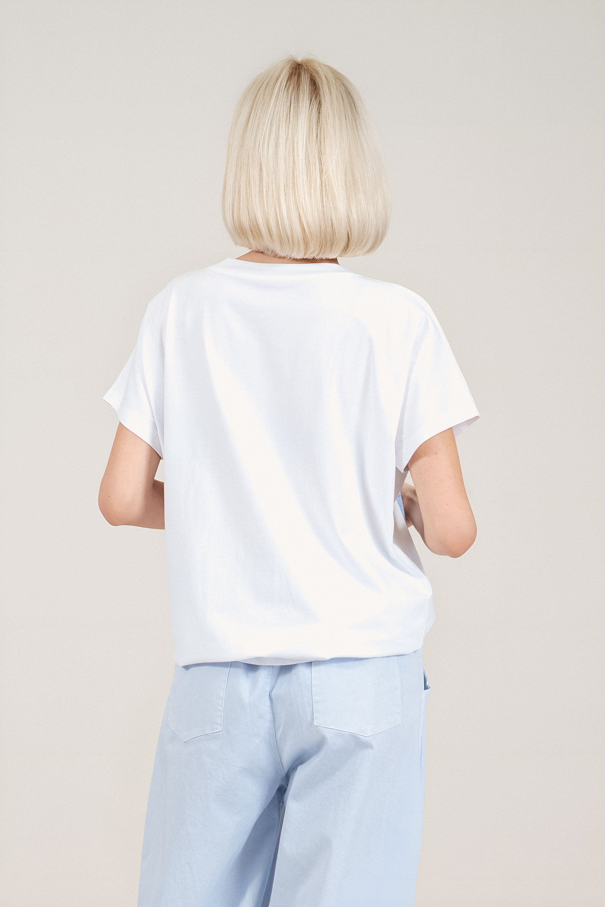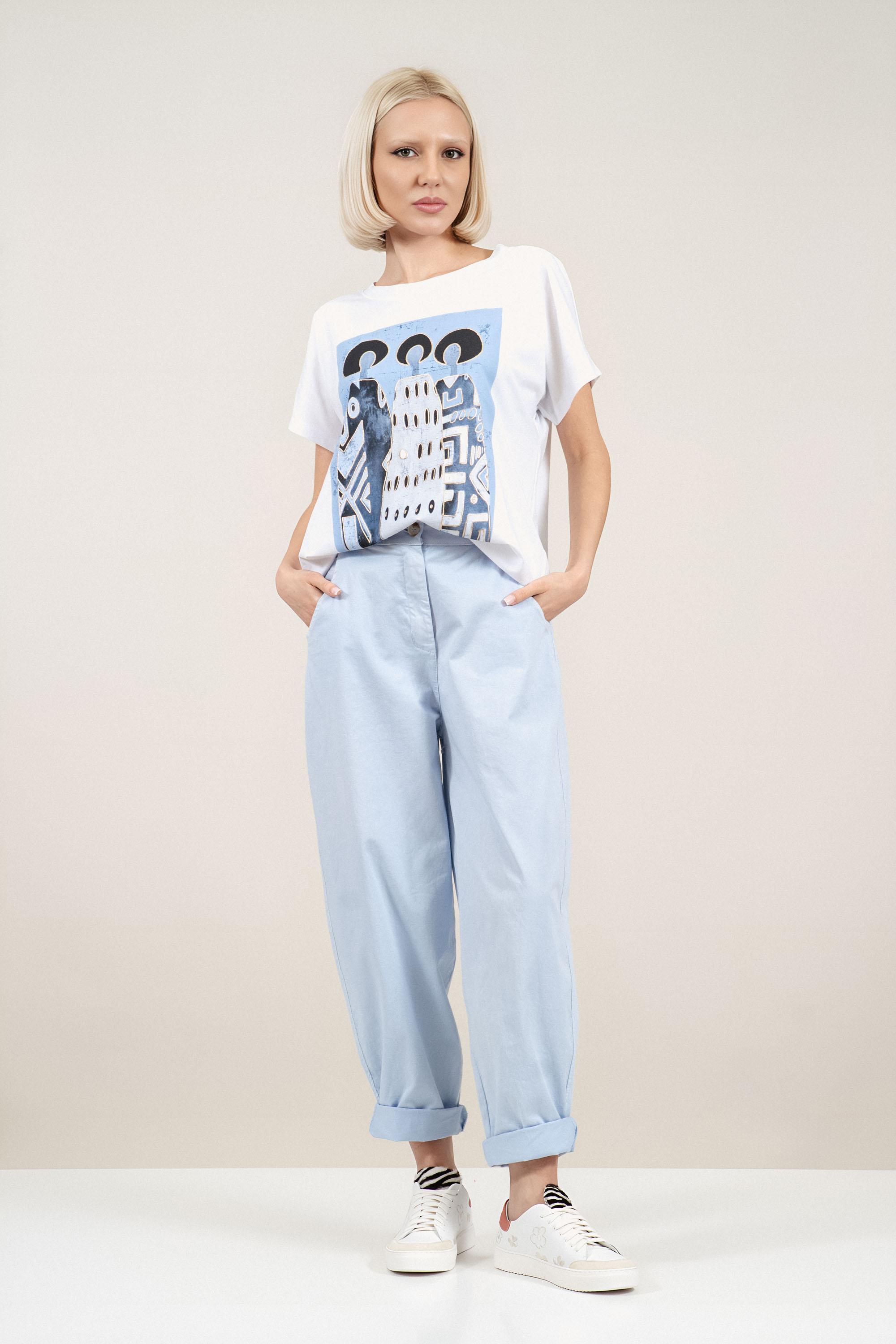 Свеж модел от памучно трико с лека еластичност, създаден за максимален комфорт през топлите дни. Правата кройка пада свободно по тялото и позволява лесно комбиниране с дънки, панталони или поли. Контрастната синя щампа добавя характер и подчертава индивидуалния стил. Италианското производство гарантира внимание към детайла и устойчиво качество.