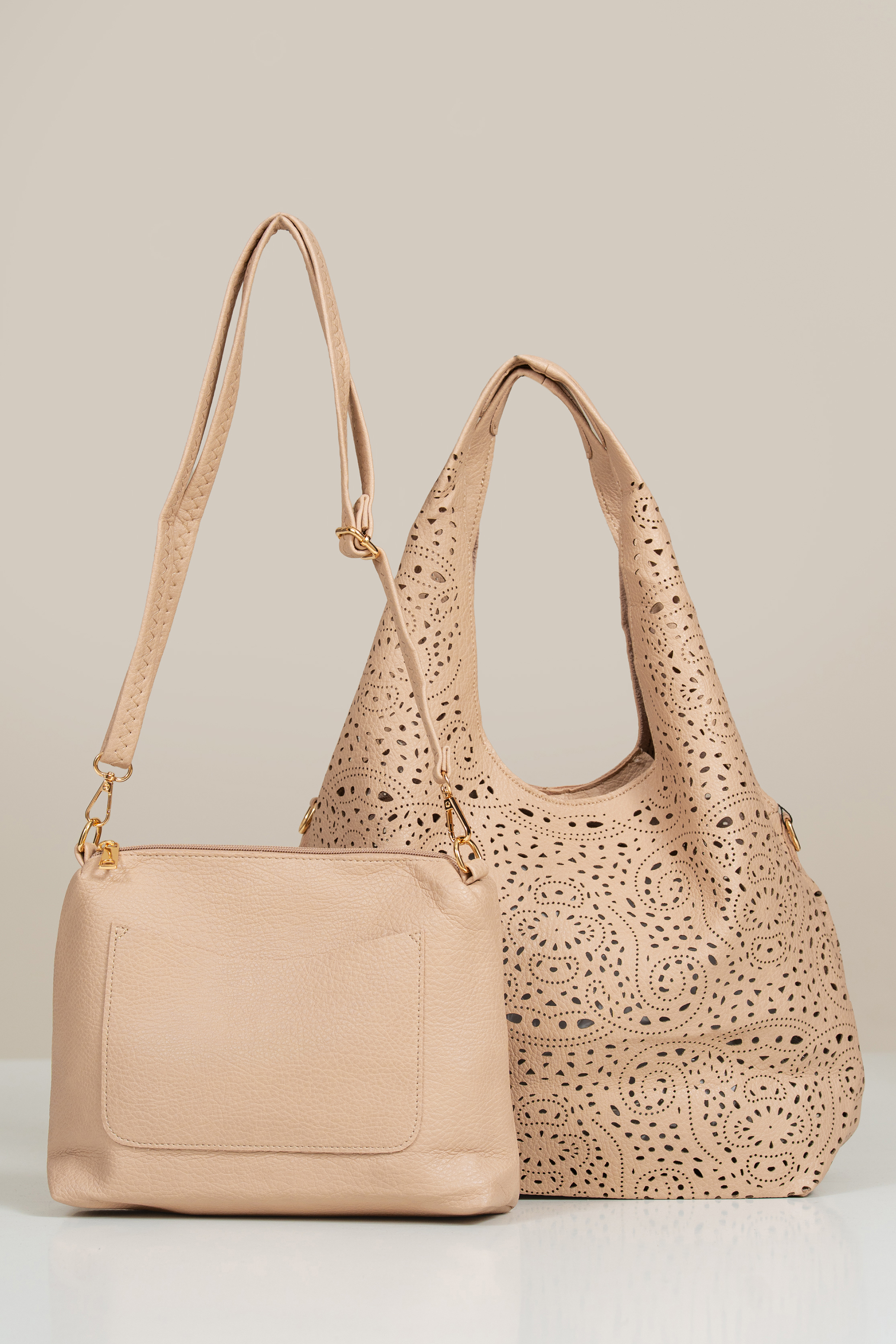 Моделът впечатлява с модерен перфориран дизайн и свеж бежов нюанс, подходящ за пролетно-летния сезон. Конструкцията 2 в 1 осигурява практичност и гъвкавост – вътрешната чанта може да се използва самостоятелно. Материята е устойчива, лека и лесна за поддръжка, което я прави удобен избор за ежедневието. Перфорацията придава лекота и женствен акцент към визията.