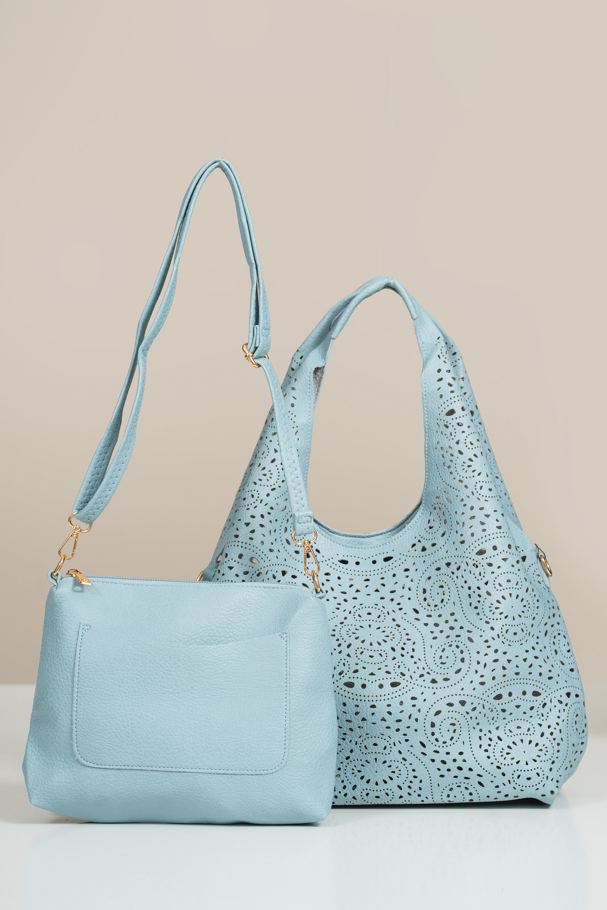 Моделът впечатлява с модерен перфориран дизайн и свеж син нюанс, подходящ за пролетно-летния сезон. Конструкцията 2 в 1 осигурява практичност и гъвкавост – вътрешната чанта може да се използва самостоятелно. Материята е устойчива, лека и лесна за поддръжка, което я прави удобен избор за ежедневието. Перфорацията придава лекота и женствен акцент към визията.