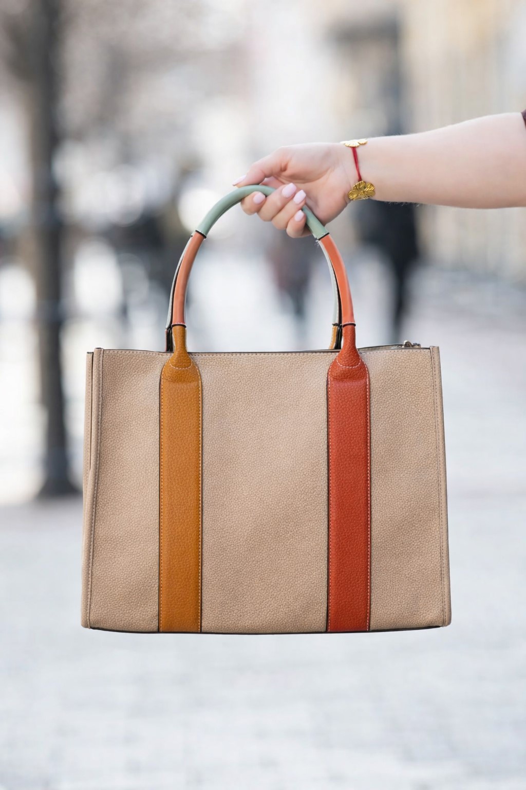 Дамска чанта от еко кожа в цвят бежово капучино с вертикални цветни ленти и къси дръжки