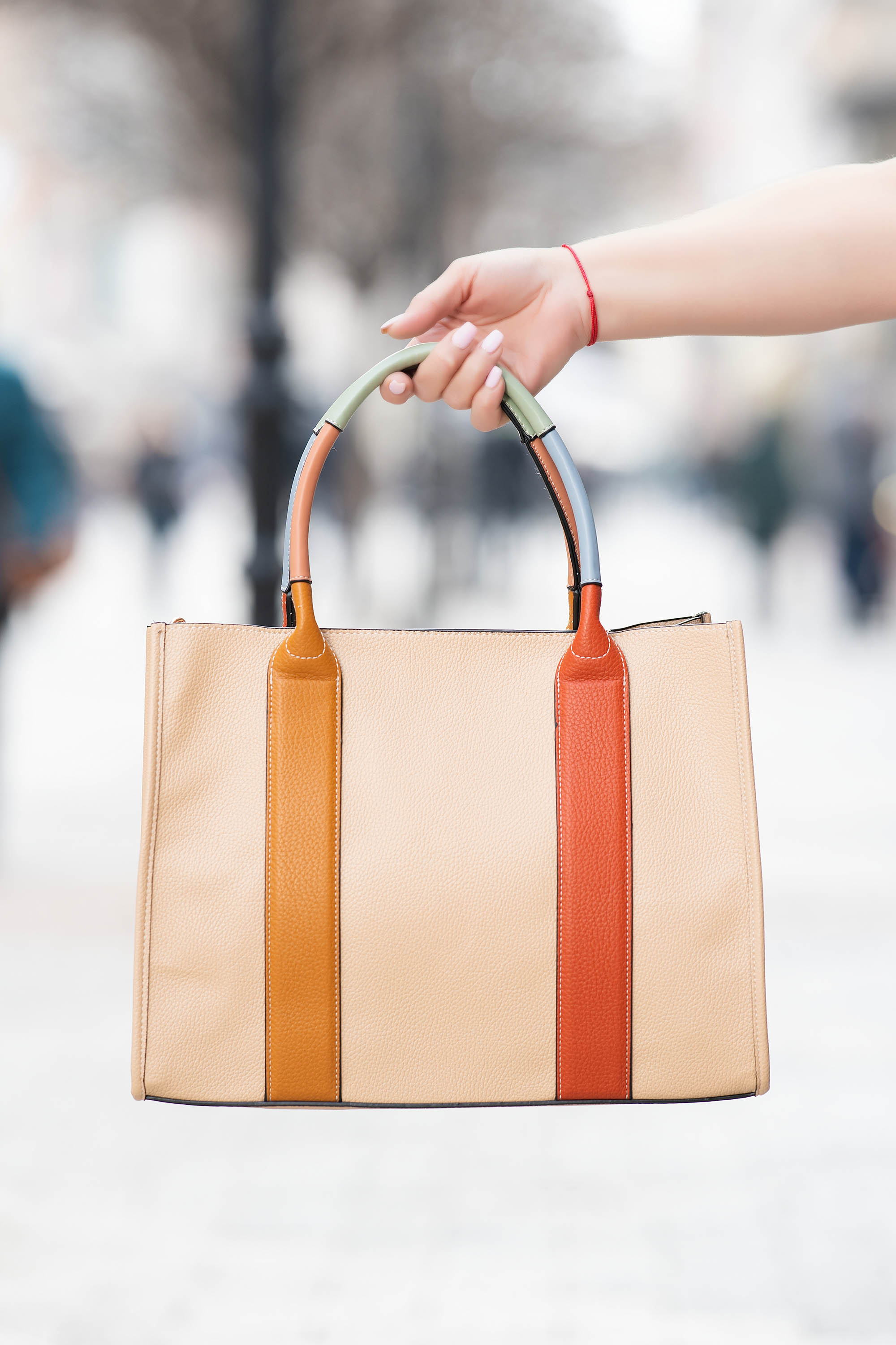 Дамска чанта от еко кожа в светлобежово с вертикални цветни ленти и къси дръжки