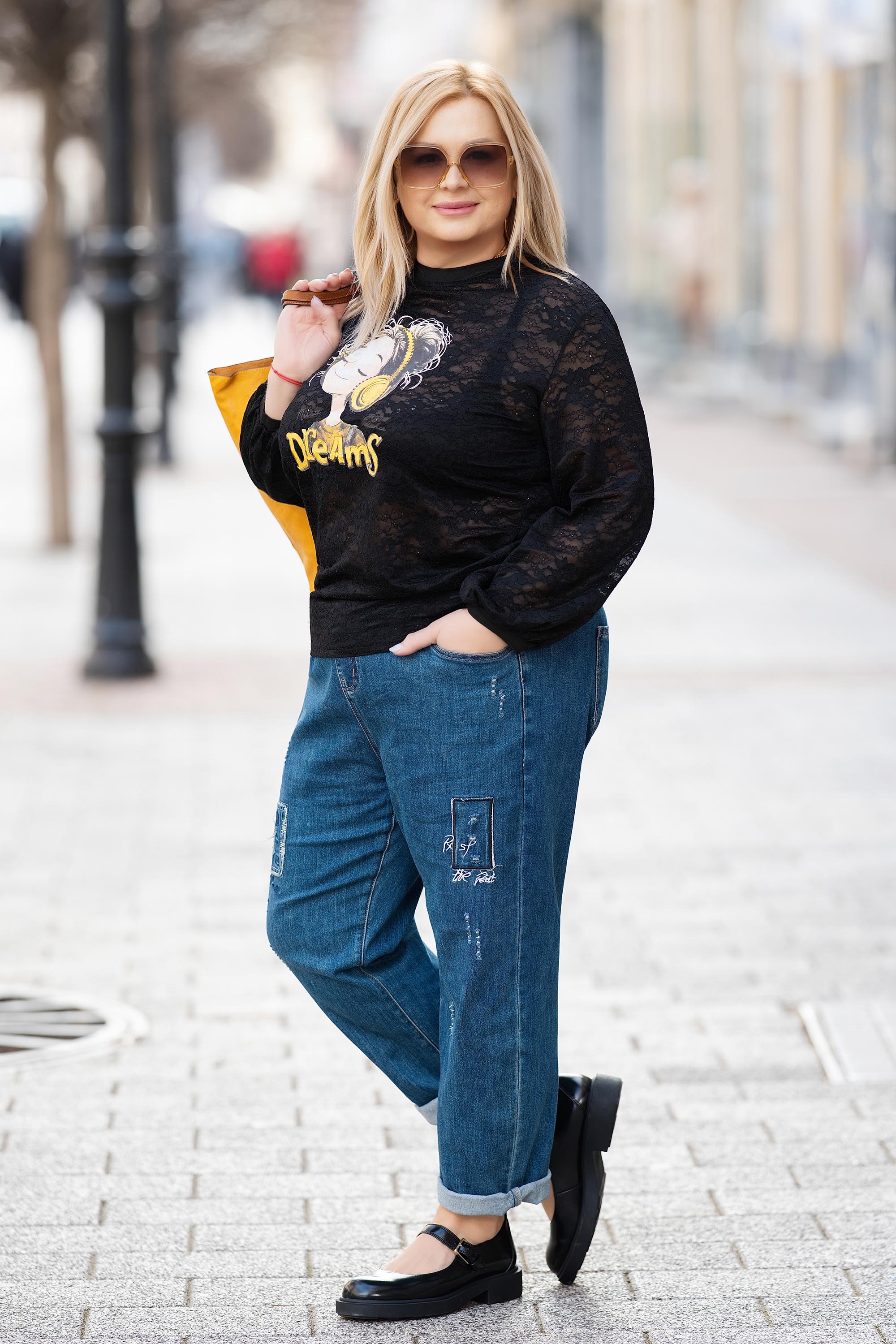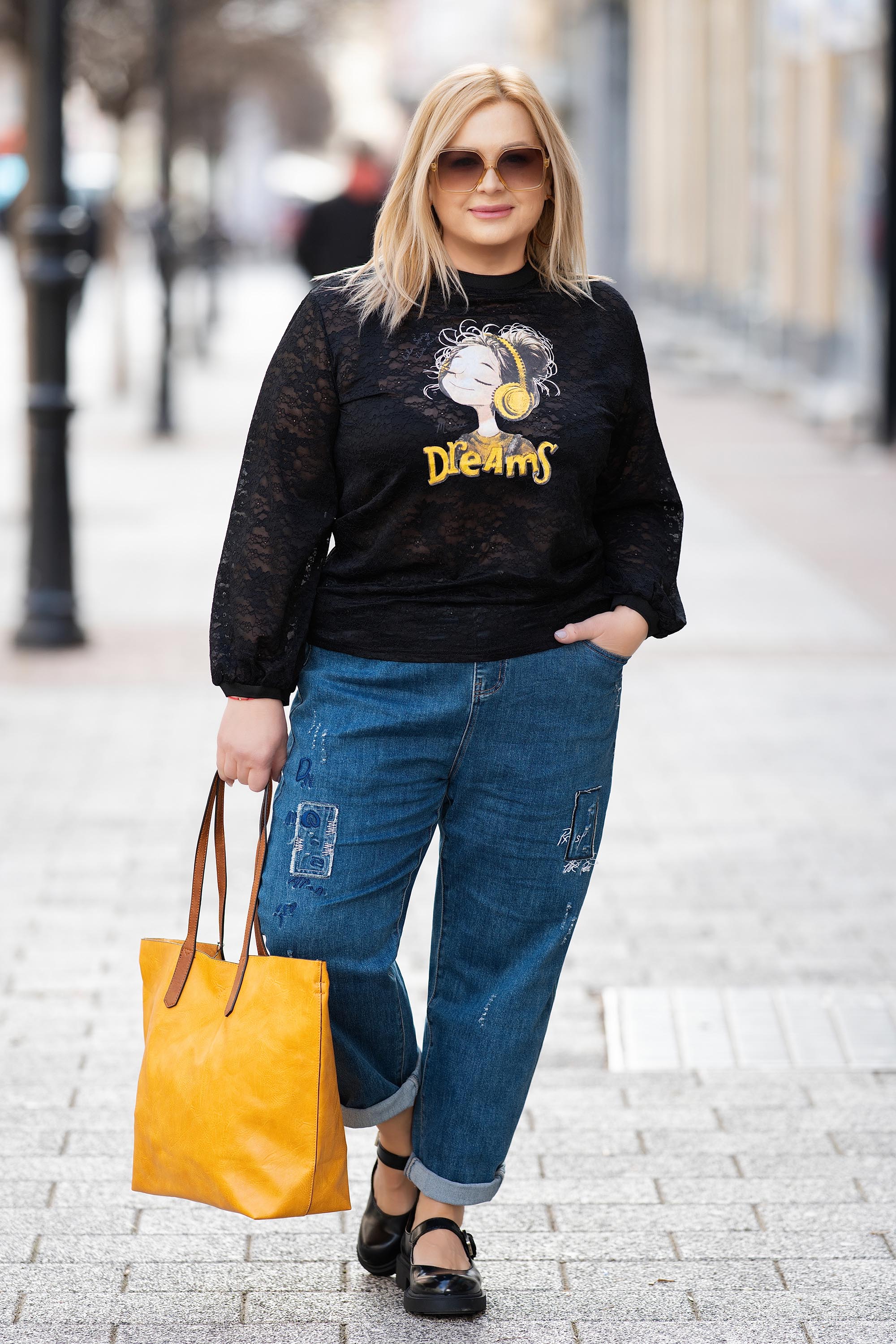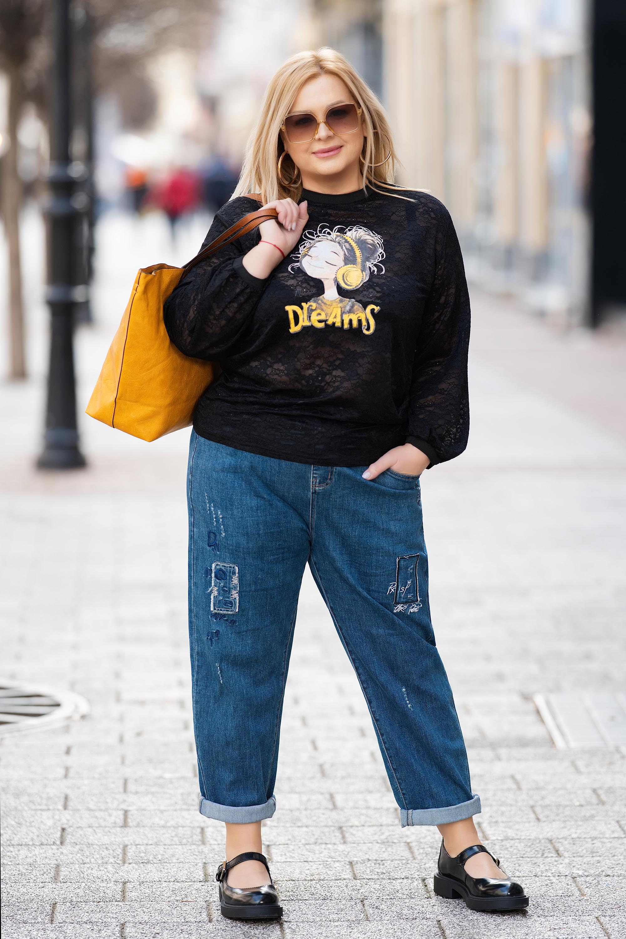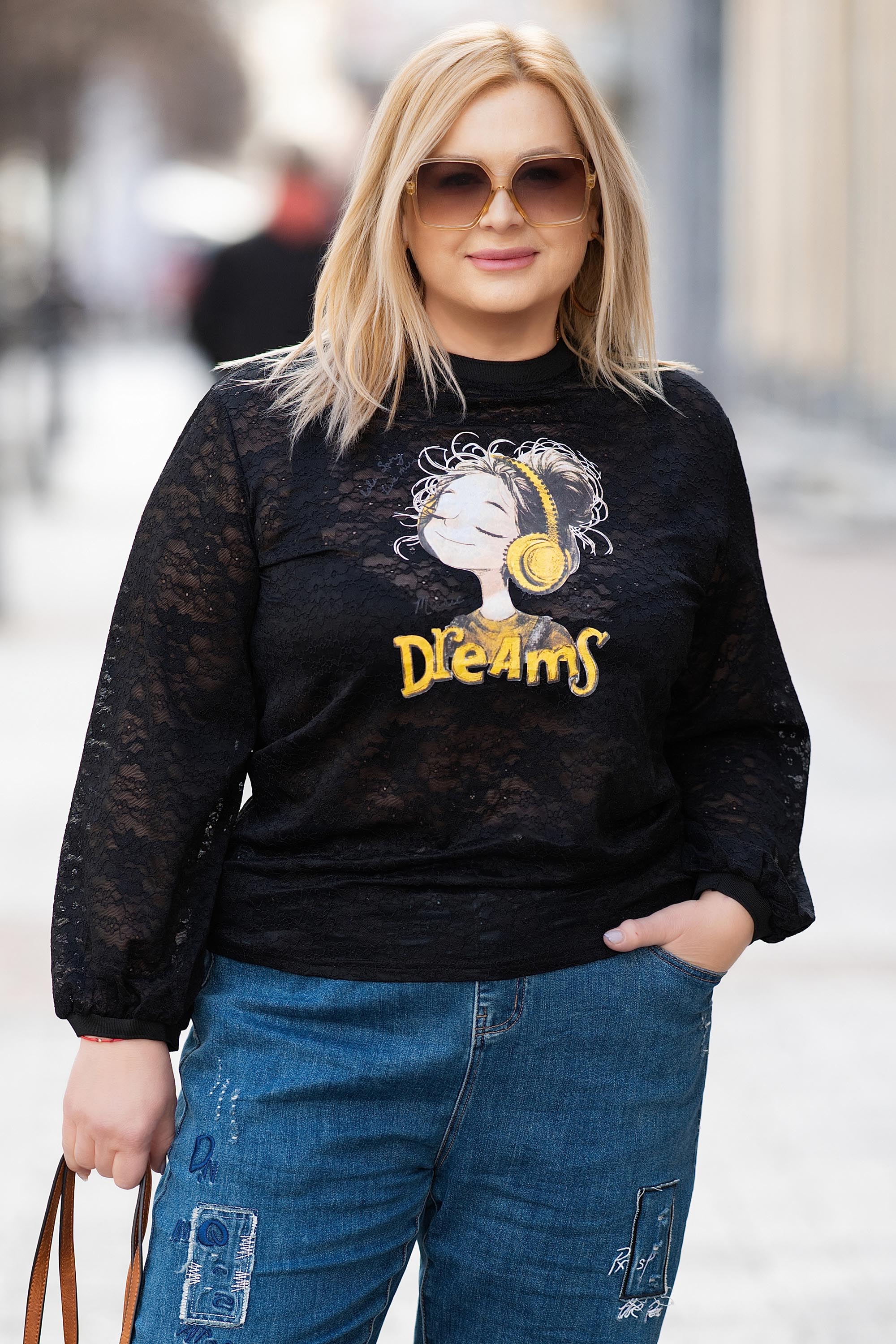 Дамска черна блуза от дантелена мрежа с щампа момиче и надпис