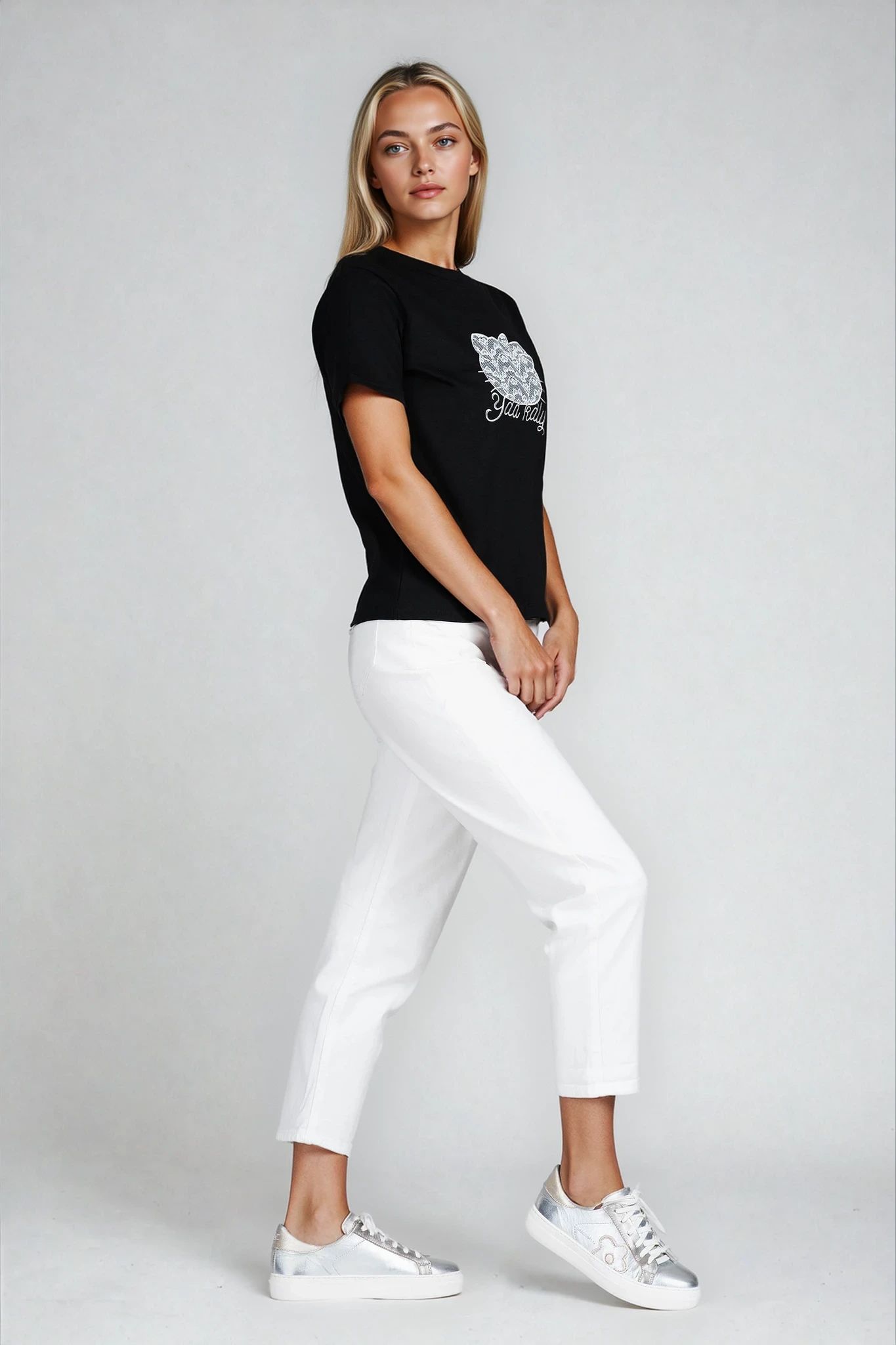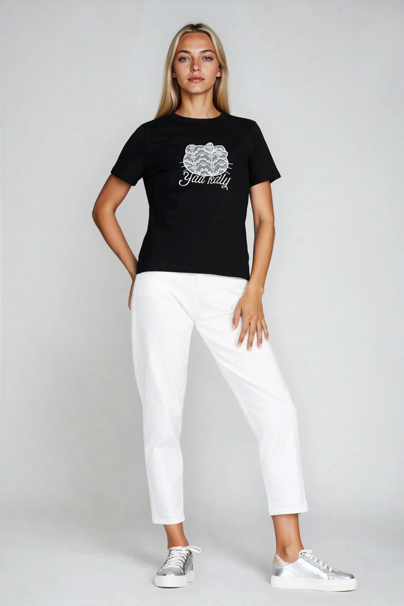 Тази тениска в класическо черно впечатлява с деликатна бродерия на коте с панделка и надпис. Изработена от памучна материя с еластичност, тя приляга комфортно по тялото, без да ограничава движенията. Облото деколте и изчистената кройка я правят лесна за съчетаване с дънки, поли или спортни панталони.