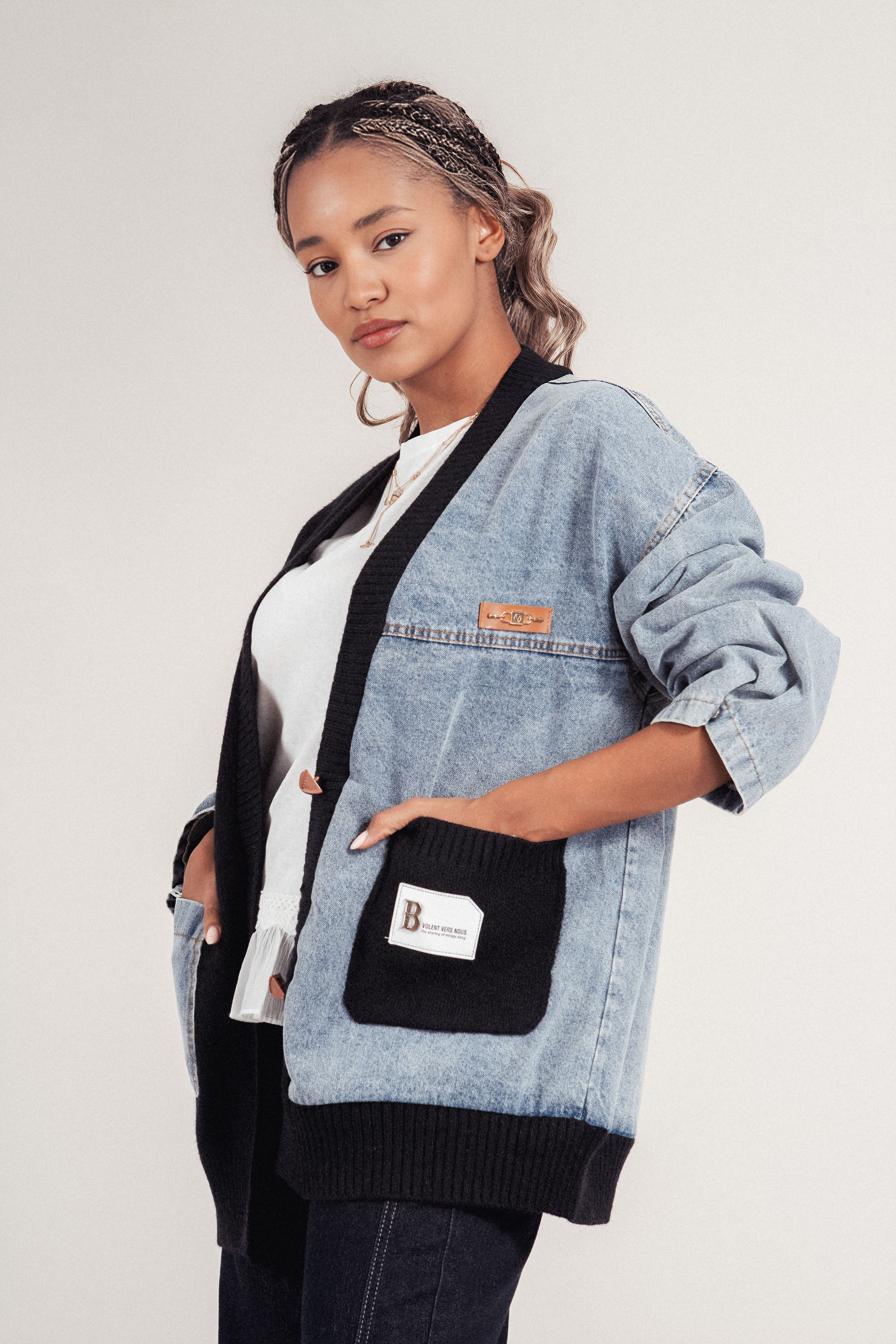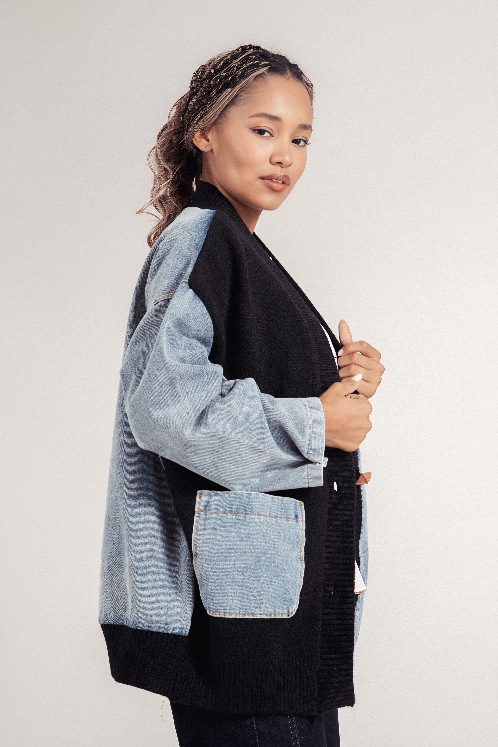 Стилна и функционална жилетка, съчетаваща деним в светлосиньо с черни плетени елементи. Акцентите включват декоративна кожена емблема и контрастни джобове с надпис. Моделът е без яка, с прав силует и меко усещане при носене. Подходяща за ежедневен градски стил или неформални събития.