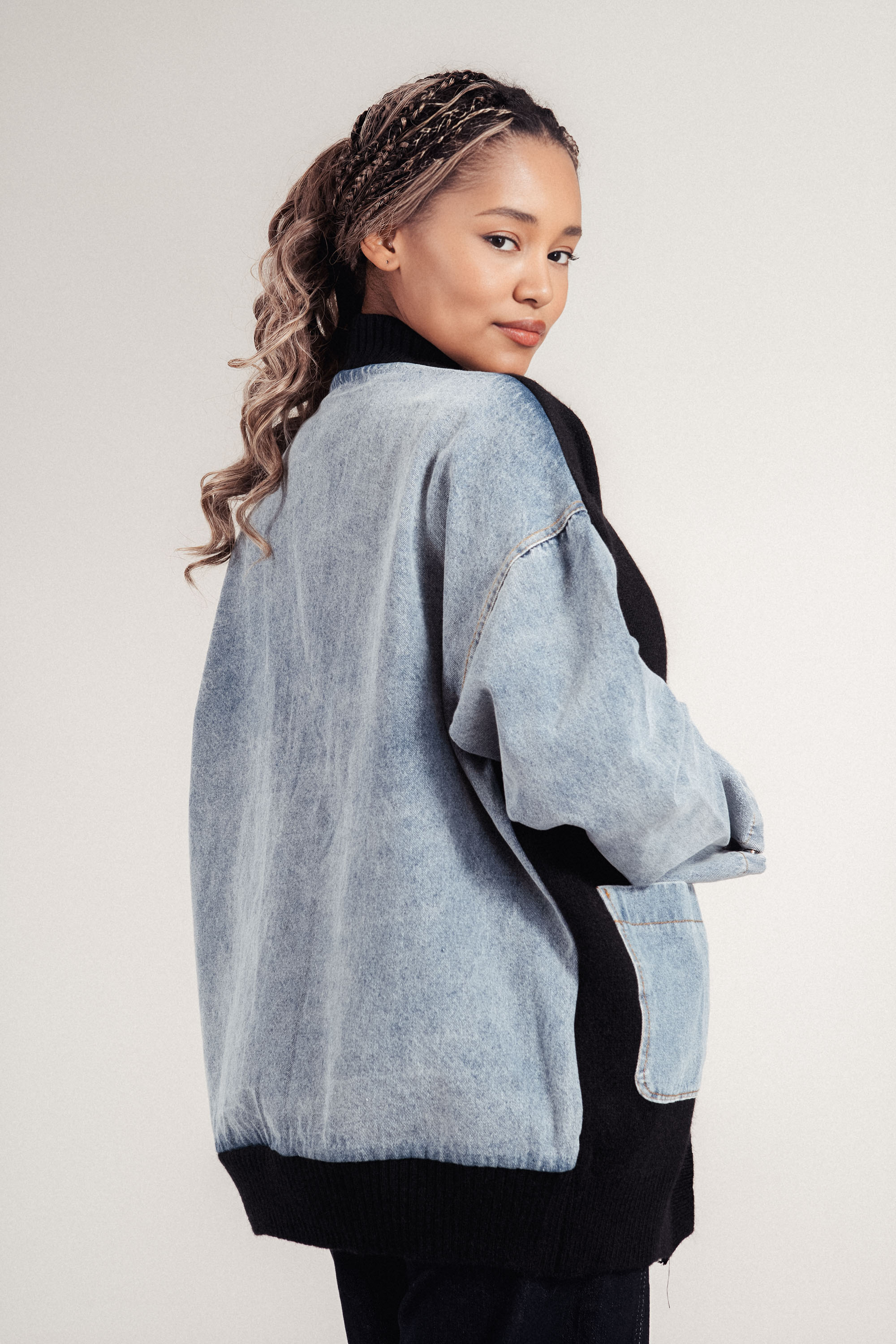 Дамска жилетка от деним и плетиво в синьо и черно с контрастни джобове