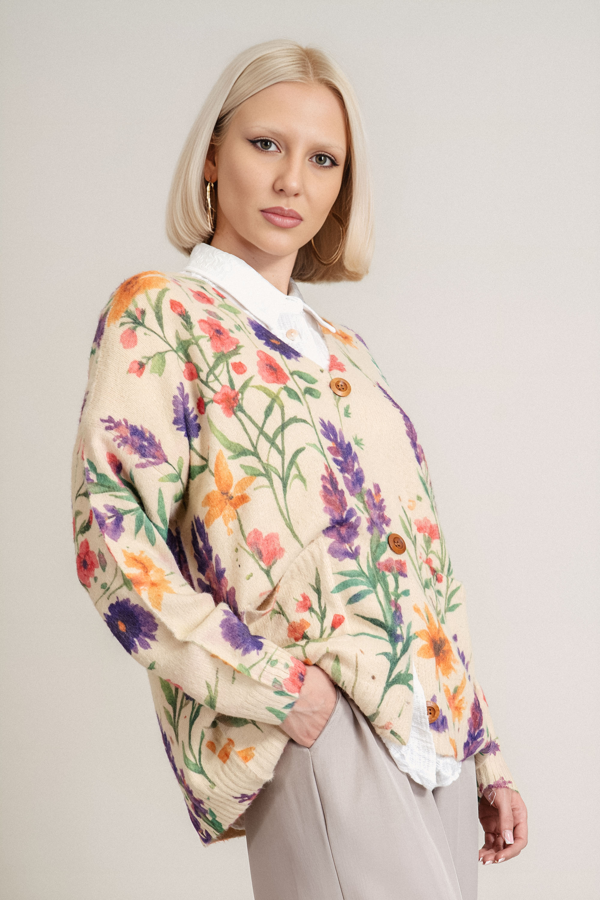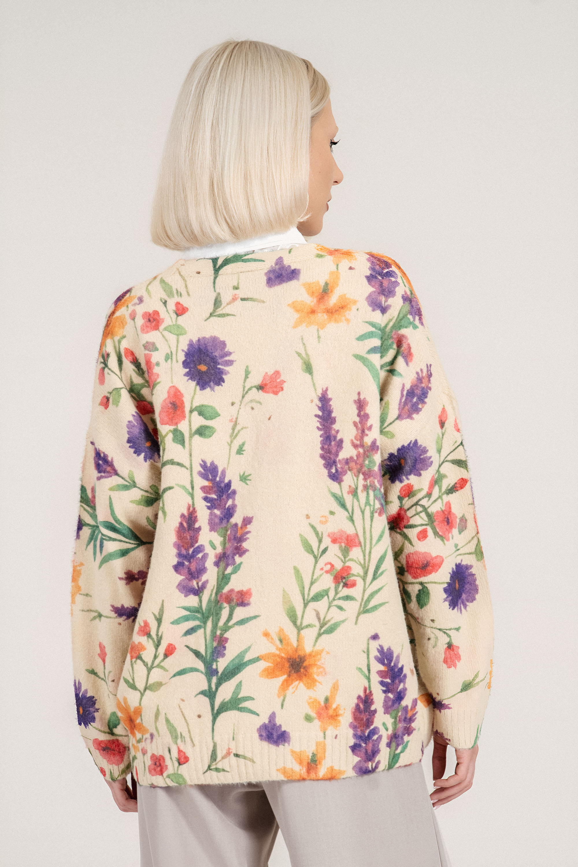 Елегантна жилетка от фино плетиво, която съчетава лекота и стил в ежедневната визия. Материята е мека, лека и устойчива на намачкване, което я прави практичен избор за динамичното ежедневие. Моделът е с остро деколте и закопчаване с копчета, а деликатният принт в розово, лилаво и оранжево добавя свеж цветен акцент към бежовата основа. Подходяща е както за офис комбинации, така и за по-непринудени визии с дънки или панталон.