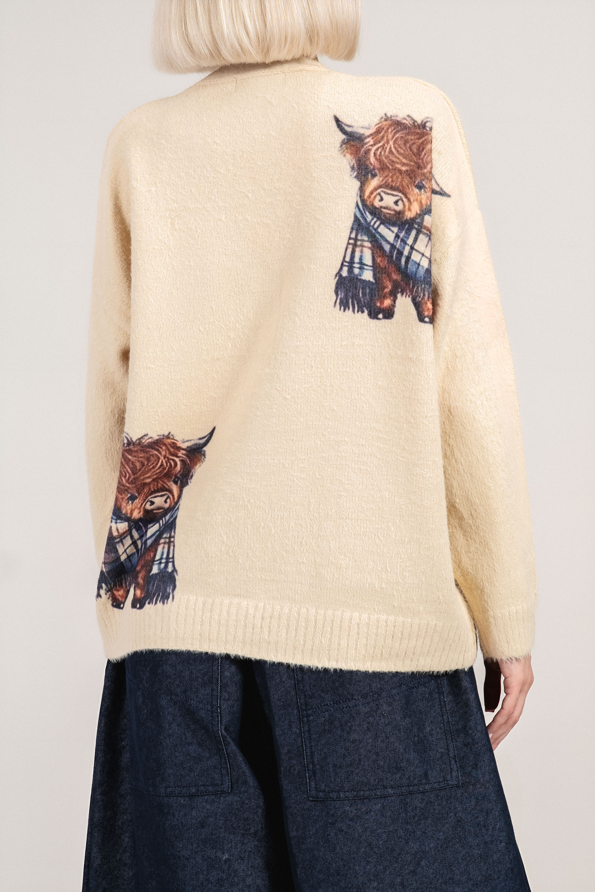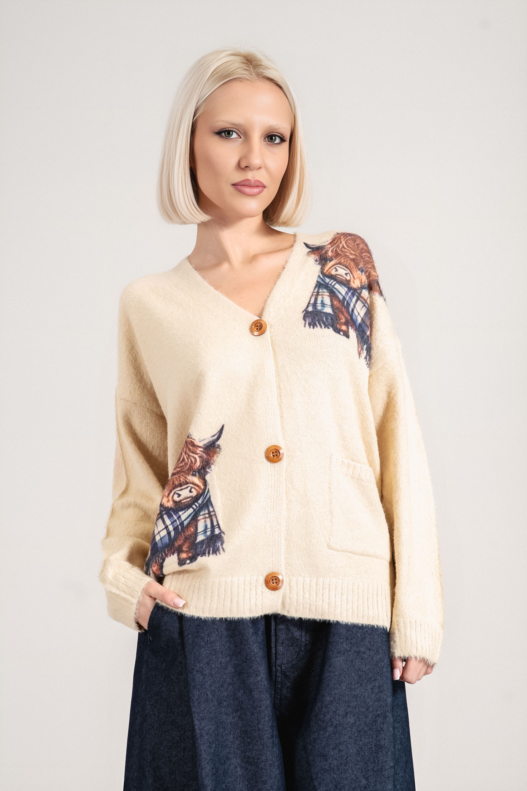 Изразителна жилетка с животински принт, който създава усещане за топлина и уют. Изработена от фино плетиво, моделът е с класическо остро деколте, дълги ръкави и копчета в дървесен ефект. Tази жилетка съчетава комфорт и стил в едно. Идеален избор за ежедневна визия с характер.