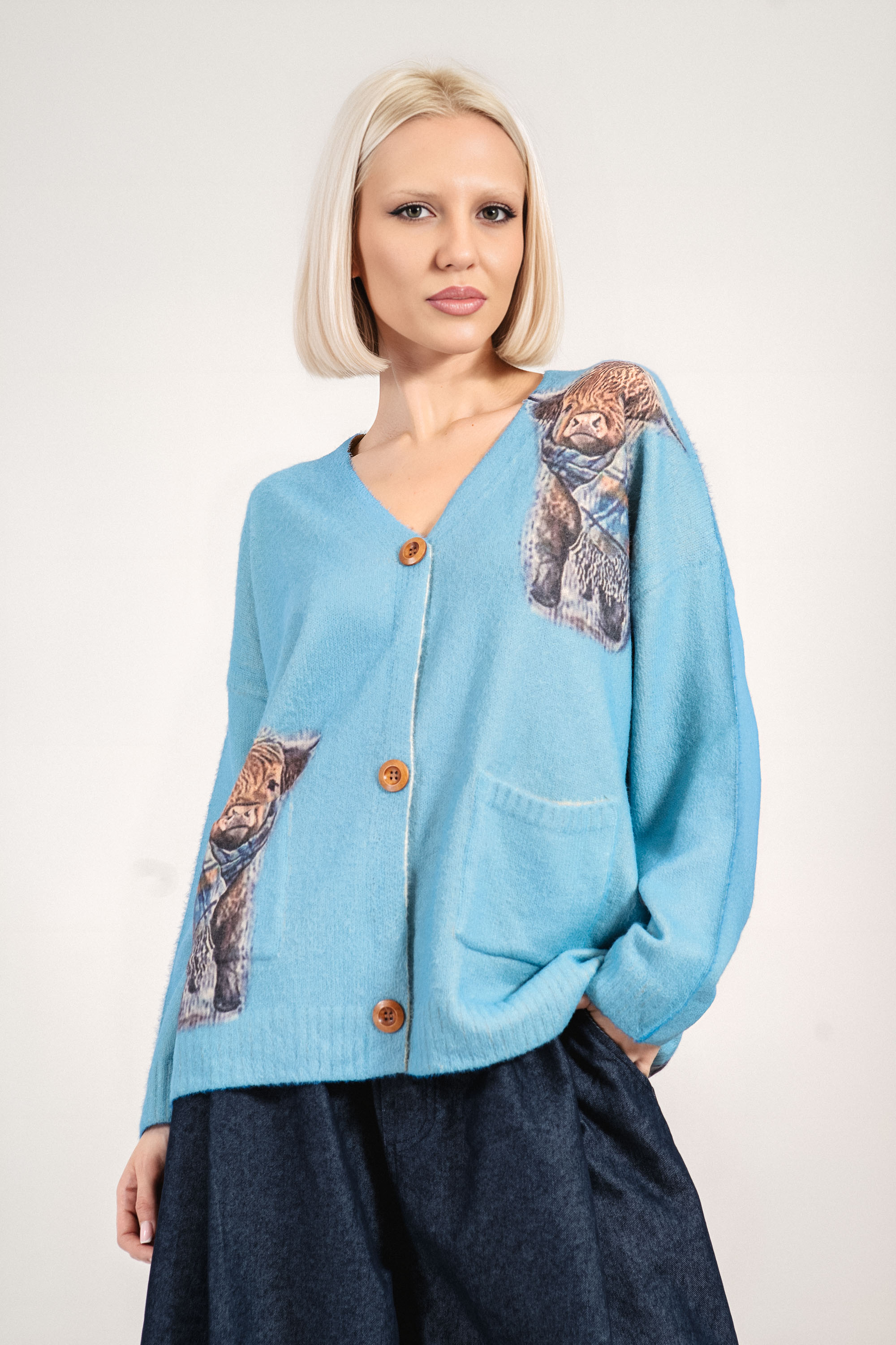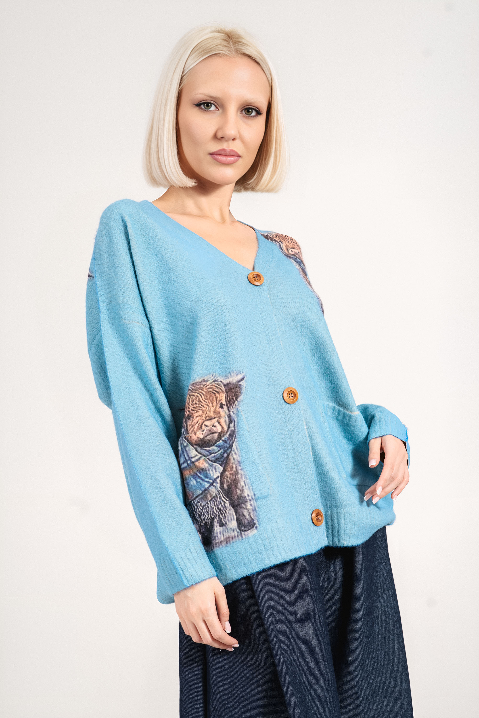 Изразителна жилетка с животински принт, който създава усещане за топлина и уют. Изработена от фино плетиво, моделът е с класическо остро деколте, дълги ръкави и копчета в дървесен ефект. Tази жилетка съчетава комфорт и стил в едно. Идеален избор за ежедневна визия с характер.
