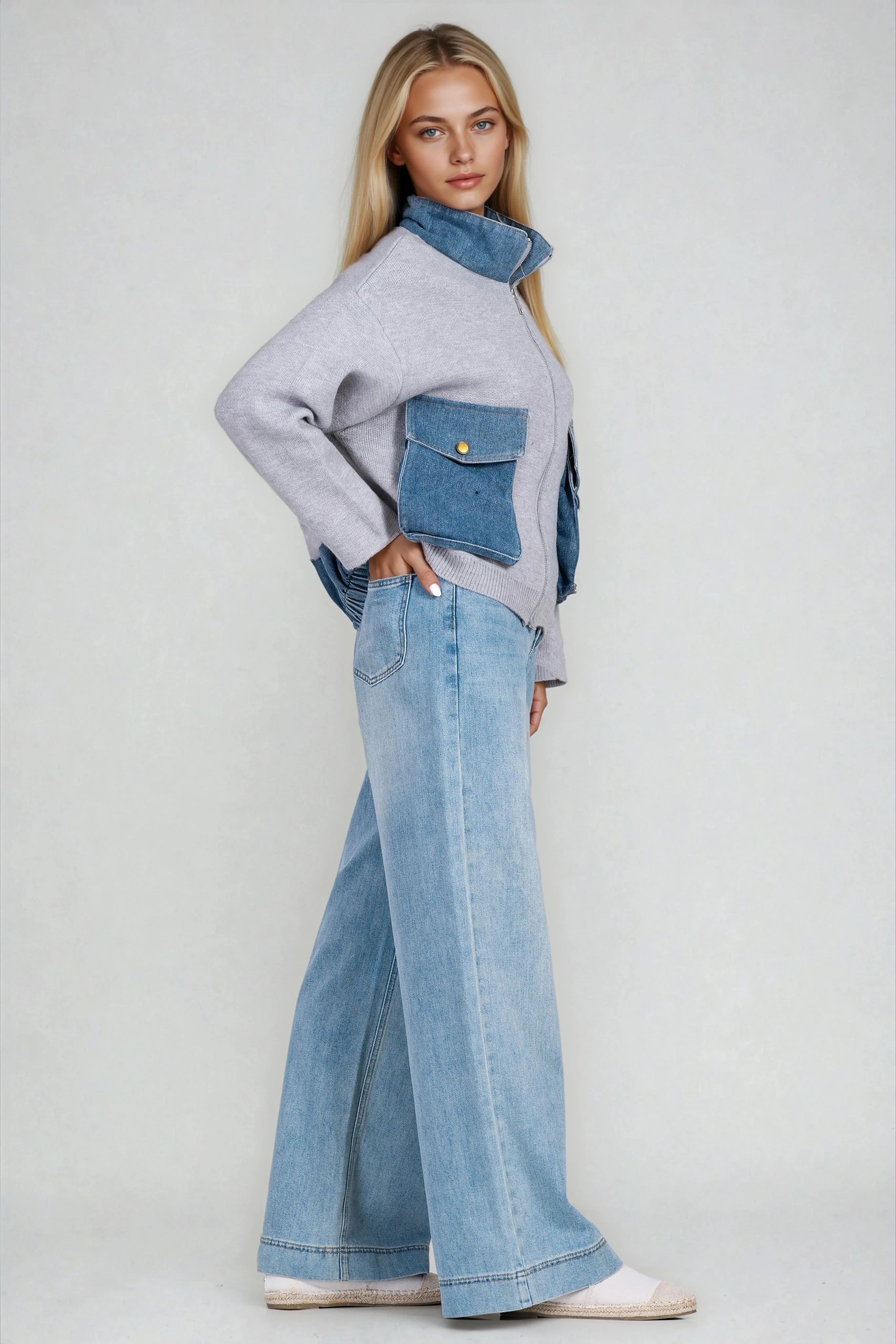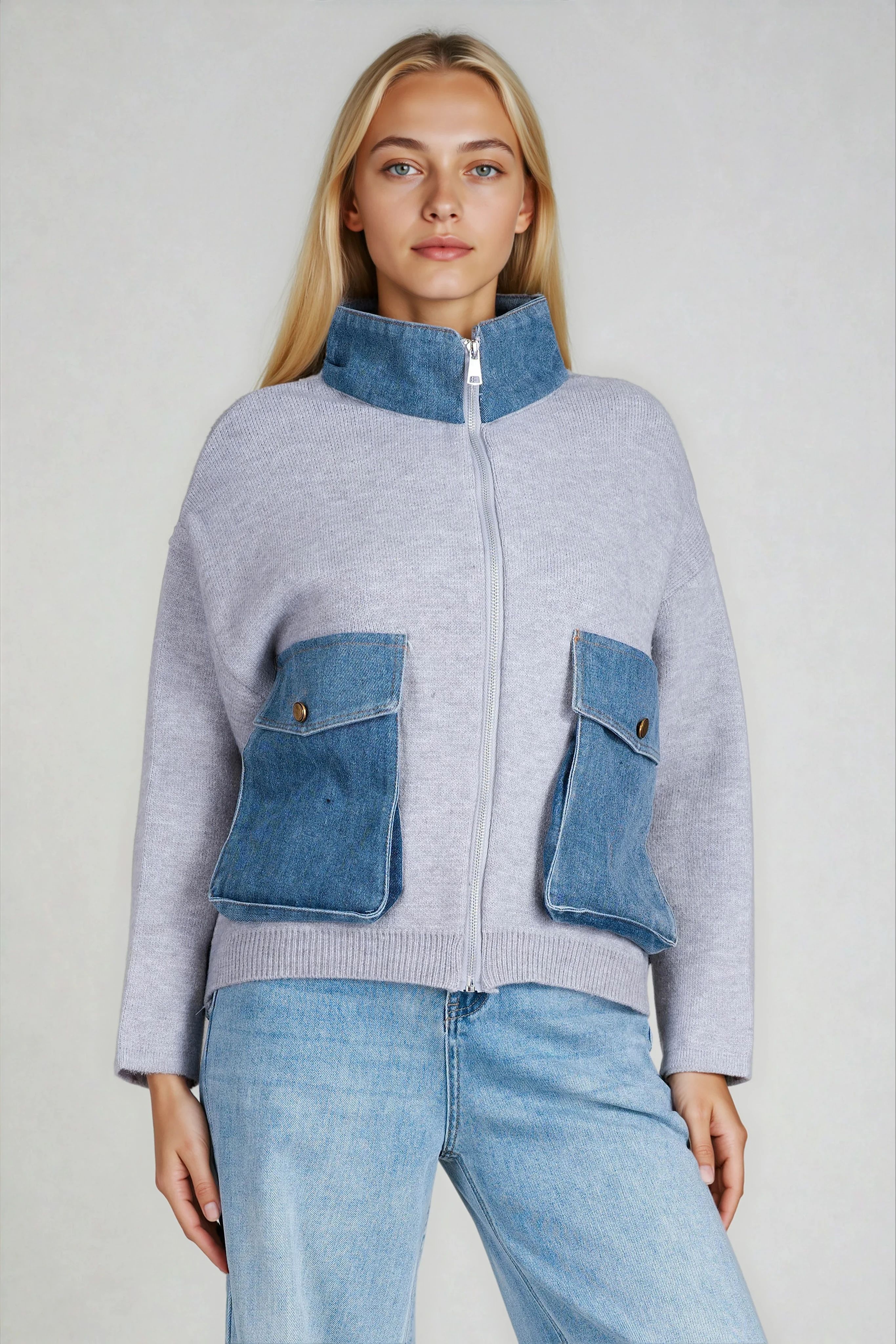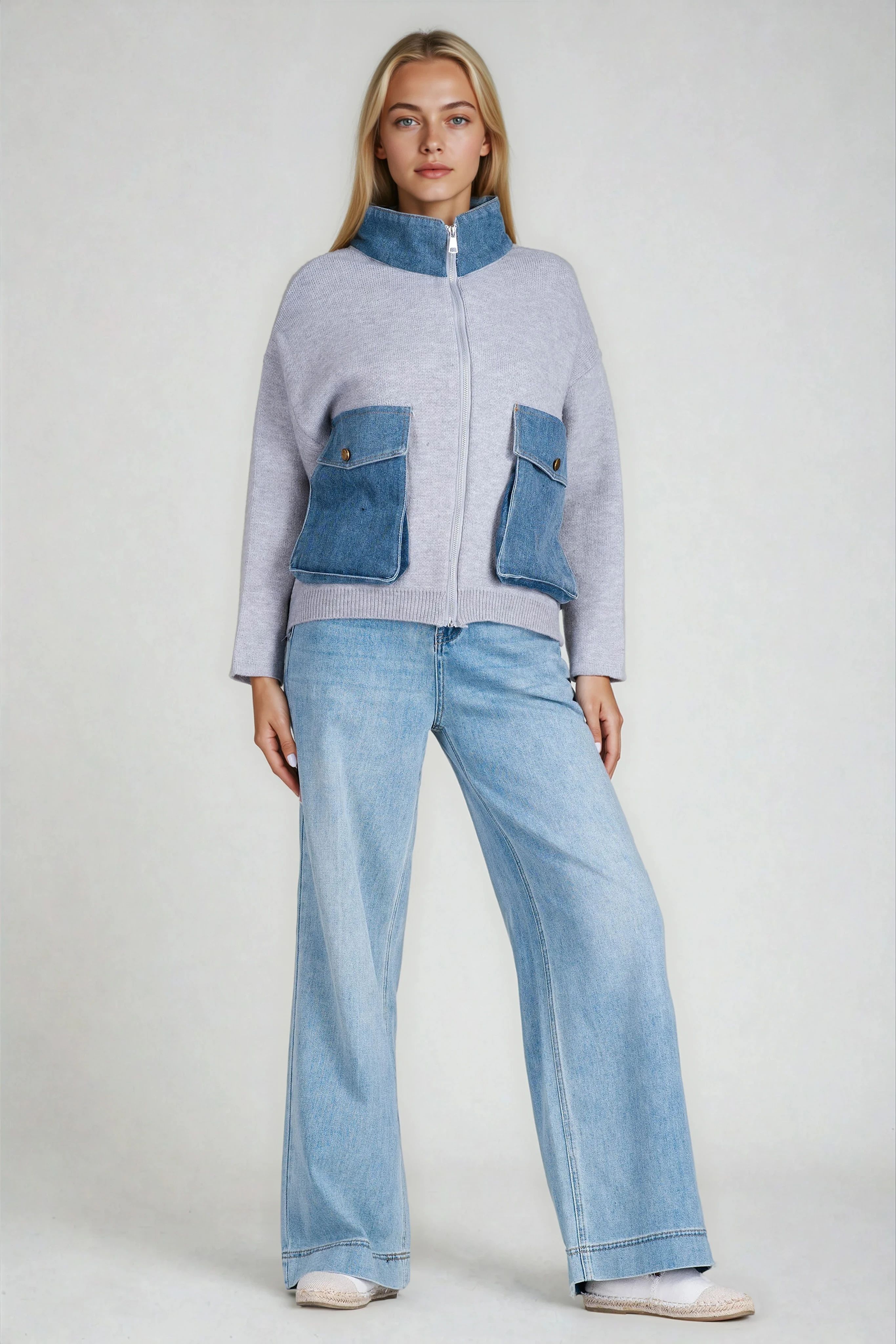 Тази жилетка съчетава елегантност и уличен стил чрез комбинацията от меко плетиво и акценти от деним. Двата джоба с капак в контрастно синьо и дънковата яка придават модерна визия, подходяща за преходния сезон. Закопчаването с цип осигурява удобство и практичност при носене.