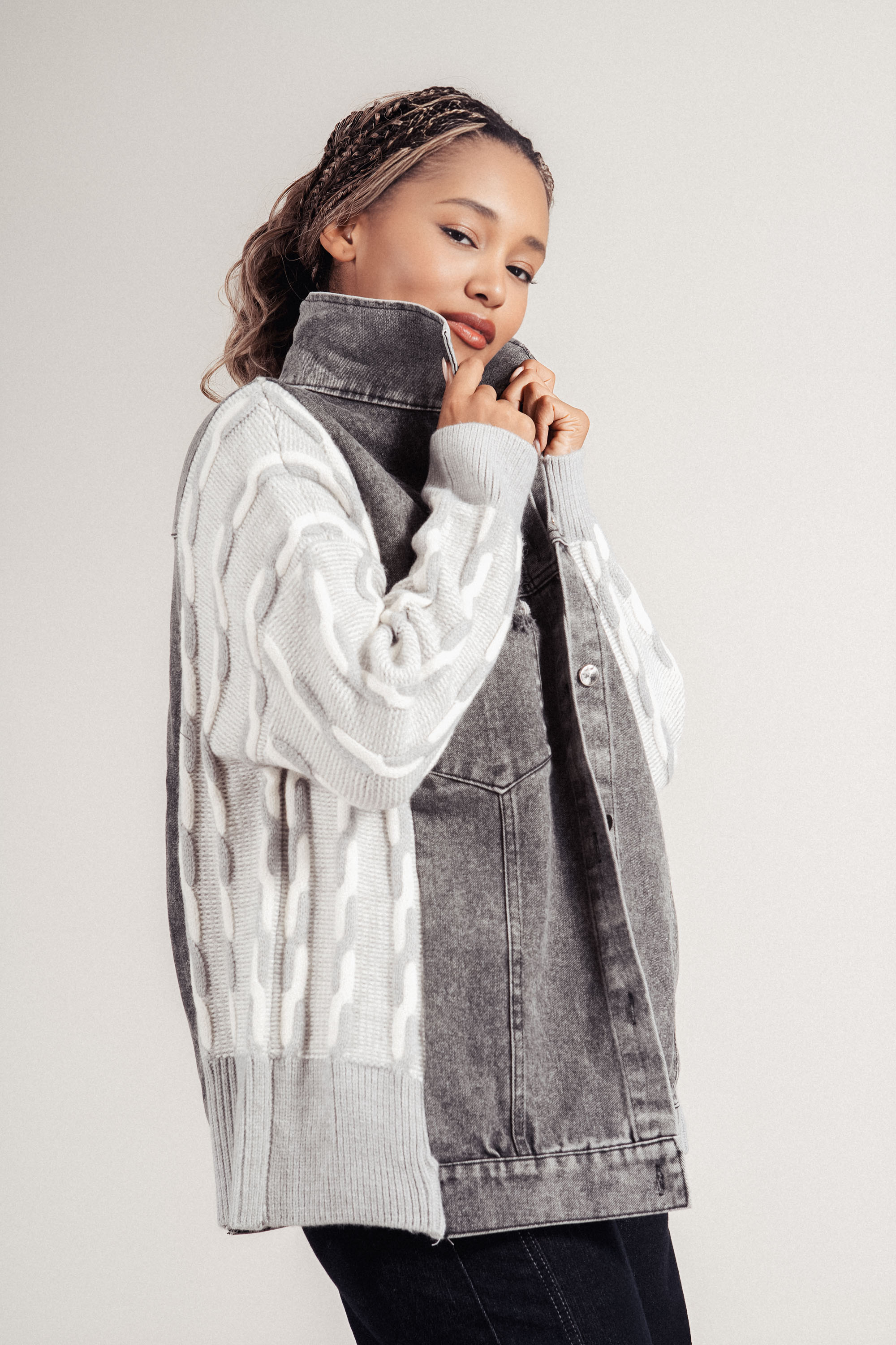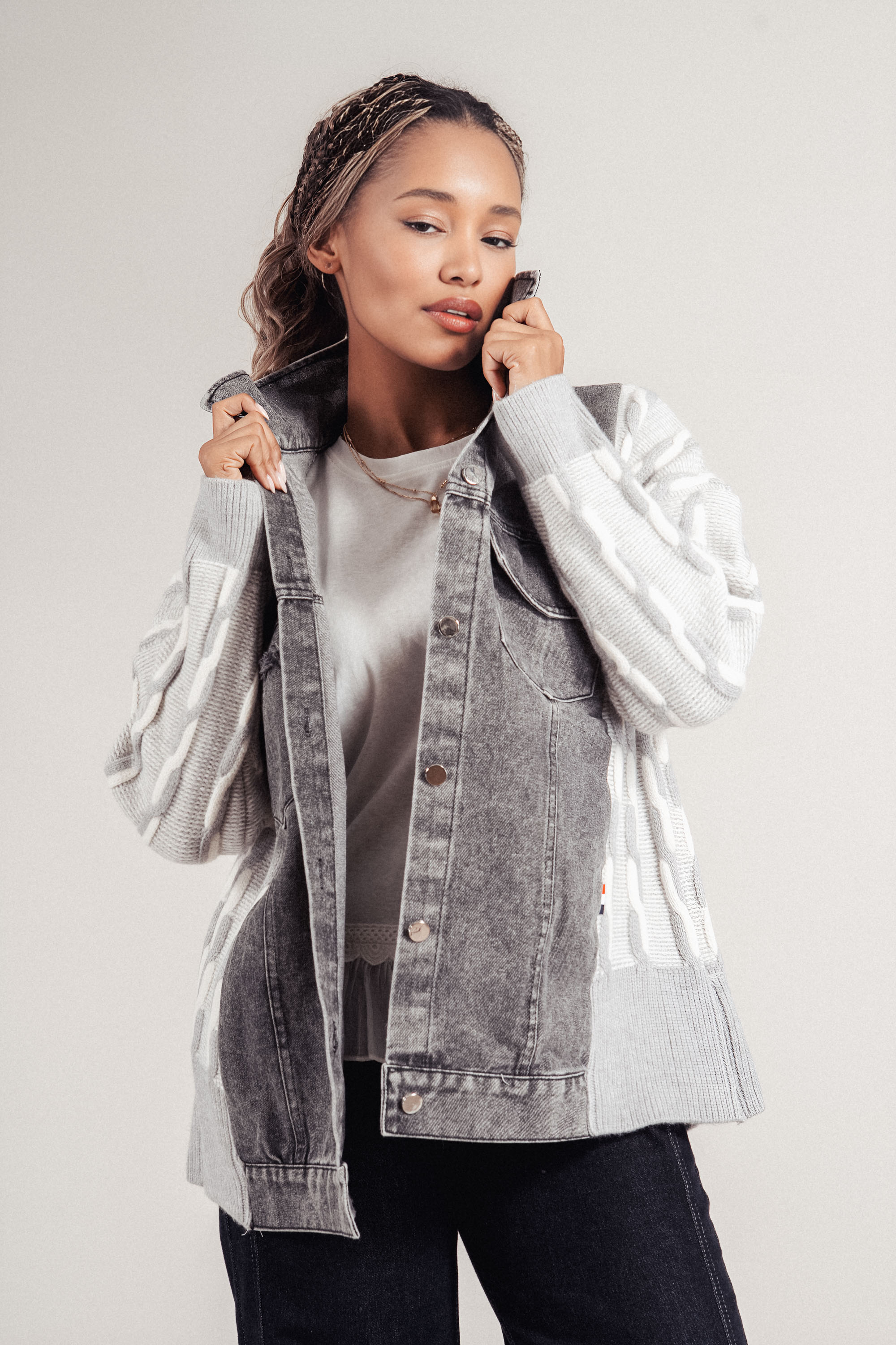 Атрактивна жилетка тип яке, комбинираща класически деним в сиво с меки плетени ръкави в бяло. Моделът е с яка, метални копчета и функционални джобове с капаци. Съчетава спортен стил и комфорт, подходящ за ежедневна градска визия.