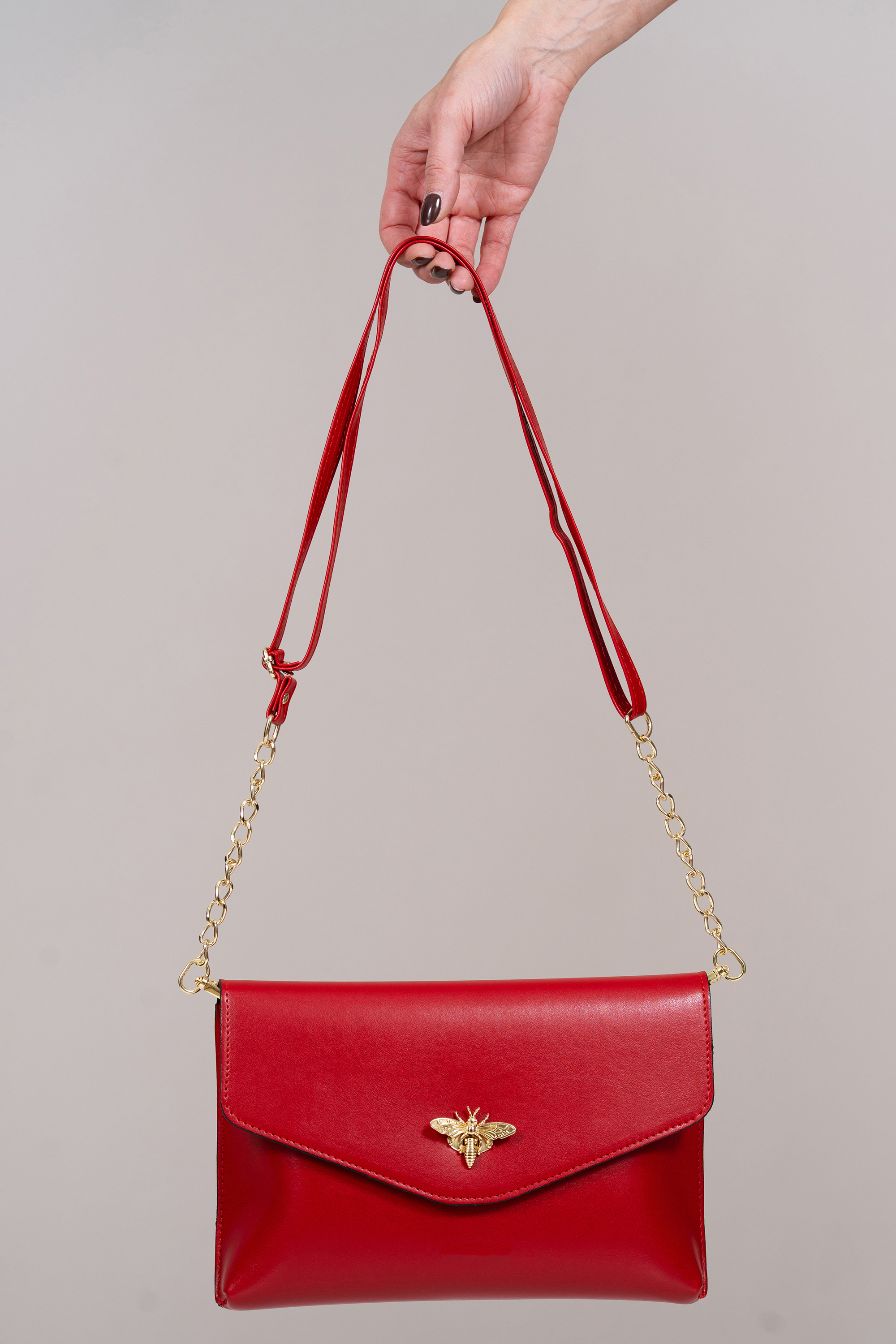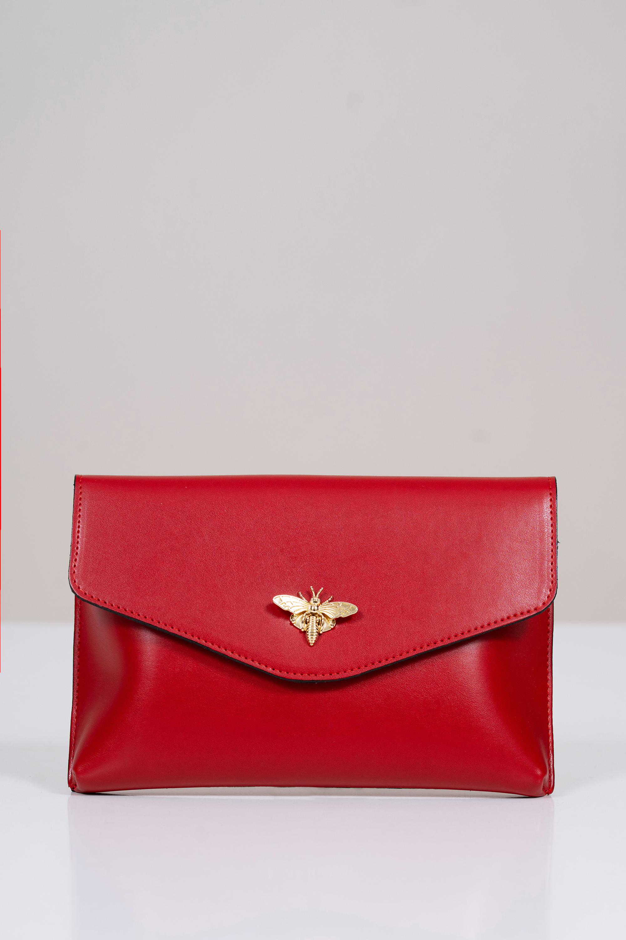 Стилна и женствена, тази чанта тип клъч от еко кожа в червен цвят е отличен избор за елегантни визии. Златистата закопчалка с пчела добавя изискан акцент, който придава индивидуалност и характер. Подходяща както за официални поводи, така и за ежедневна елегантност. Лекотата и класическият цвят я правят лесна за комбиниране.