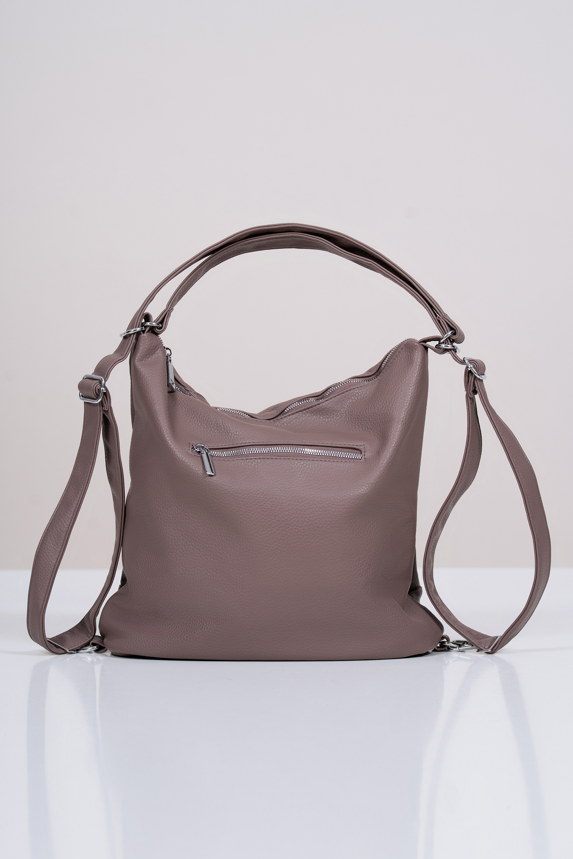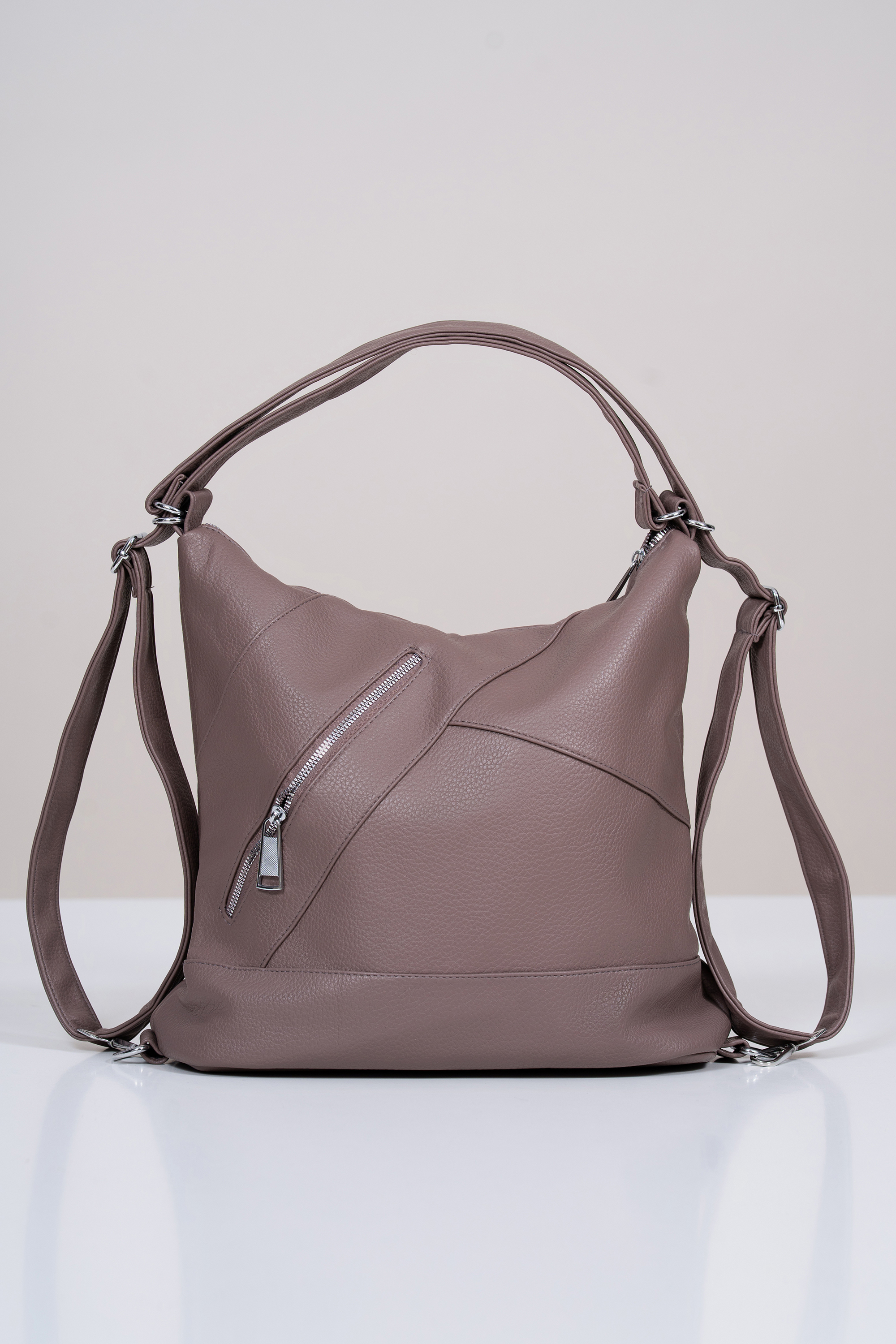 Практична и стилна, тази чанта тип торба е изработена от еко кожа с мека текстура в цвят капучино. Моделът впечатлява с функционалния си дизайн – може да се носи както на рамо, така и като раница. Сребристият диагонален цип придава модерен и динамичен акцент. Подходяща за ежедневна употреба и градски стил.