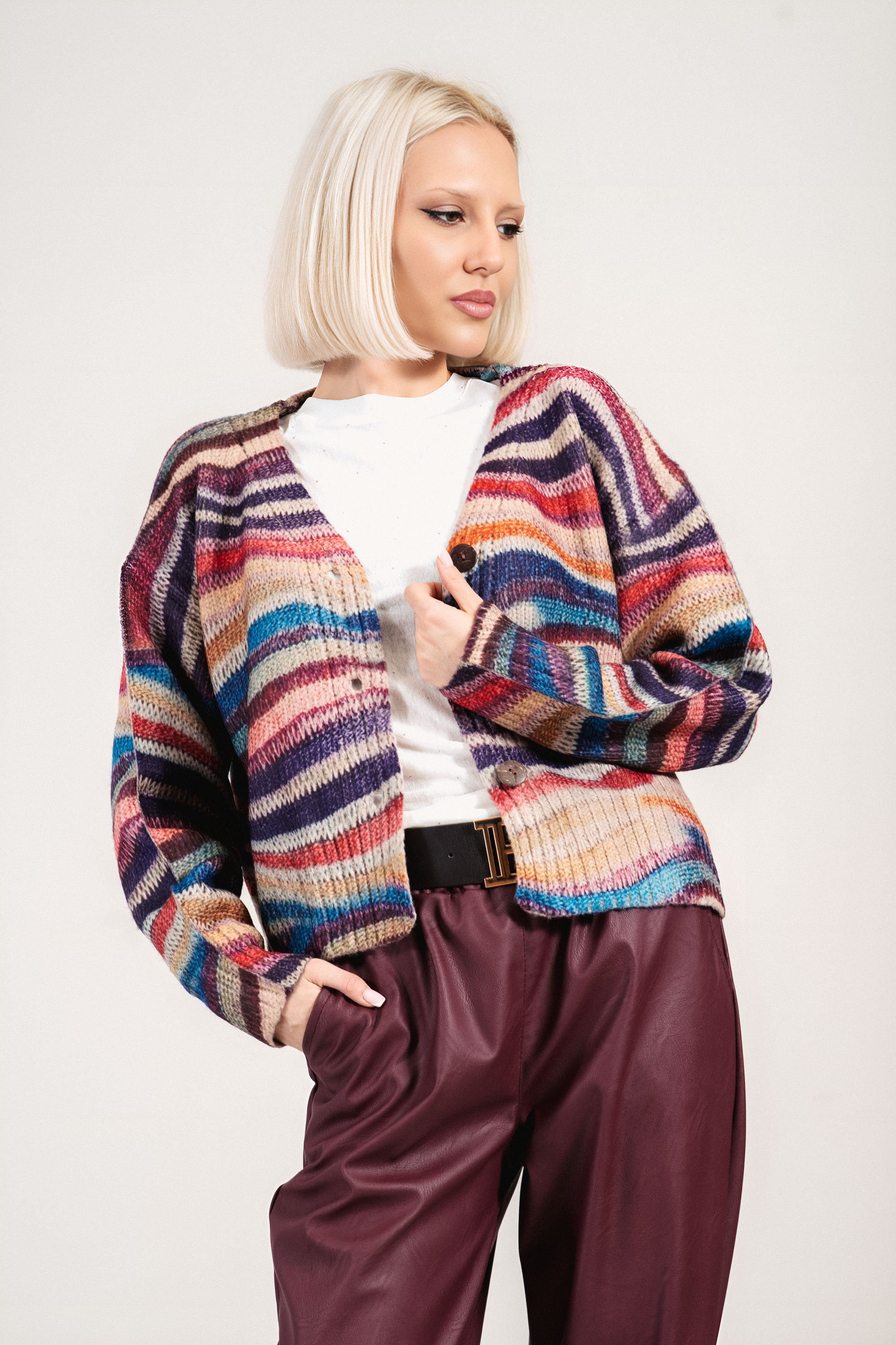 Цветна и запомняща се, тази жилетка е изработена от фино плетиво с щампа в живи тонове на лилаво, жълто и оранжево. Късата дължина и семплата линия я правят чудесен избор за модерна градска визия. Материята е лека и удобна, подходяща за пролетно-летния сезон.