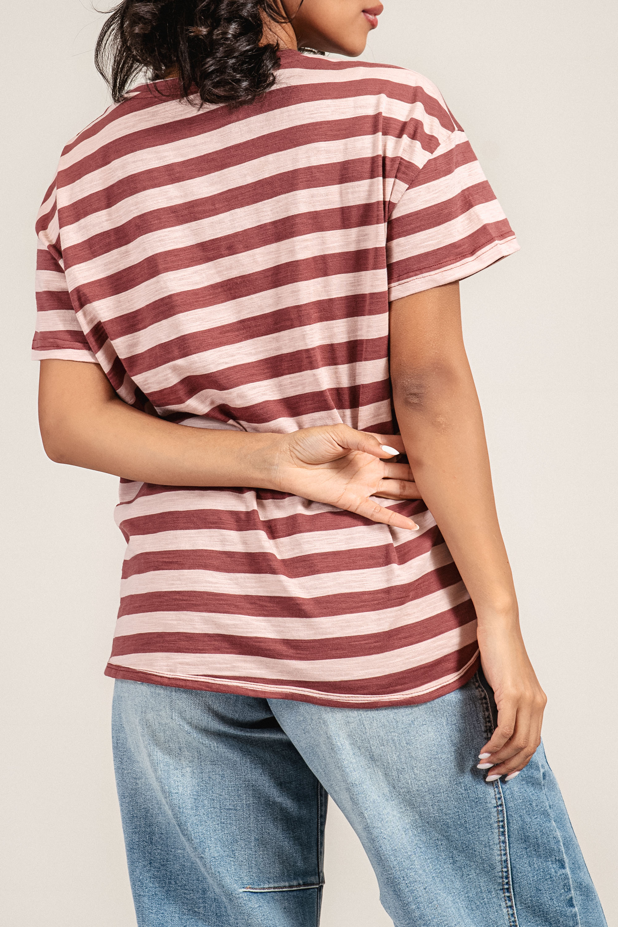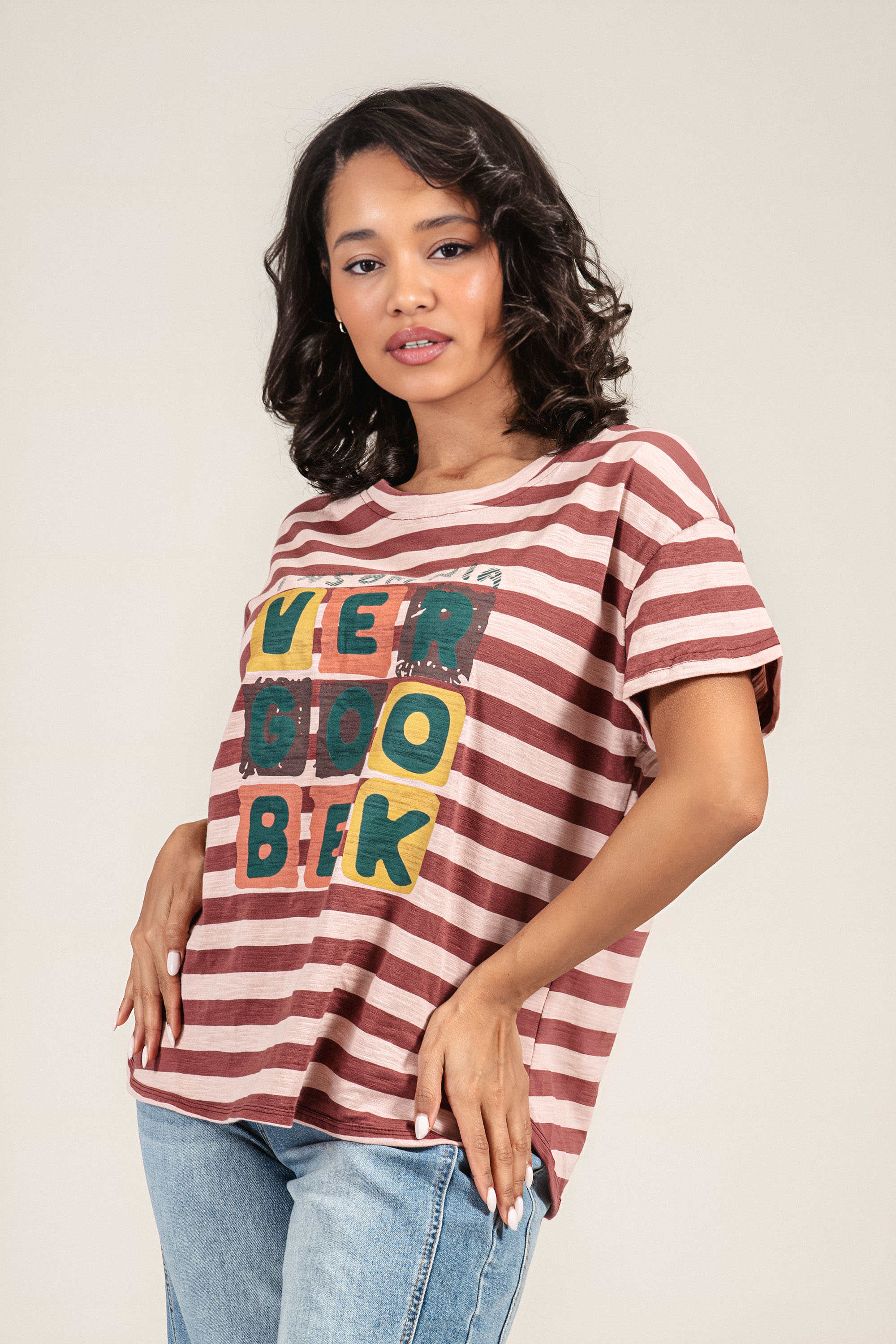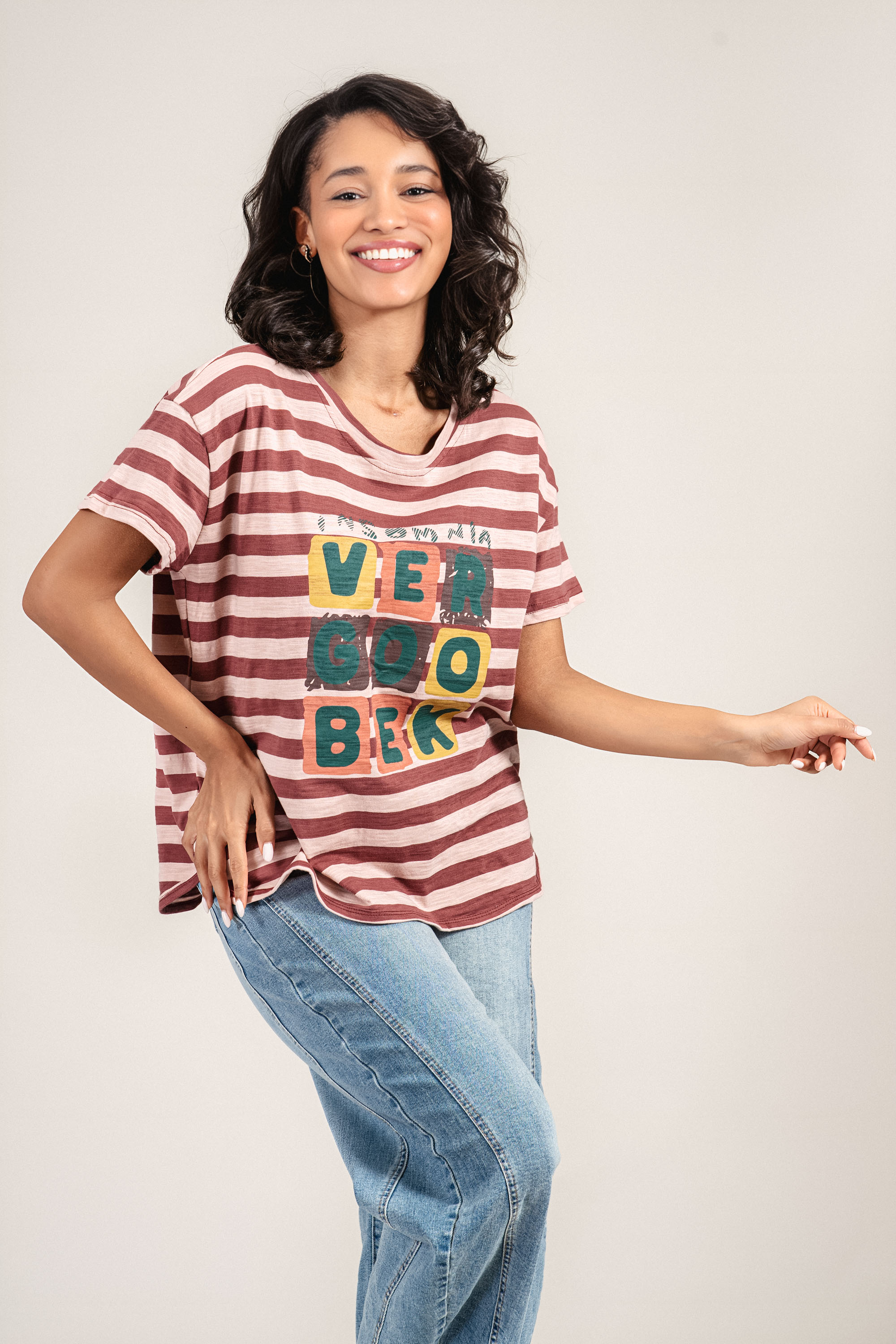 Свеж модел с модерно излъчване и удобна линия. Блузата е изработена от меко памучно трико, което осигурява добра въздухопропускливост и комфорт през целия ден. Свободната кройка и обло деколте създават непринудена визия, а контрастното райе в розови нюанси и цветният принт с надпис придават младежки акцент. Подходящ избор за ежедневието, комбинирана с дънки или спортно-елегантен панталон през пролетно-летния сезон.