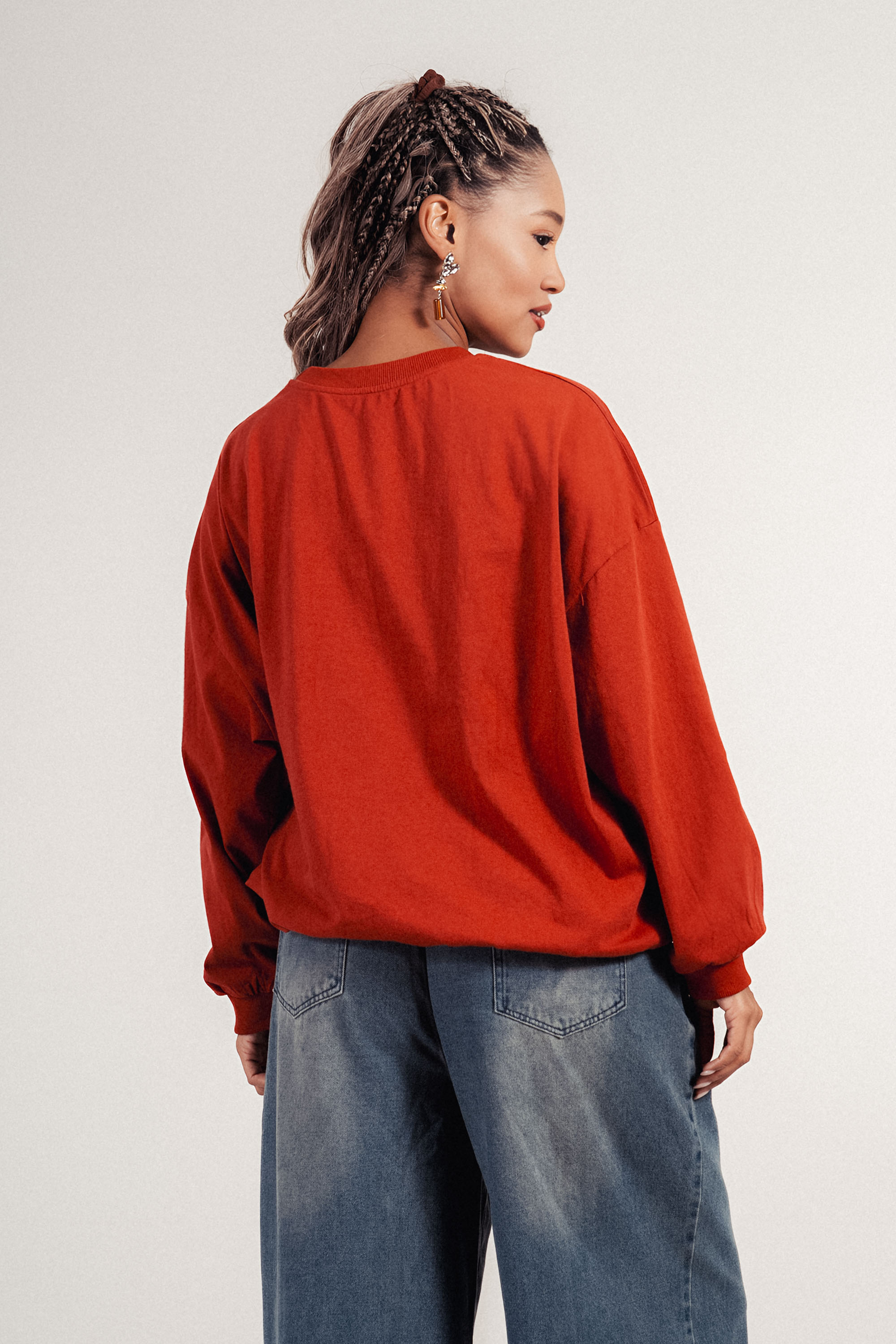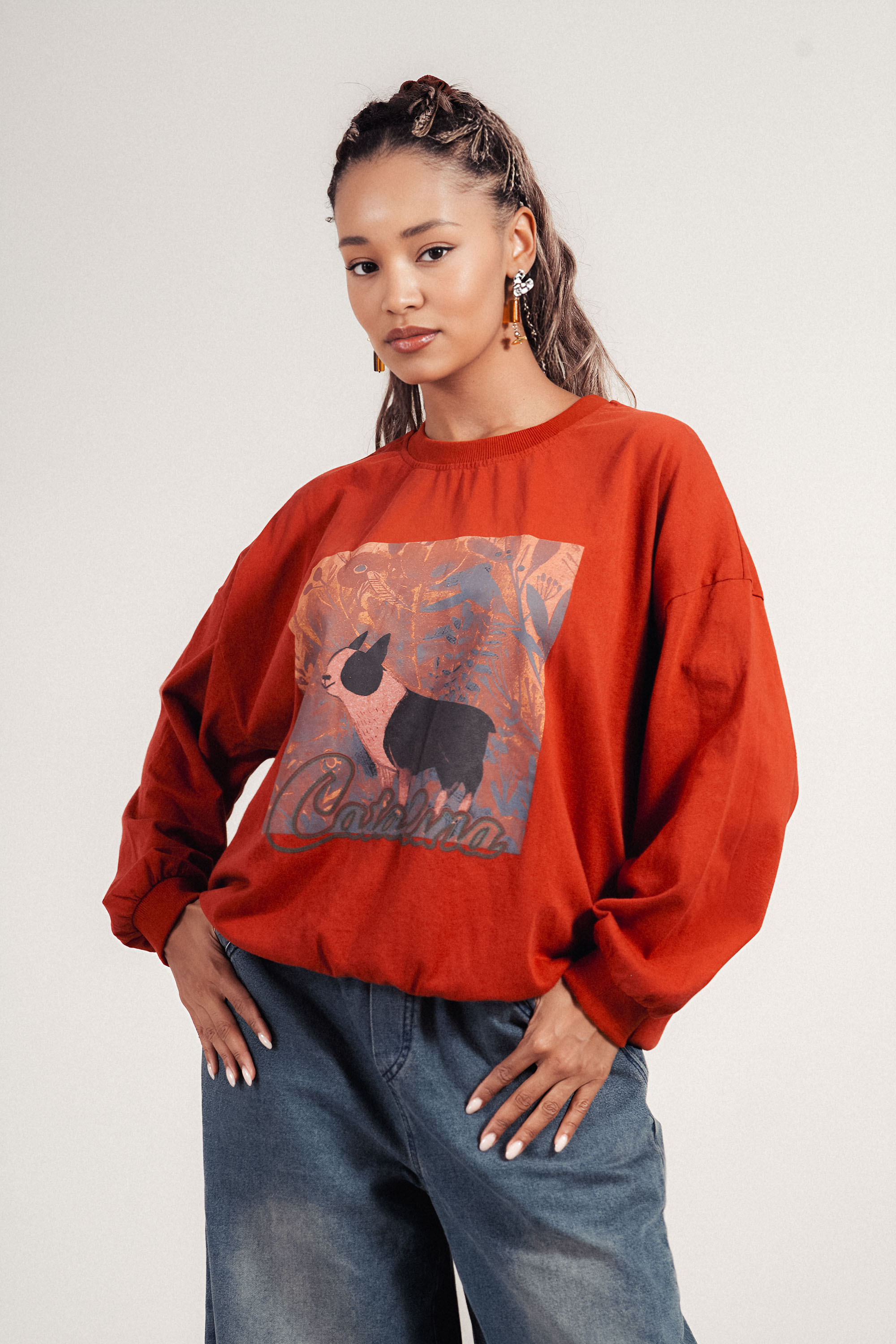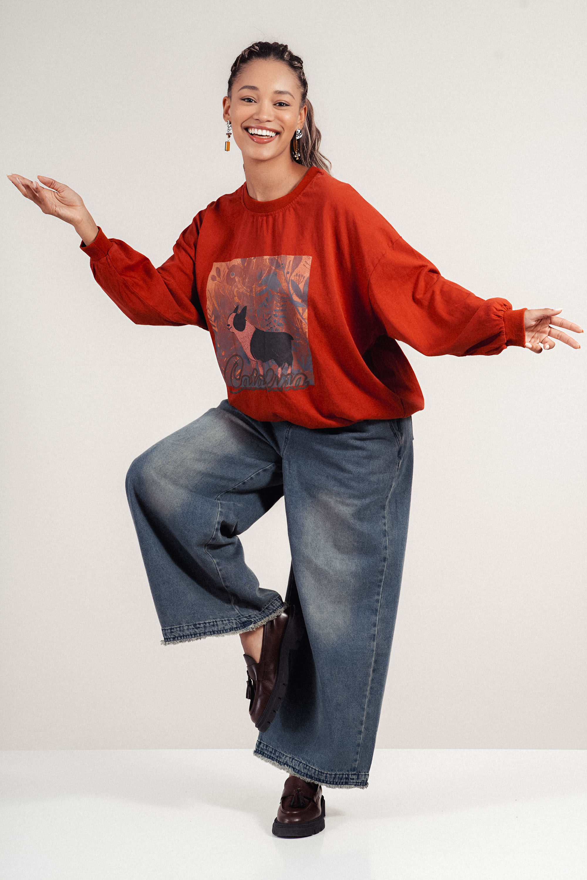Ежедневна блуза от мекa памучна материя в наситено червено. Свободната кройка с дълъг ръкав и обло деколте осигурява комфорт и свобода на движение. Щампата с изображение на куче придава артистичен акцент, който допълва семплата линия на модела. Подходяща за носене през преходните сезони.