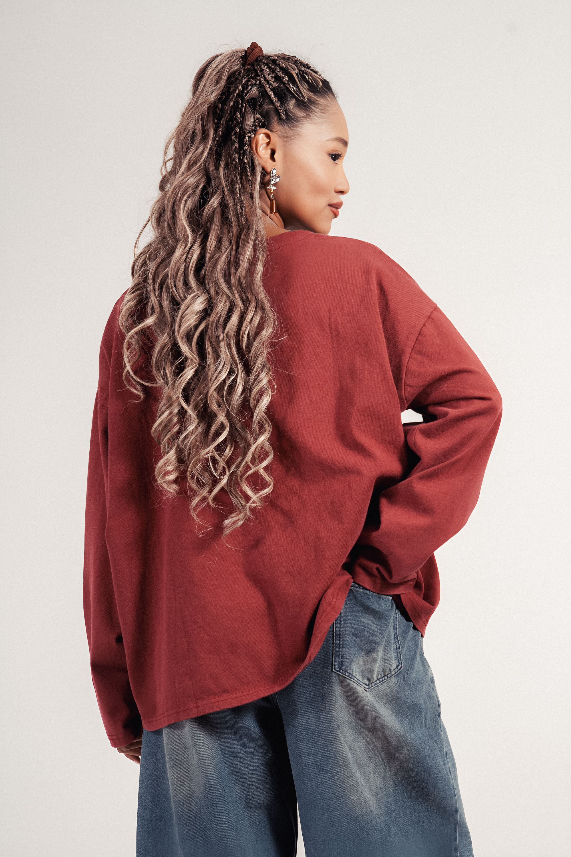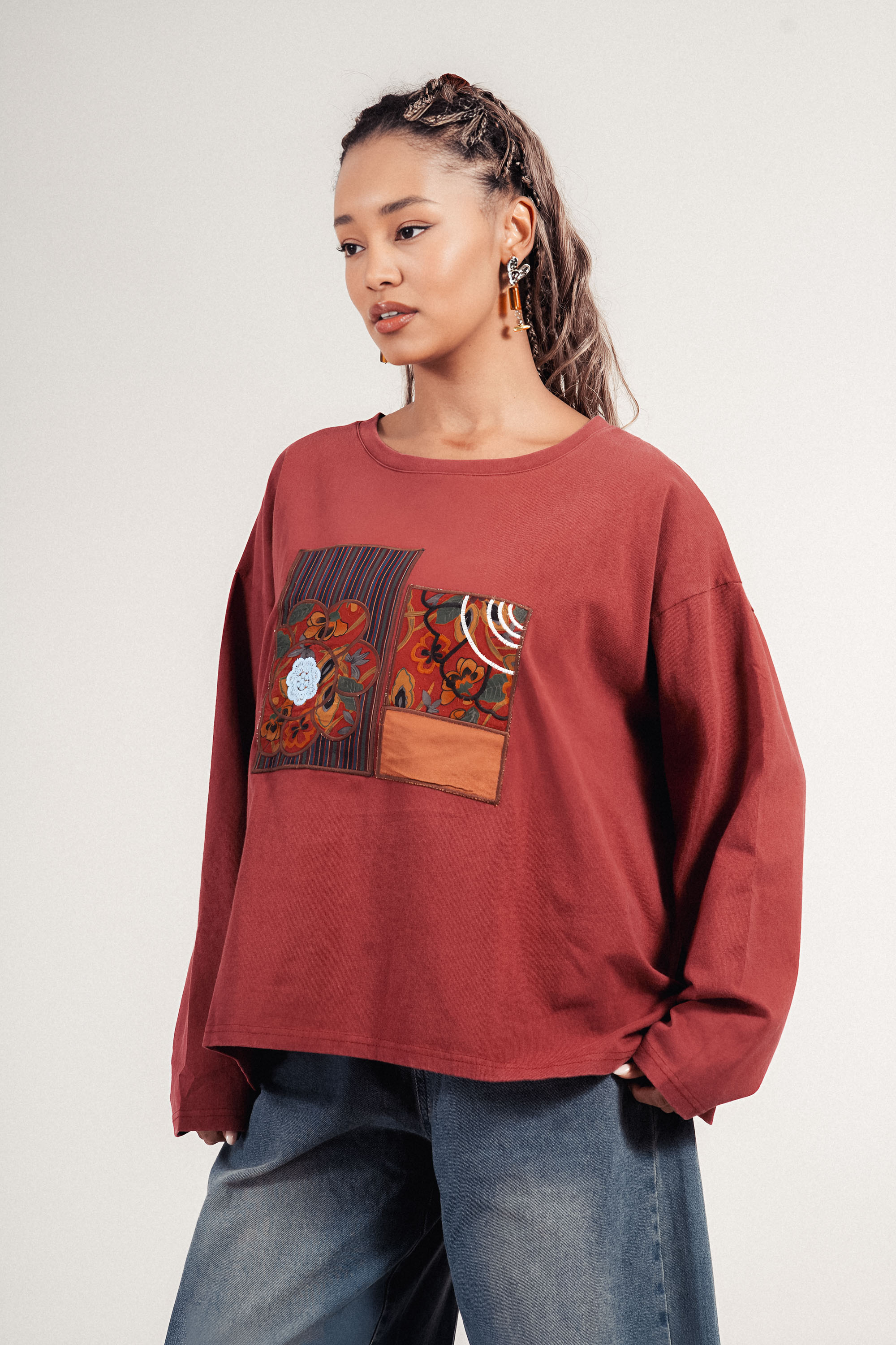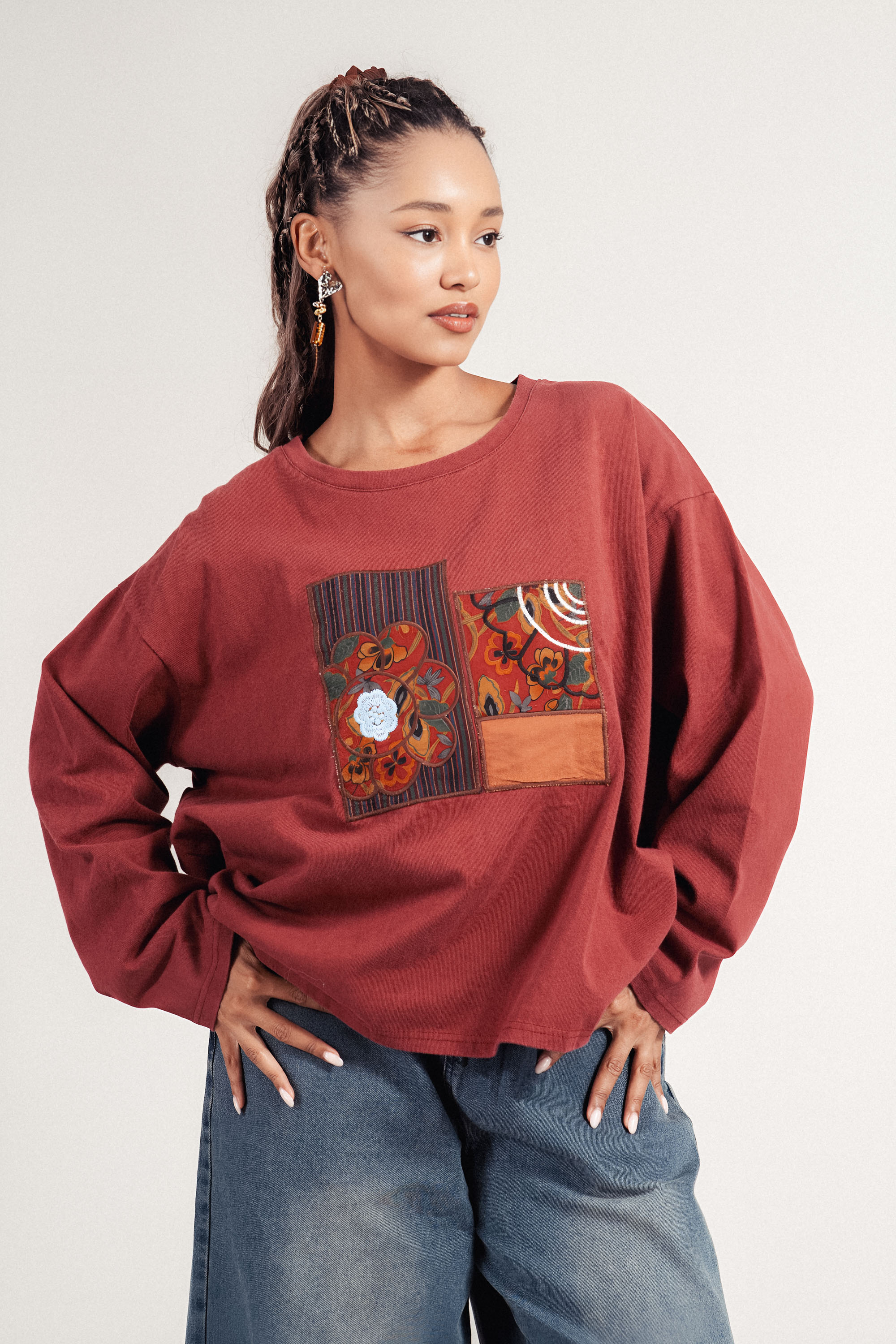 Блуза от естествена памучна материя в червен цвят. Моделът впечатлява с цветна щампа с флорални мотиви и квадратна композиция, която създава модерен акцент. Свободната кройка, дългите ръкави и облото деколте осигуряват комфорт и изискано излъчване в ежедневието. Подходяща за есенно-зимния сезон и градски комбинации с дънки или панталон.