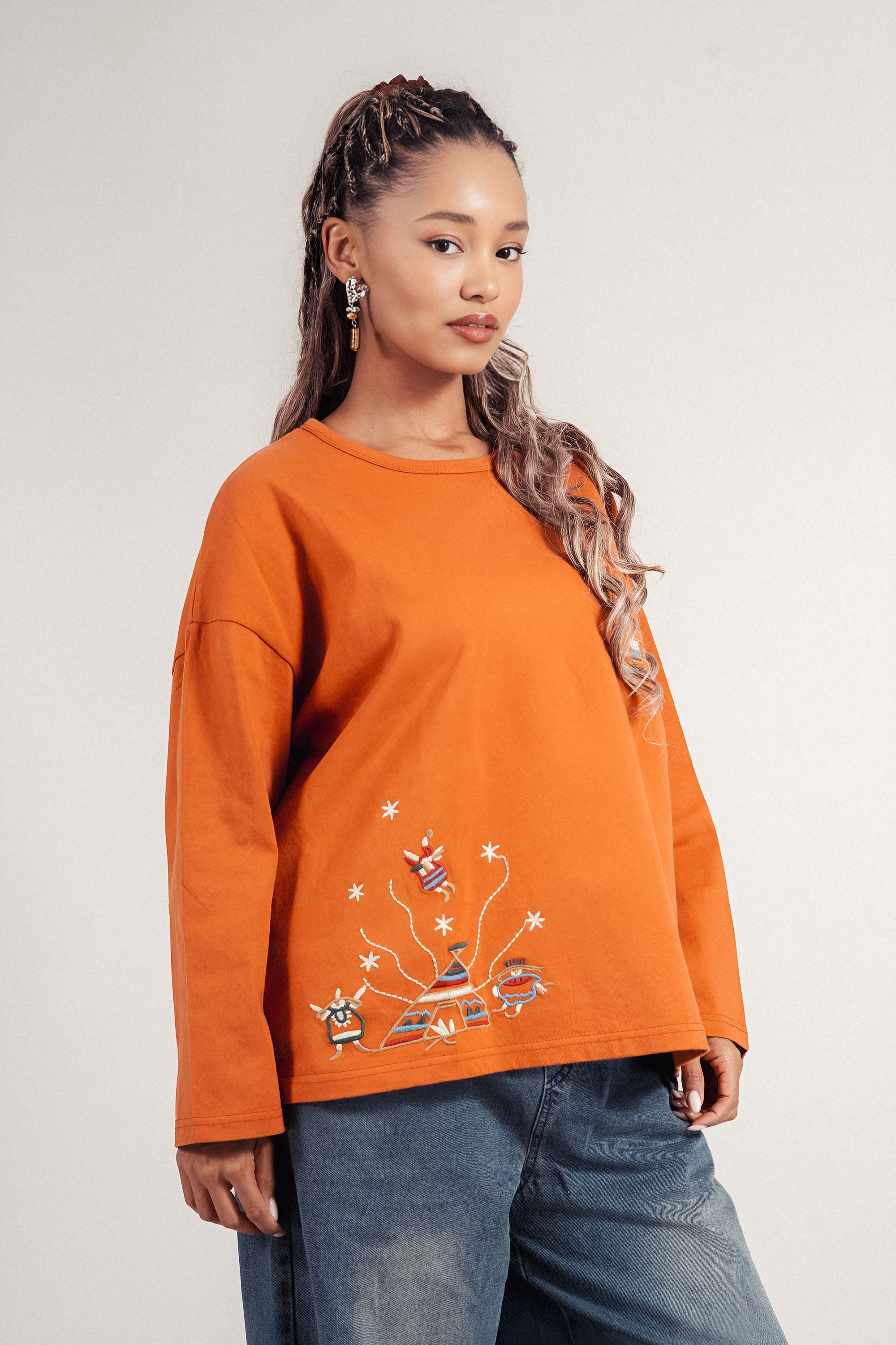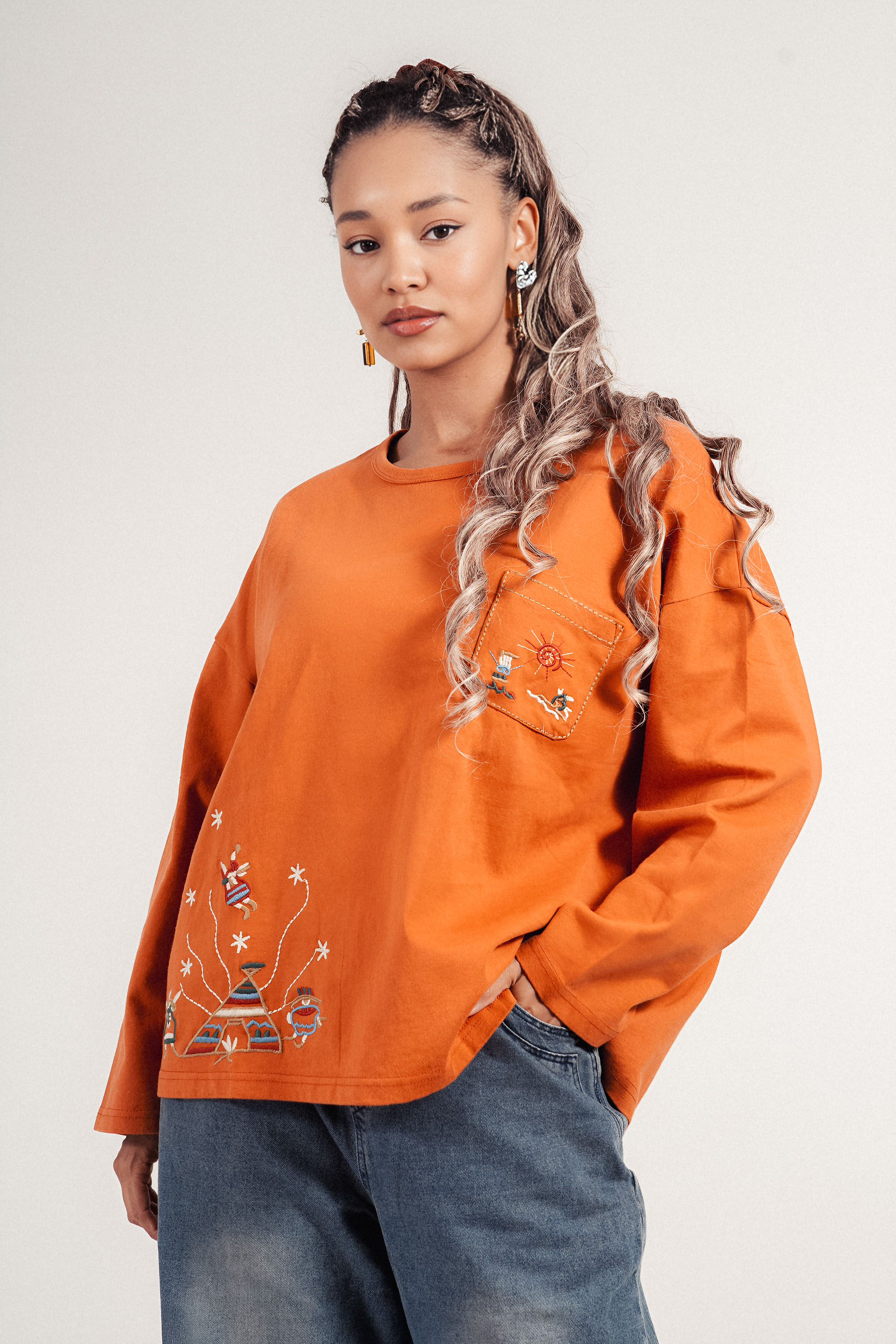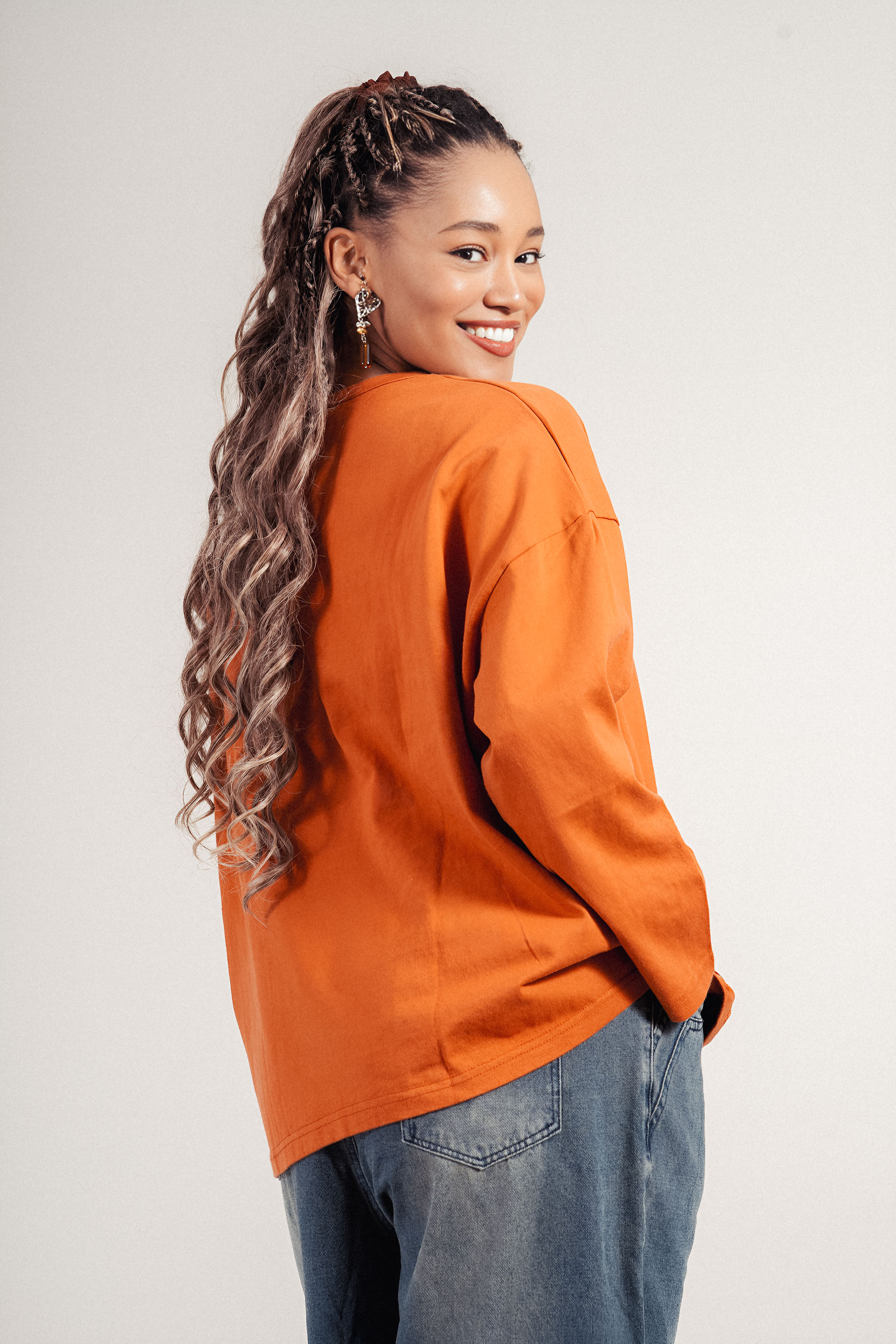 Тази памучна блуза в керемидено оранжево впечатлява с артистична бродерия и декоративен джоб на бюста. Свободната кройка осигурява комфорт през целия ден, а меката материя е идеална за есенно-зимния сезон. Подходяща е както за ежедневие, така и за по-непринудени срещи, съчетавайки се отлично с дънки или панталони.