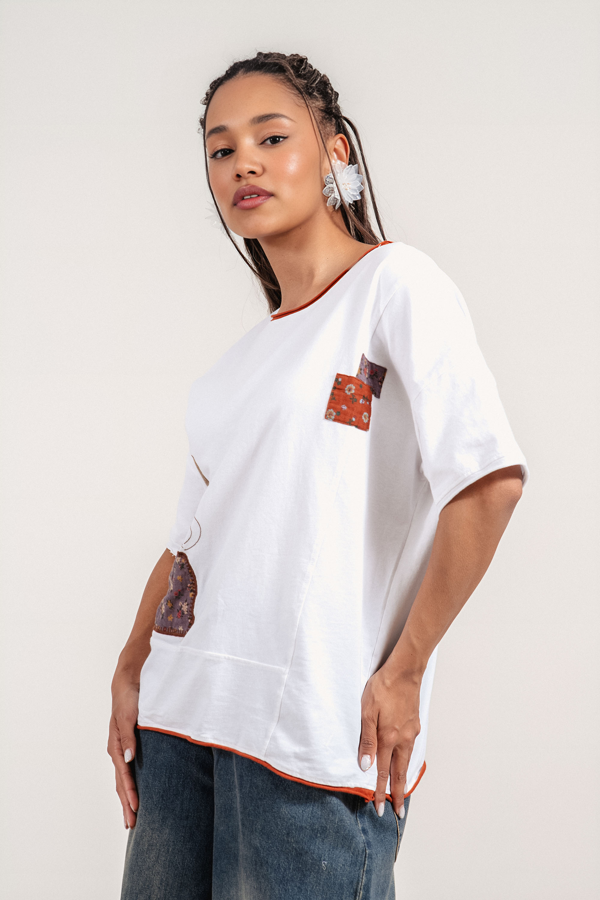 Дамска оувърсайз памучна тениска в бяло с апликация момиче с панделка и цветни квадрати