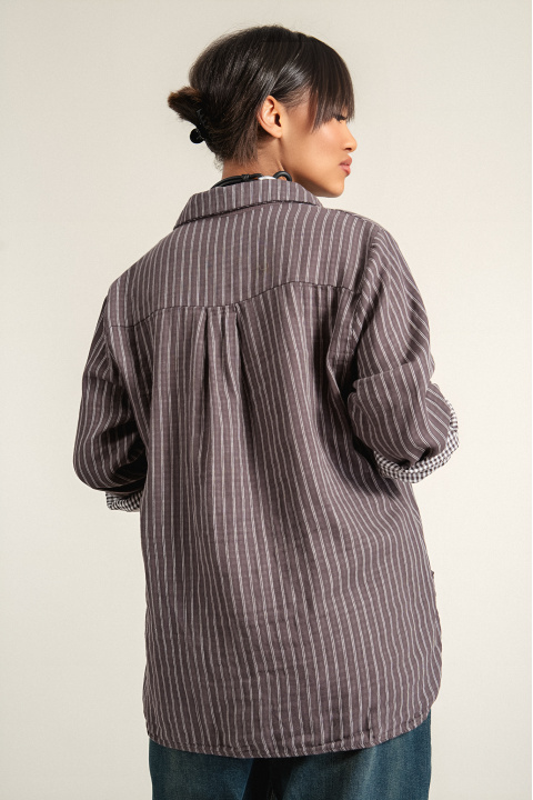 Дамска оувърсайз риза от памук в сиво-лилав цвят с принт вертикално райе и кариран принт от вътрешния край