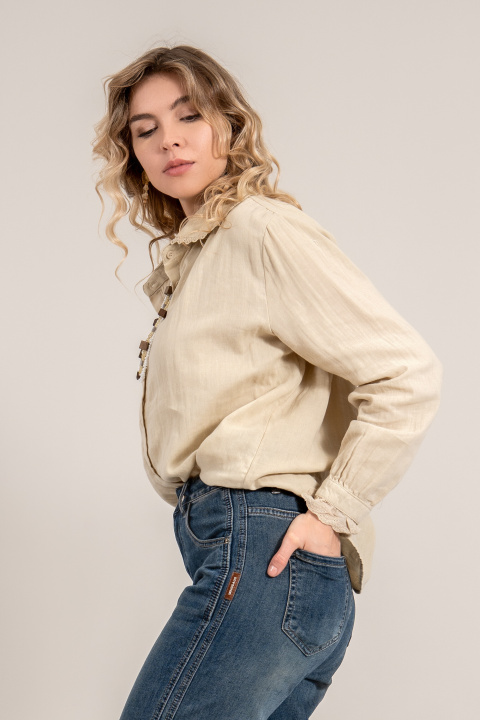 Дамска оувърсайз риза от памук в светлобежово с рязана бродерия на яката