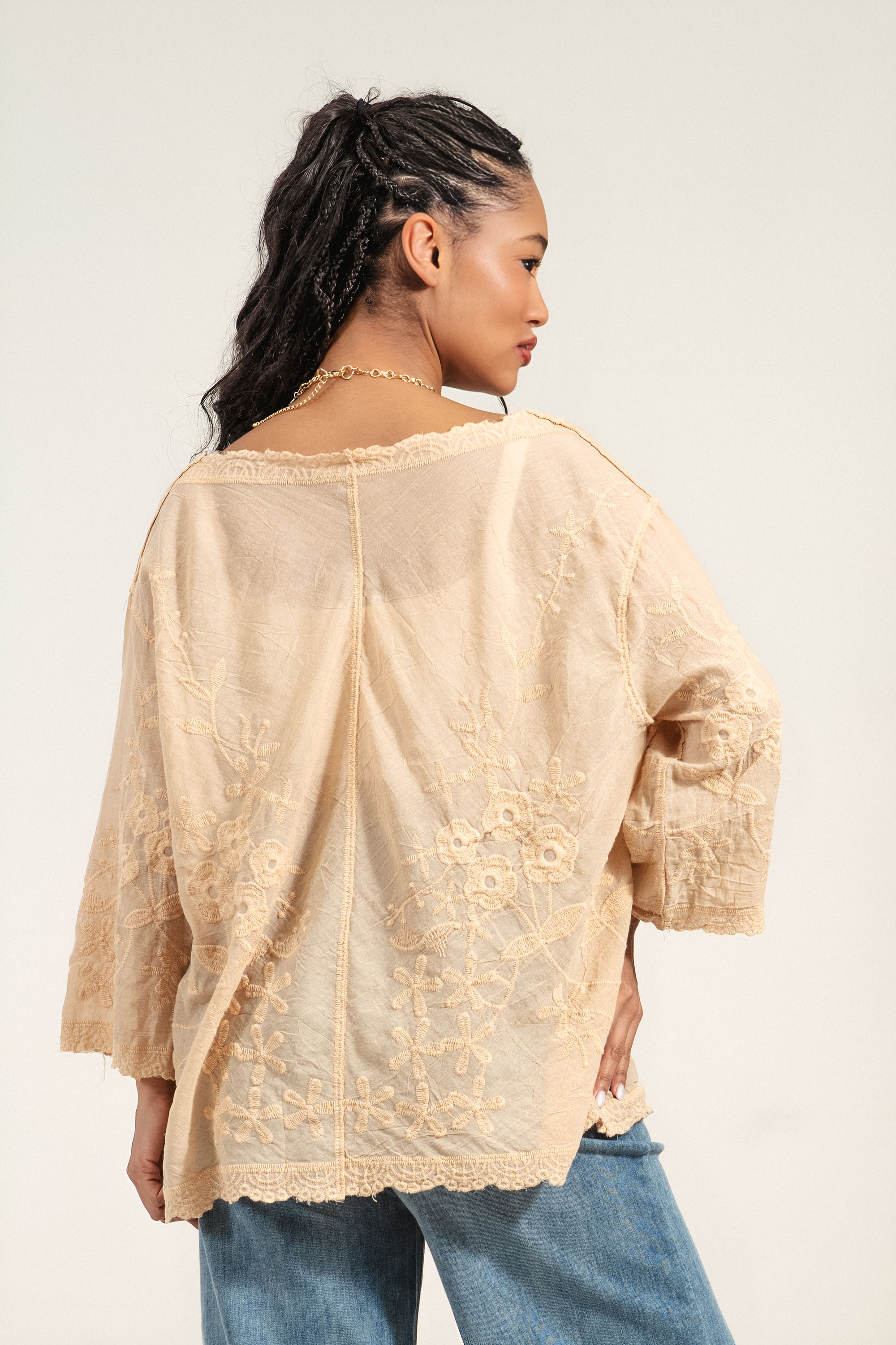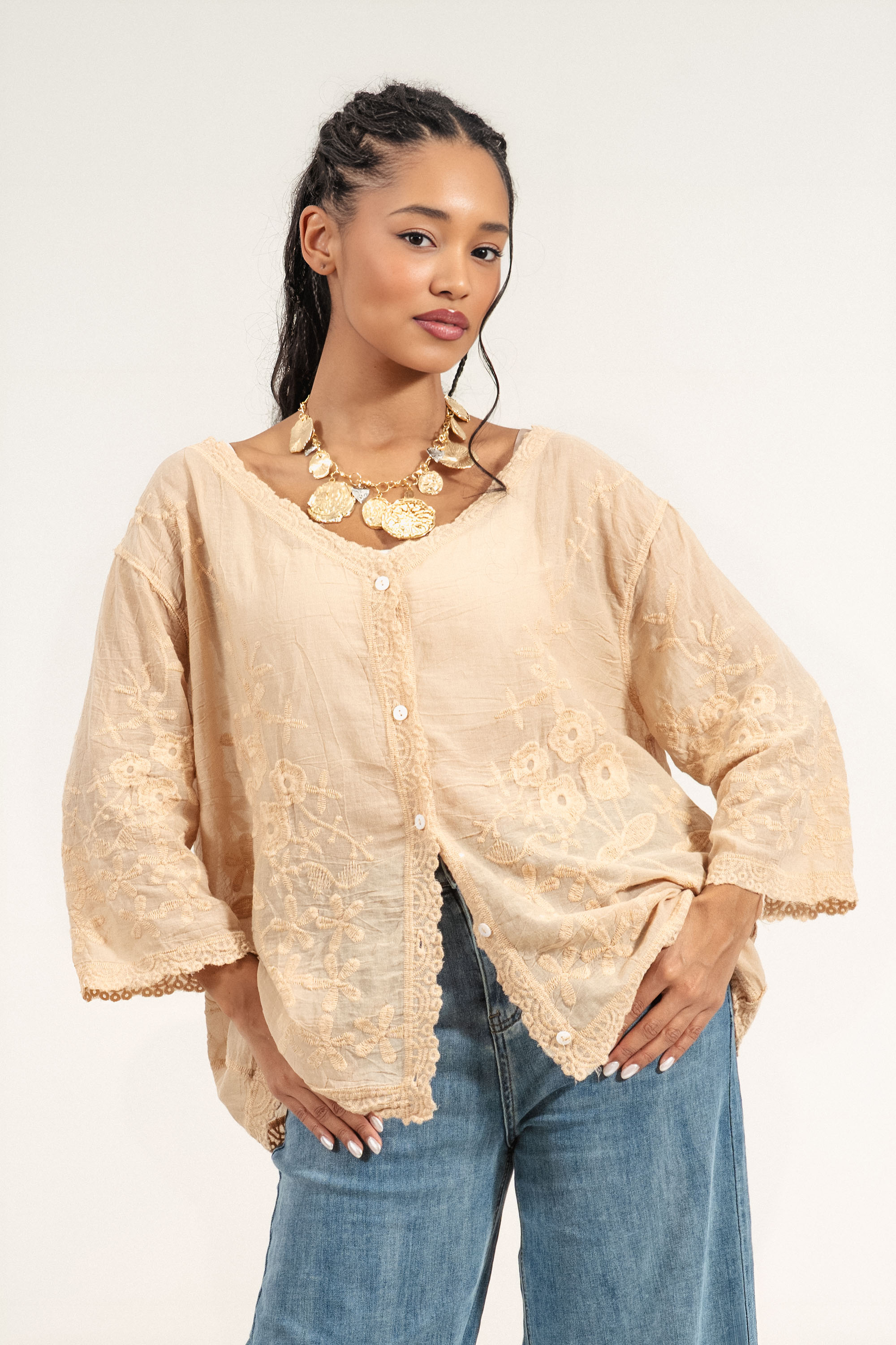 Тази ефирна блуза в бежово съчетава удобство и женствен стил. Акцентът пада върху фината бродерия на цветя и нежния дантелен кант около деколтето, ръкавите и подгъва. Дълбокото деколте и свободната кройка я правят подходяща за ежедневно носене или по-специални поводи през топлите сезони.