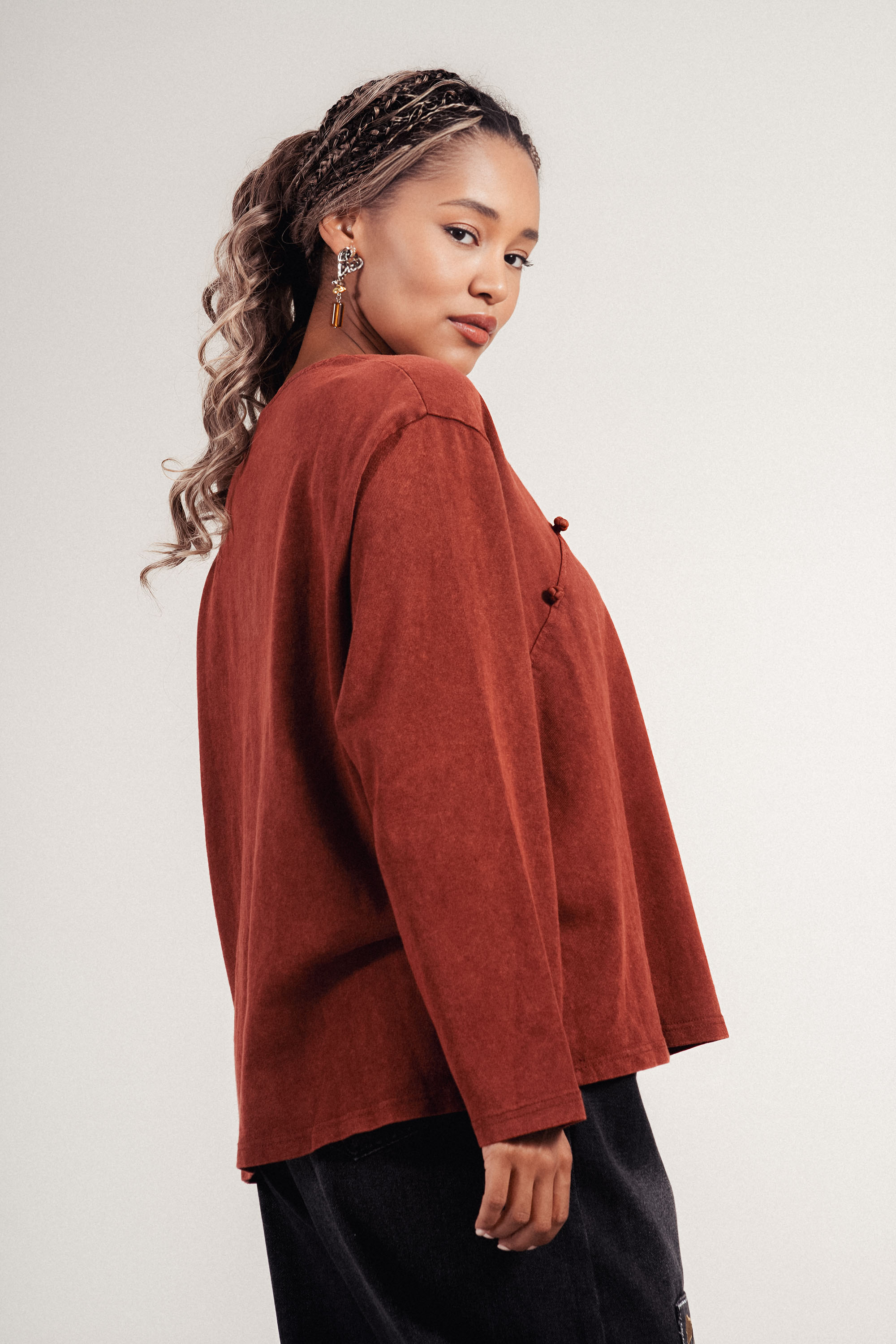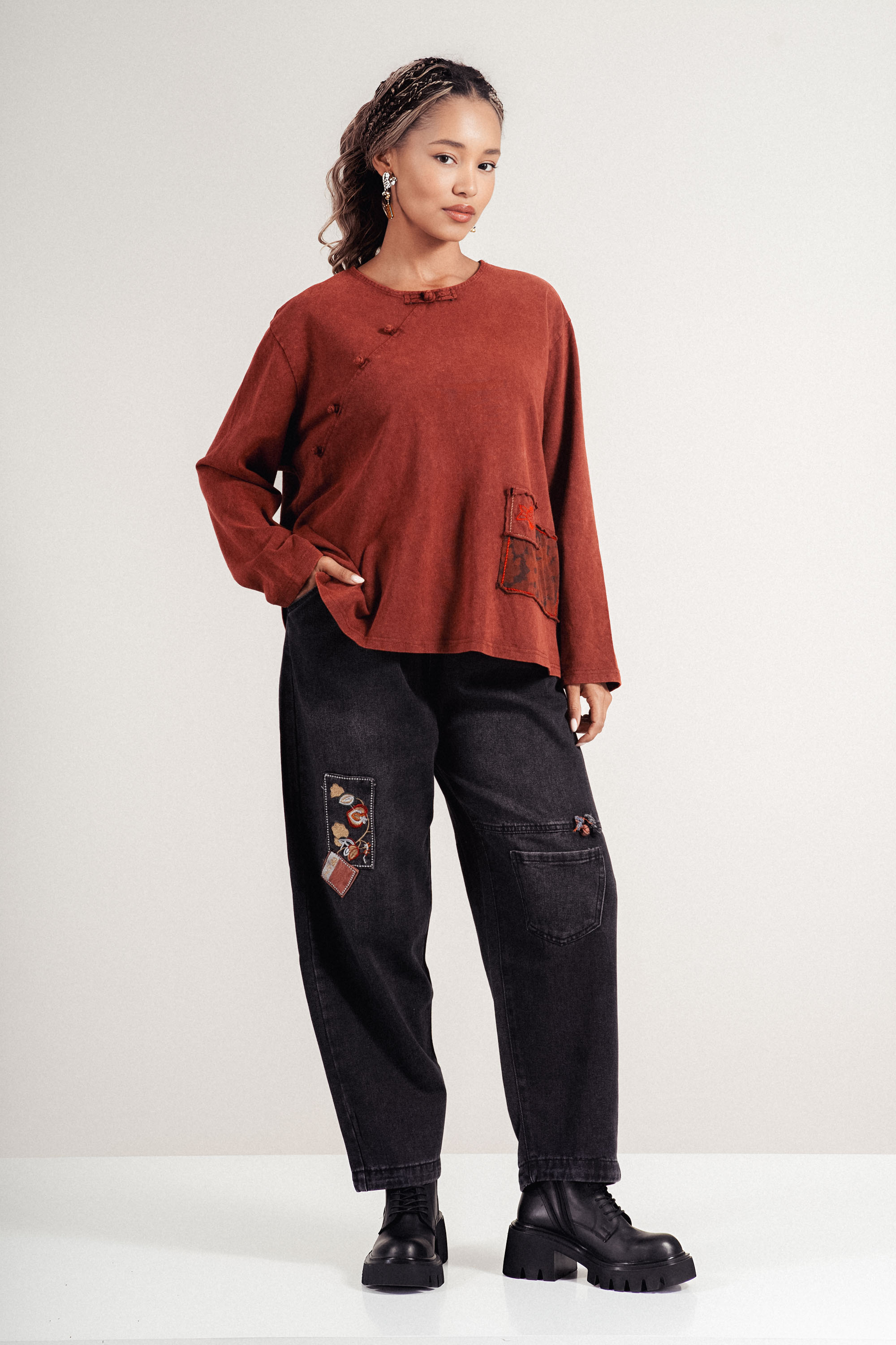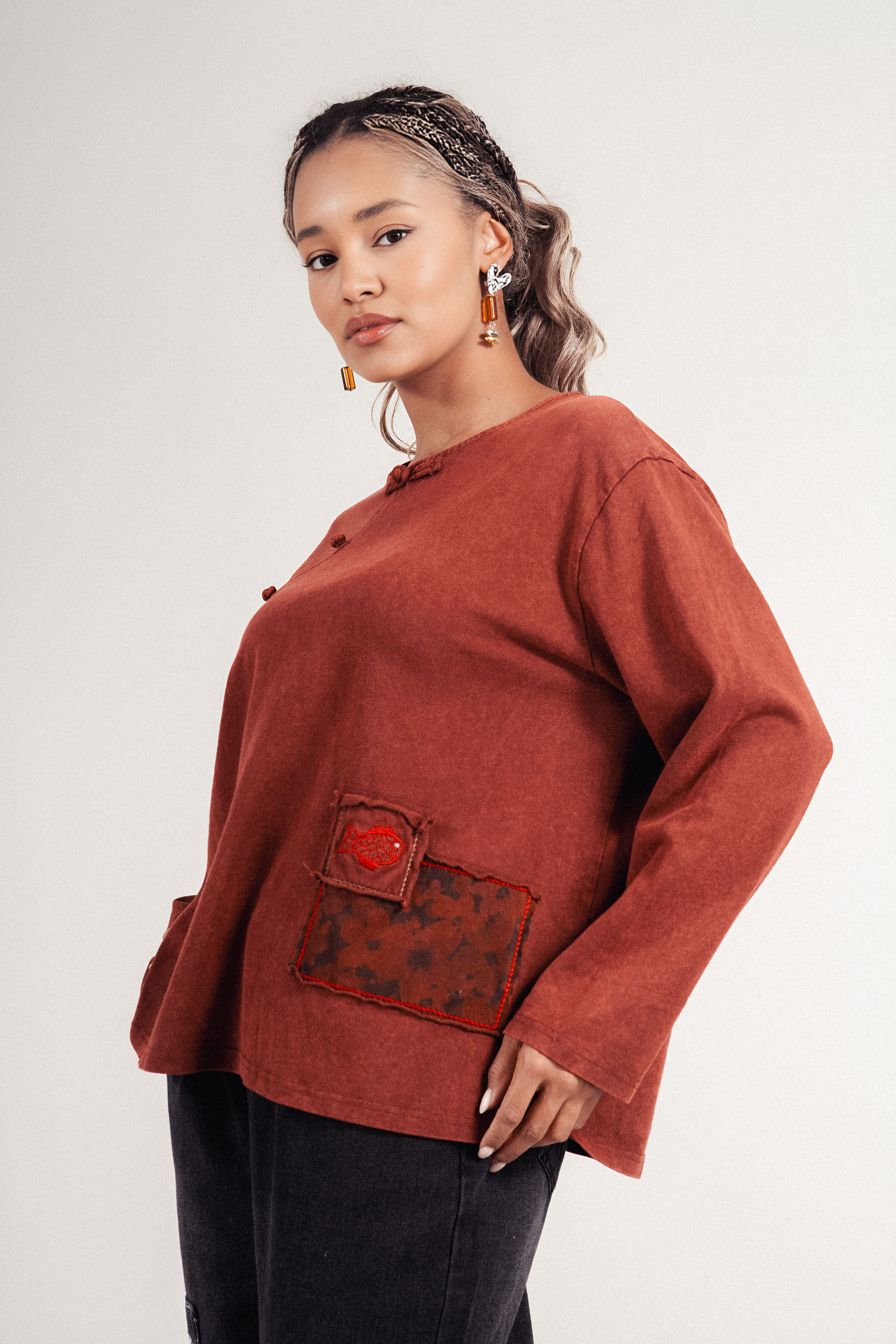 Блуза от 100% памук в керемидено червен нюанс. Моделът впечатлява със странична декоративна лента, която придава женственост и елегантност. Свободната кройка осигурява комфорт и лекота при носене, а дългите ръкави правят блузата подходяща за преходния сезон. Перфектен избор за стилна ежедневна визия.