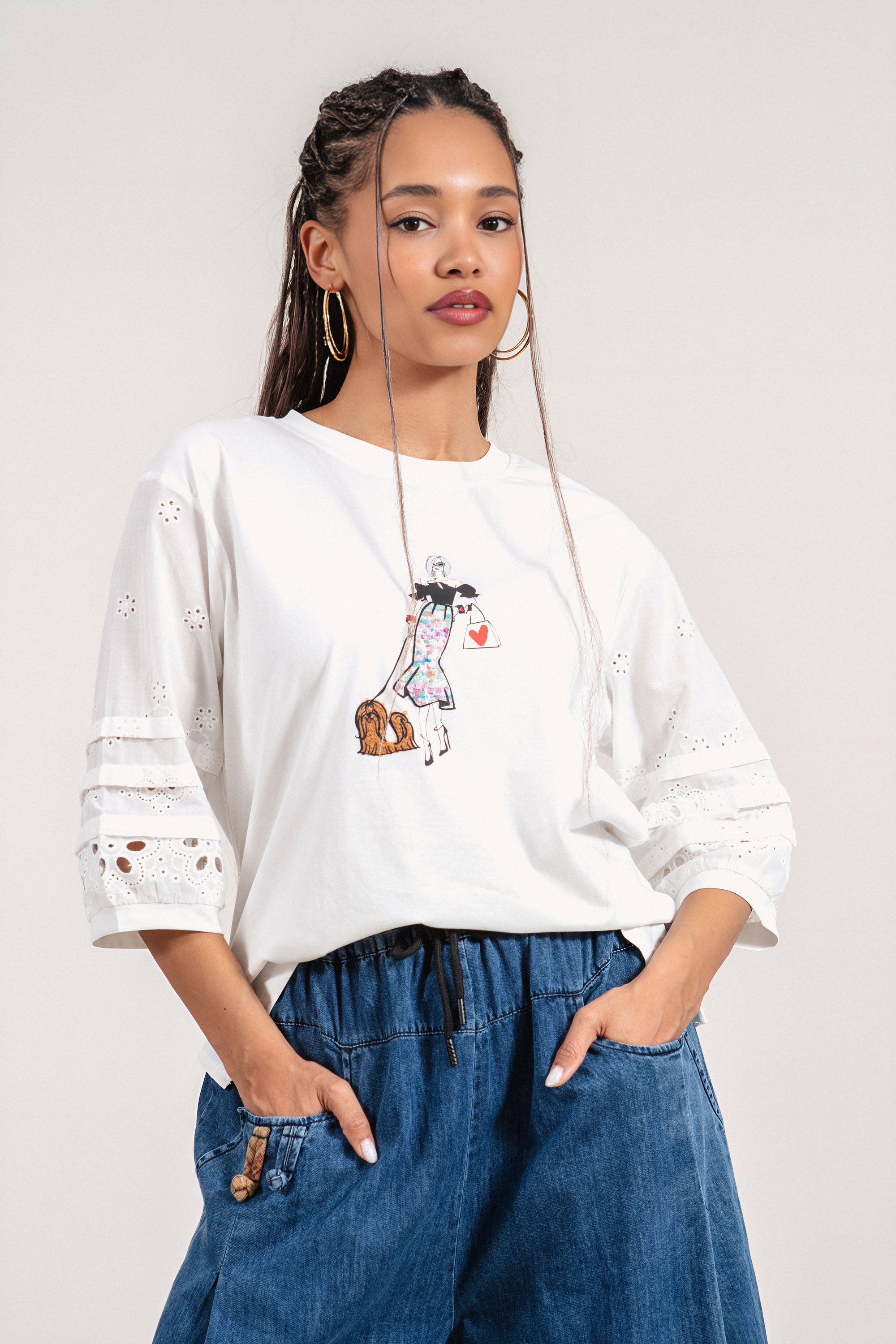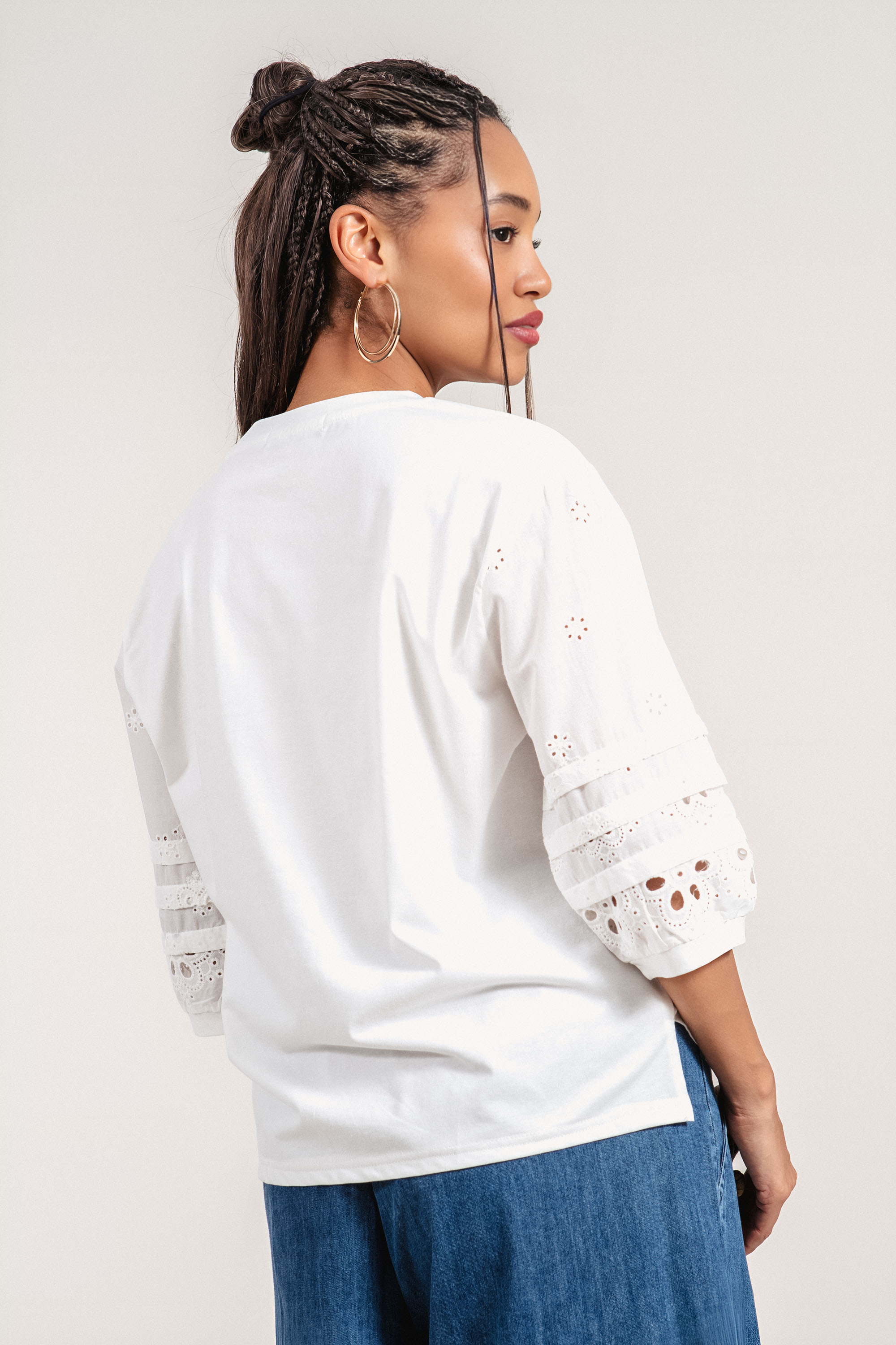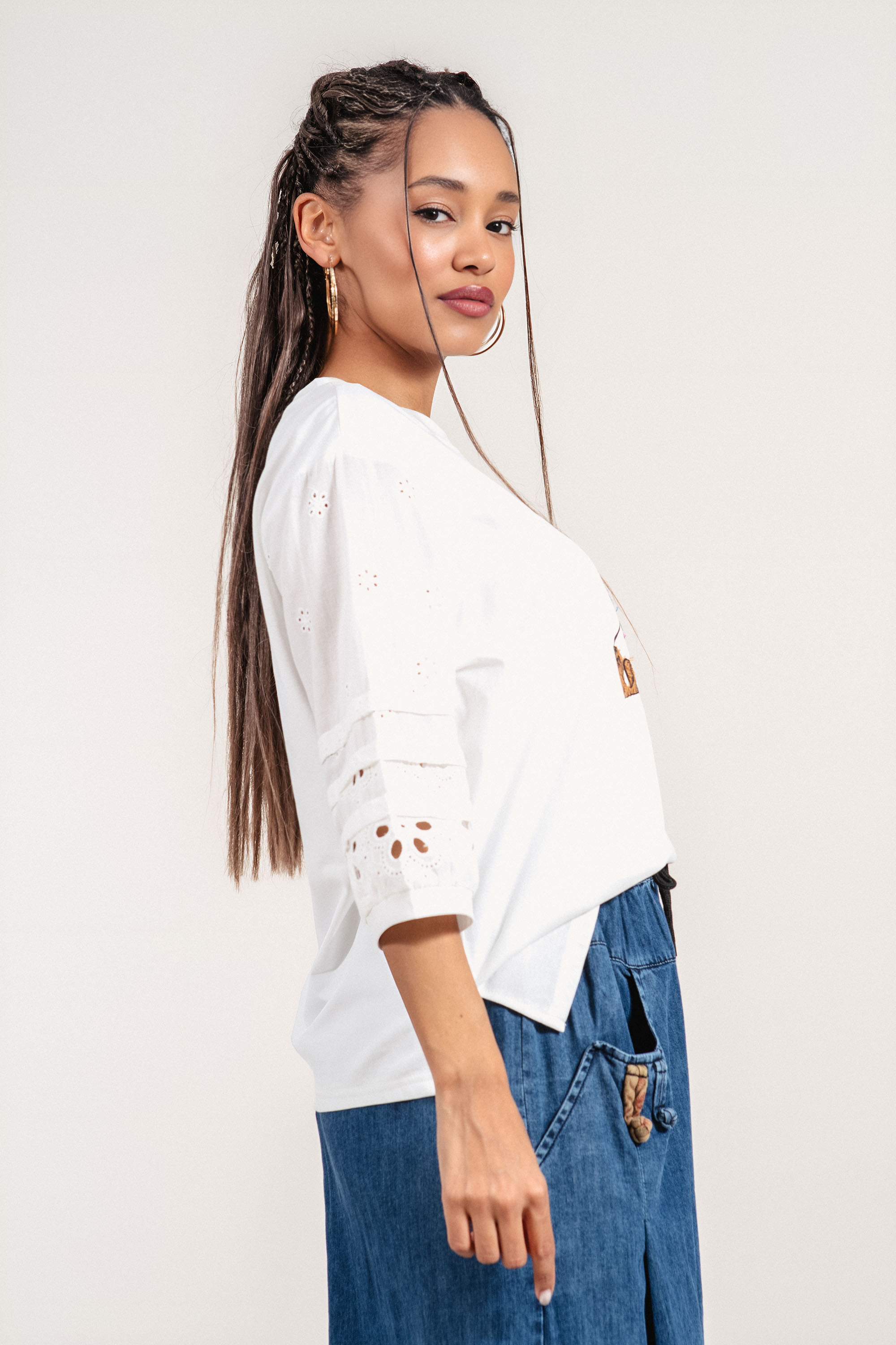 Дамска блуза с отличителна рязана бродерия по ръкавите и модерно излъчване. Памучната материя осигурява комфорт и я прави подходяща за ежедневието. 3/4 ръкавът придава практичност и стил, а декоративните елементи добавят характер към визията. Моделът е подходящ както за ежедневни, така и за по-елегантни комбинации.