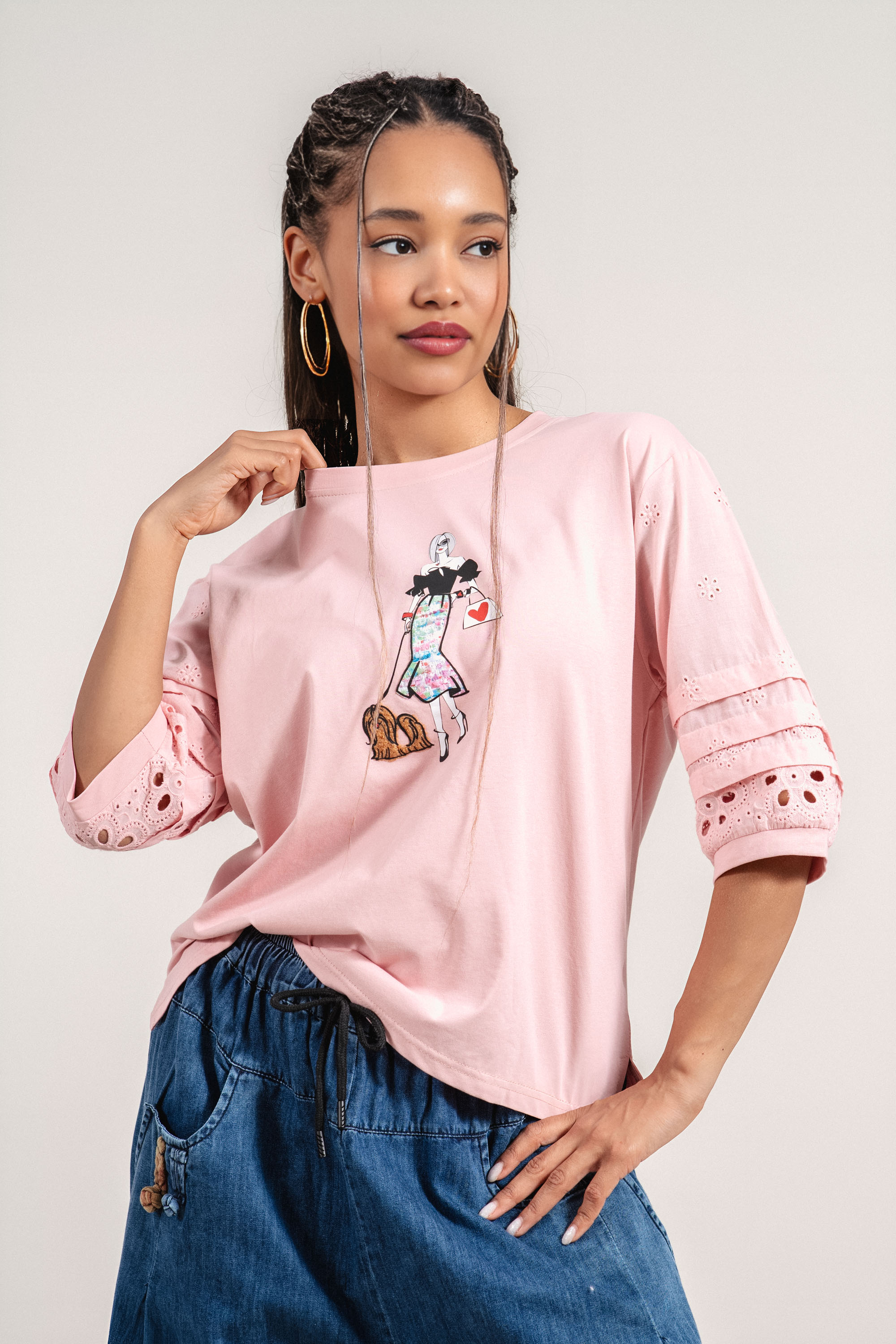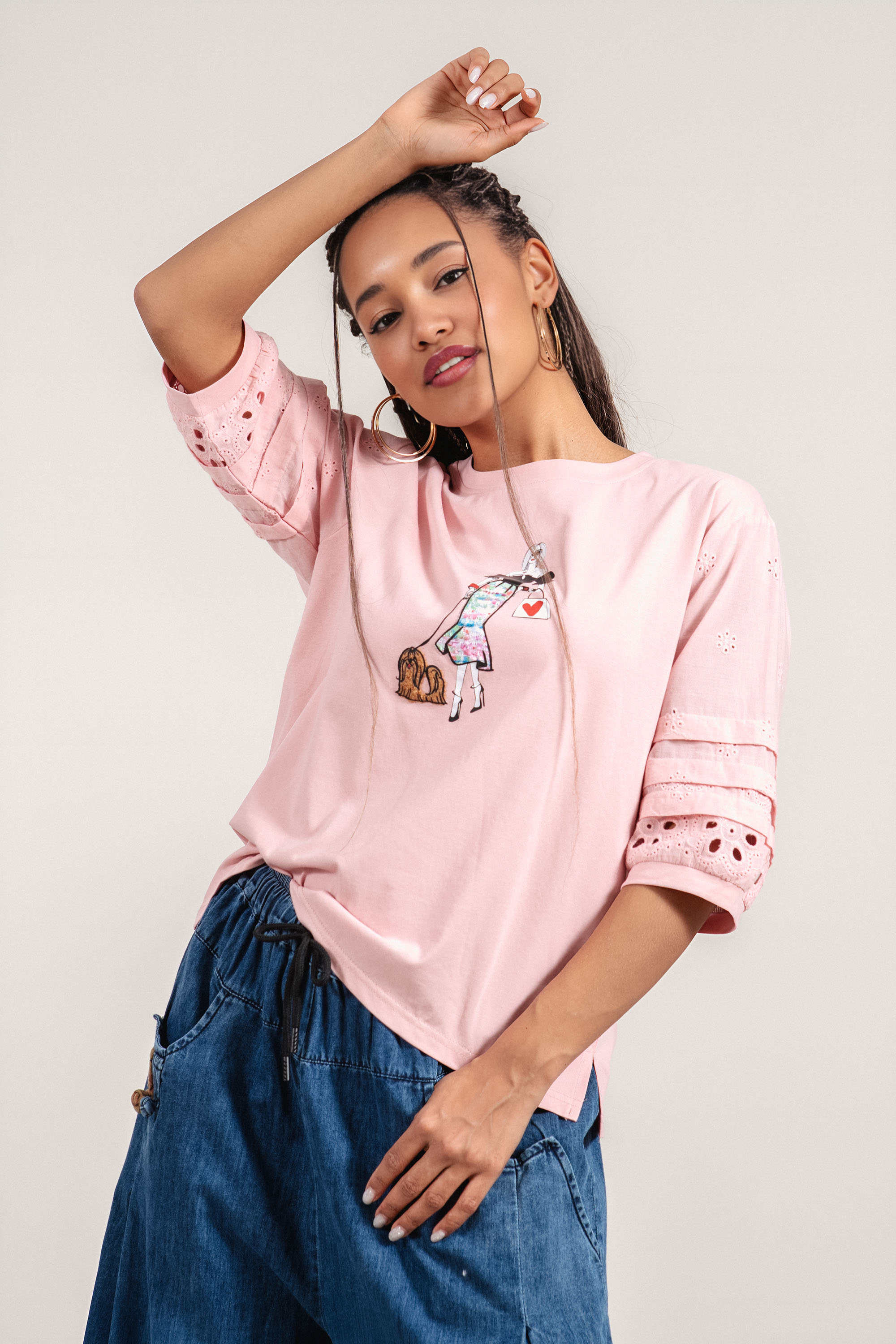 Дамска памучна блуза в розово с рязана бродерия на ръкавите и щампа момиче с куче