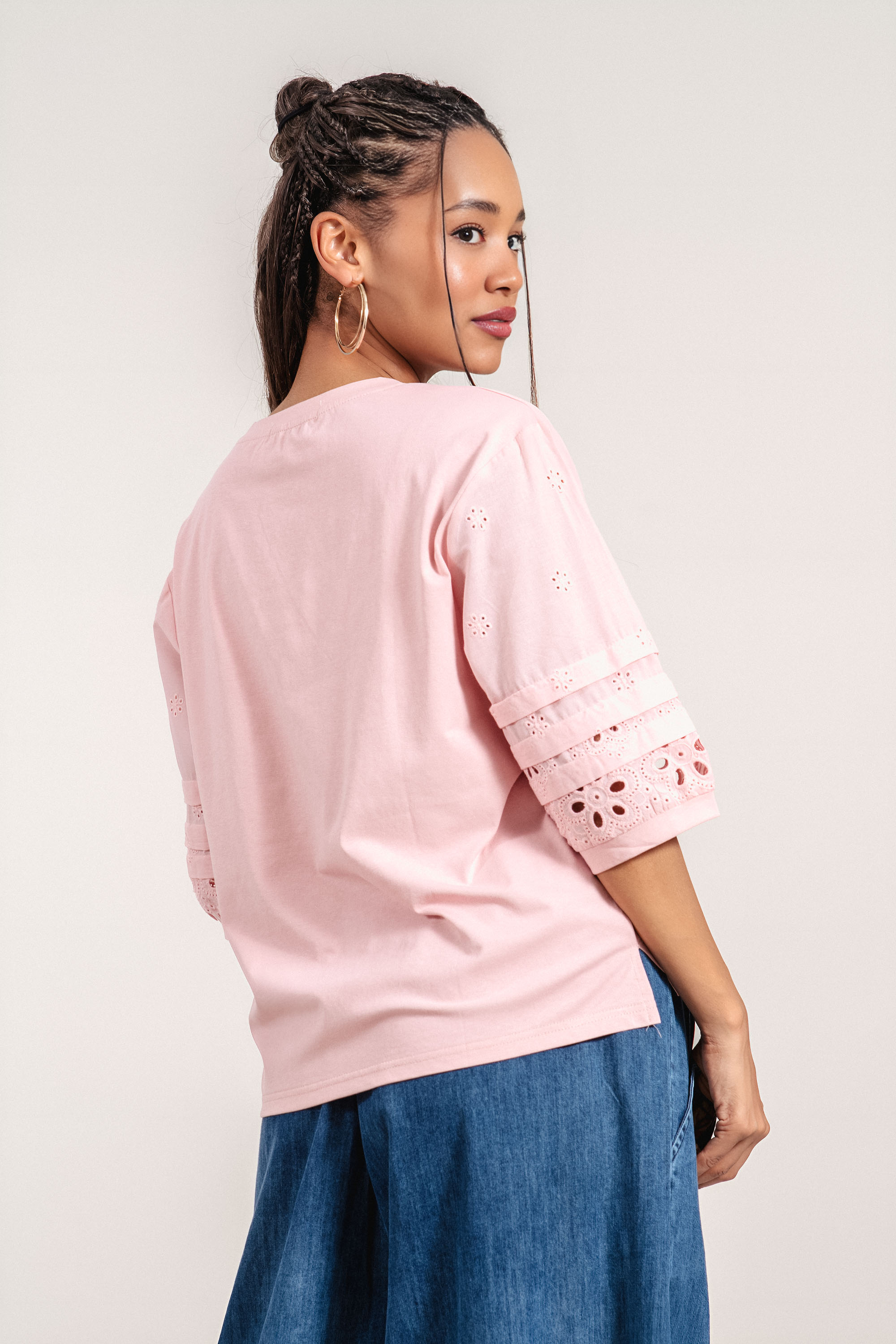 Дамска блуза с отличителна рязана бродерия по ръкавите и модерно излъчване. Памучната материя осигурява комфорт и я прави подходяща за ежедневието. 3/4 ръкавът придава практичност и стил, а декоративните елементи добавят характер към визията. Моделът е подходящ както за ежедневни, така и за по-елегантни комбинации.