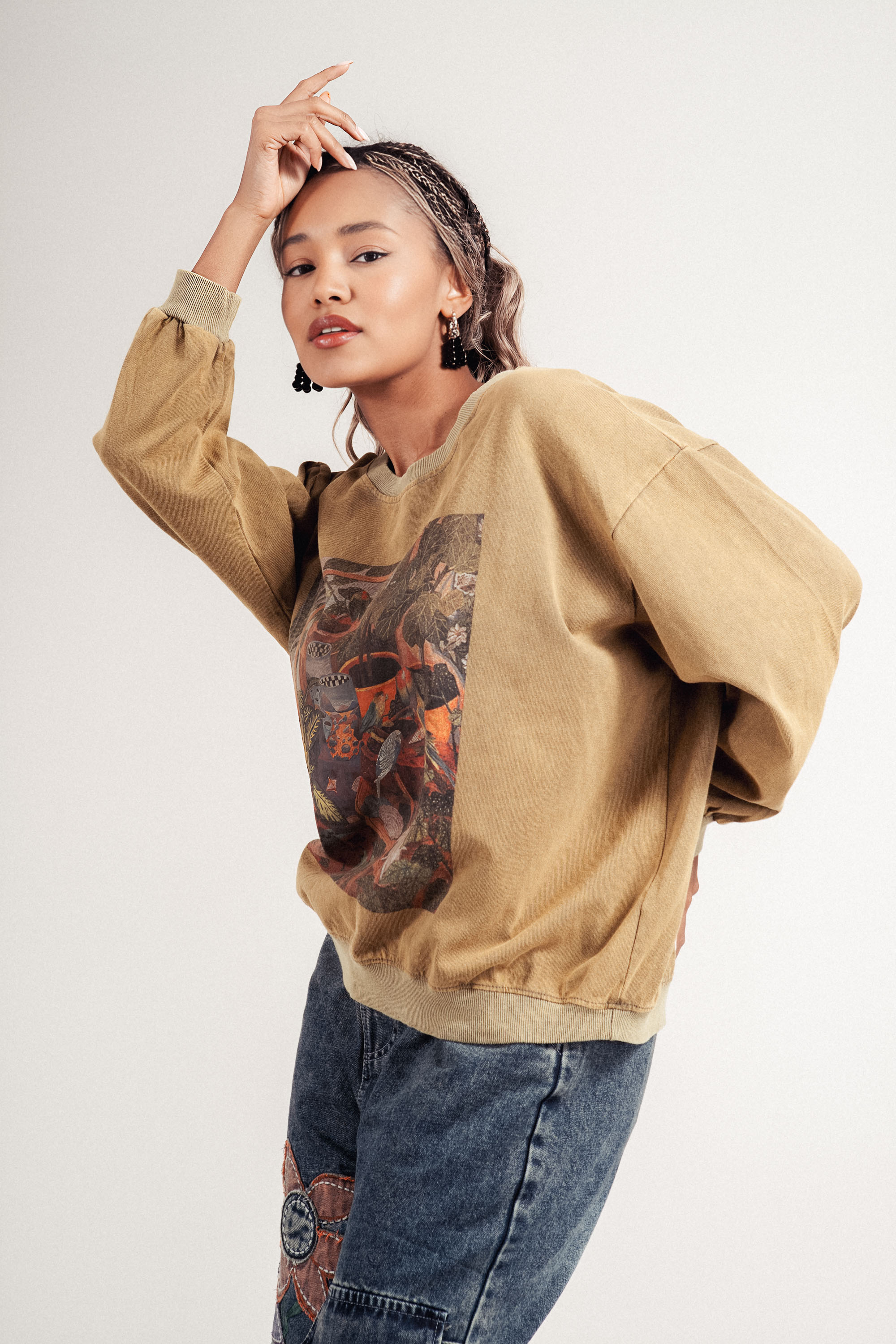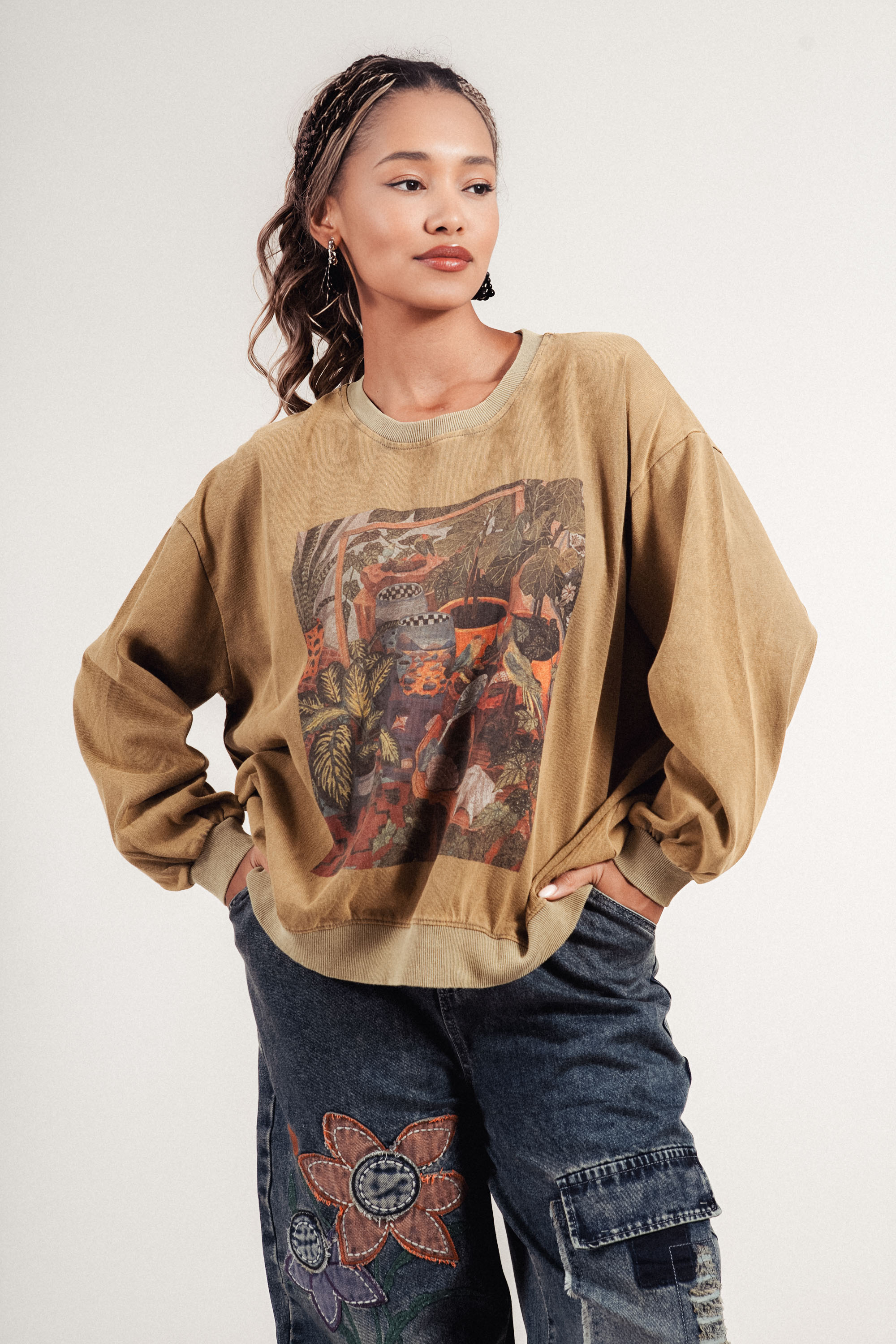 Блуза от памучна материя в свеж зелен нюанс. Моделът е декориран с ефектна щампа с цветя в саксии, която създава живо и модерно излъчване. Свободната кройка, дългите ръкави и облото деколте осигуряват комфорт и свобода на движение. Подходяща за ежедневни визии с дънки, панталон или пола.