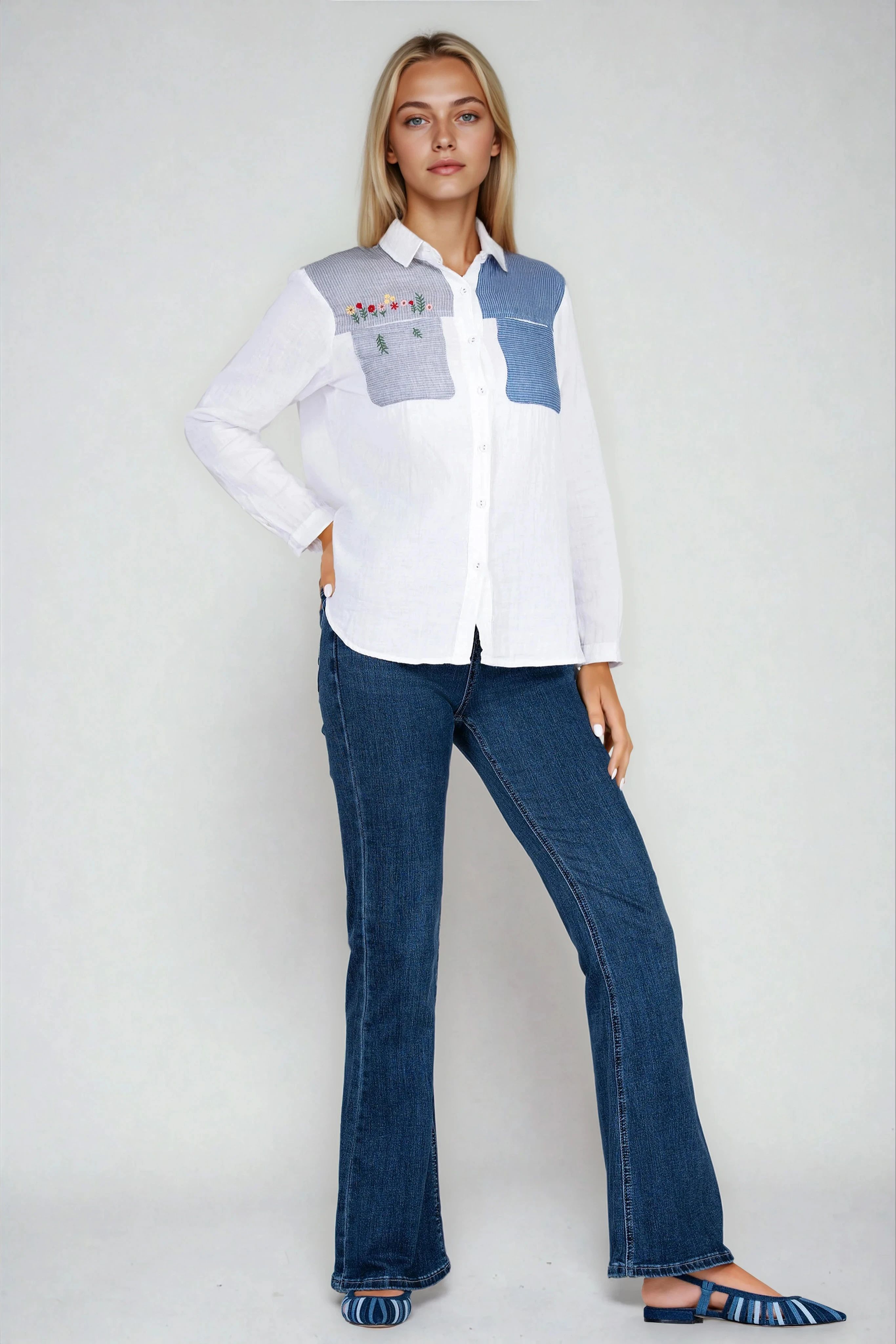 Дамска памучна риза в бяло с бродирани цветя и сини джобове