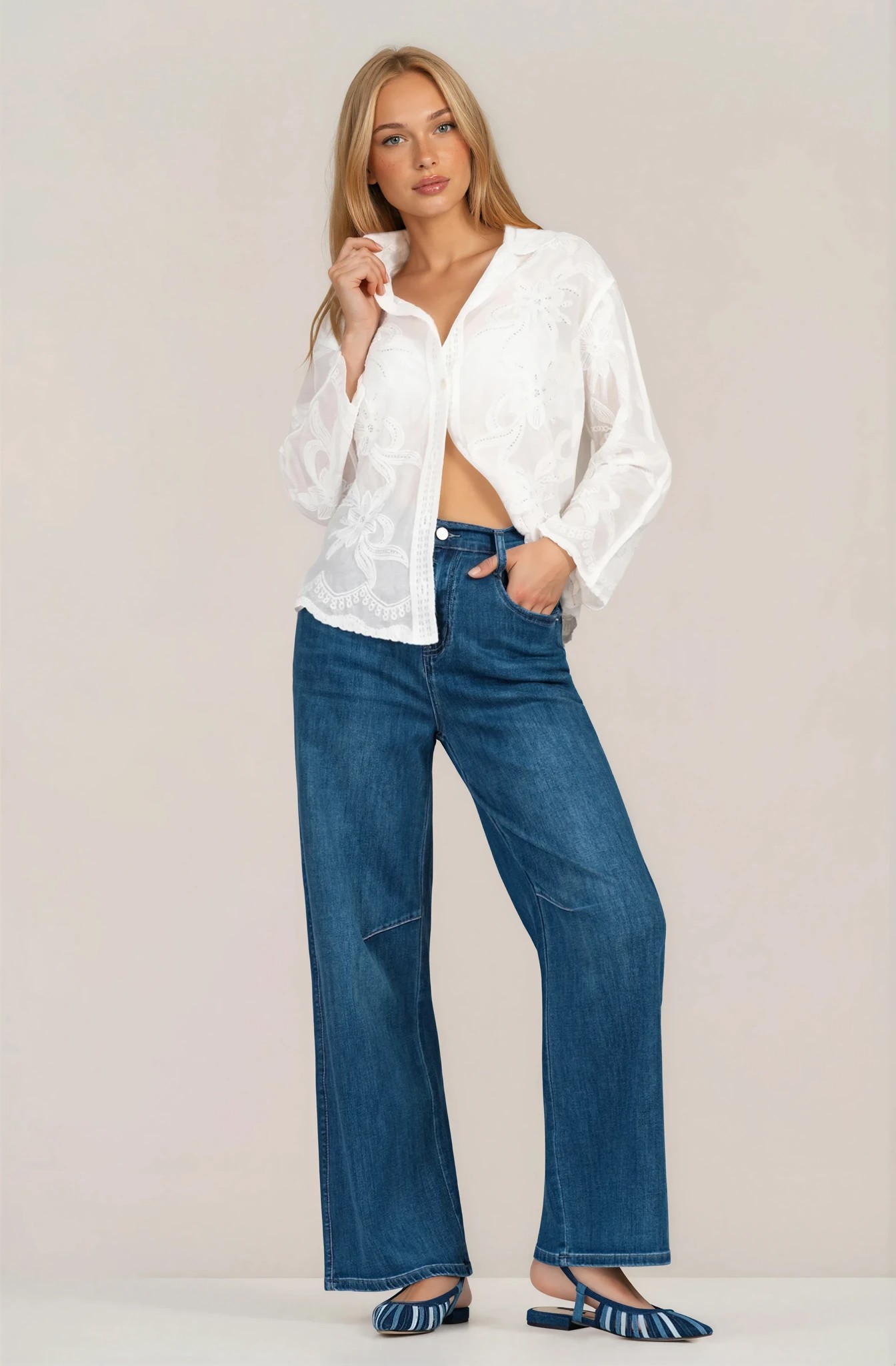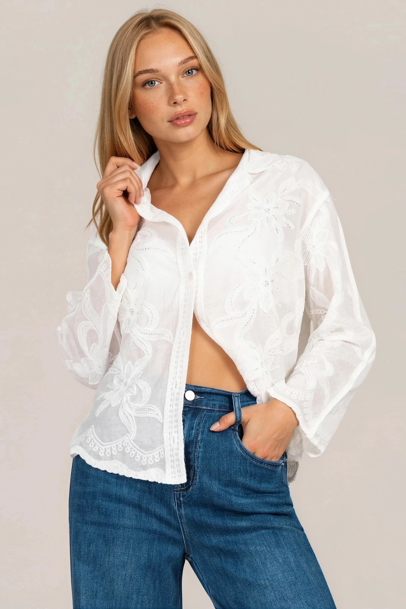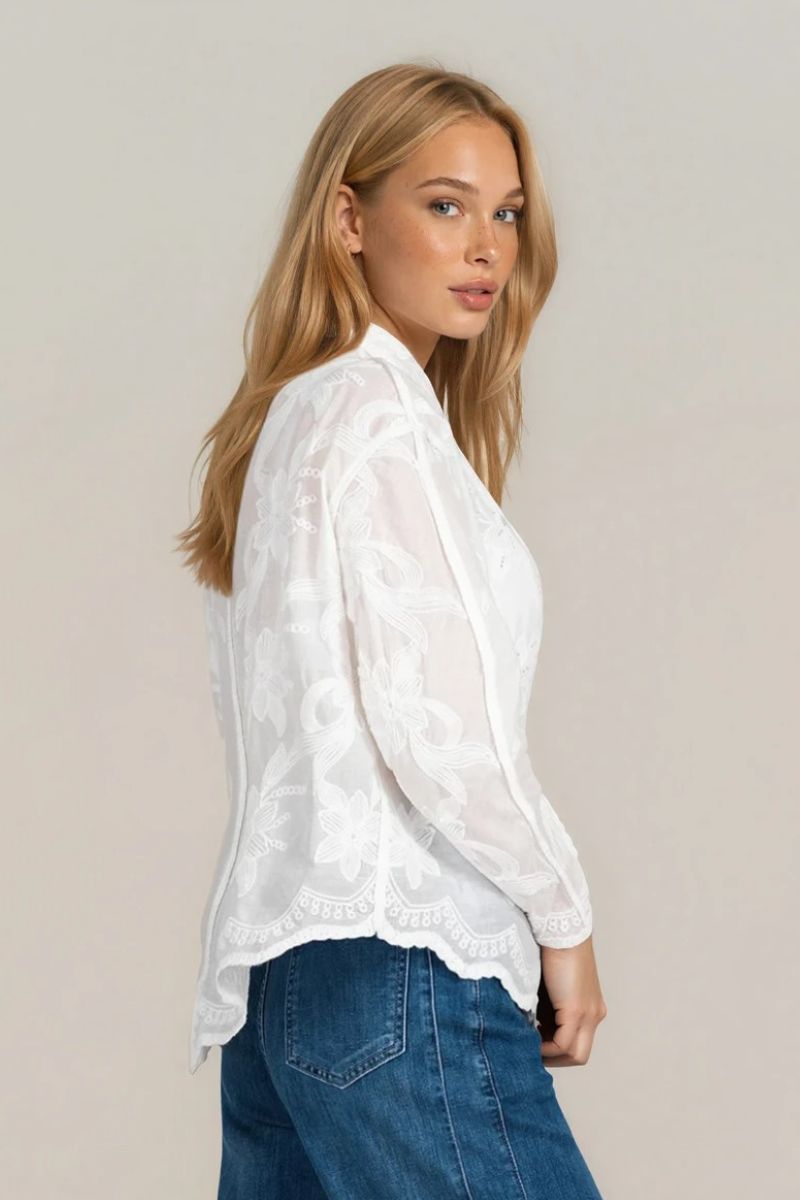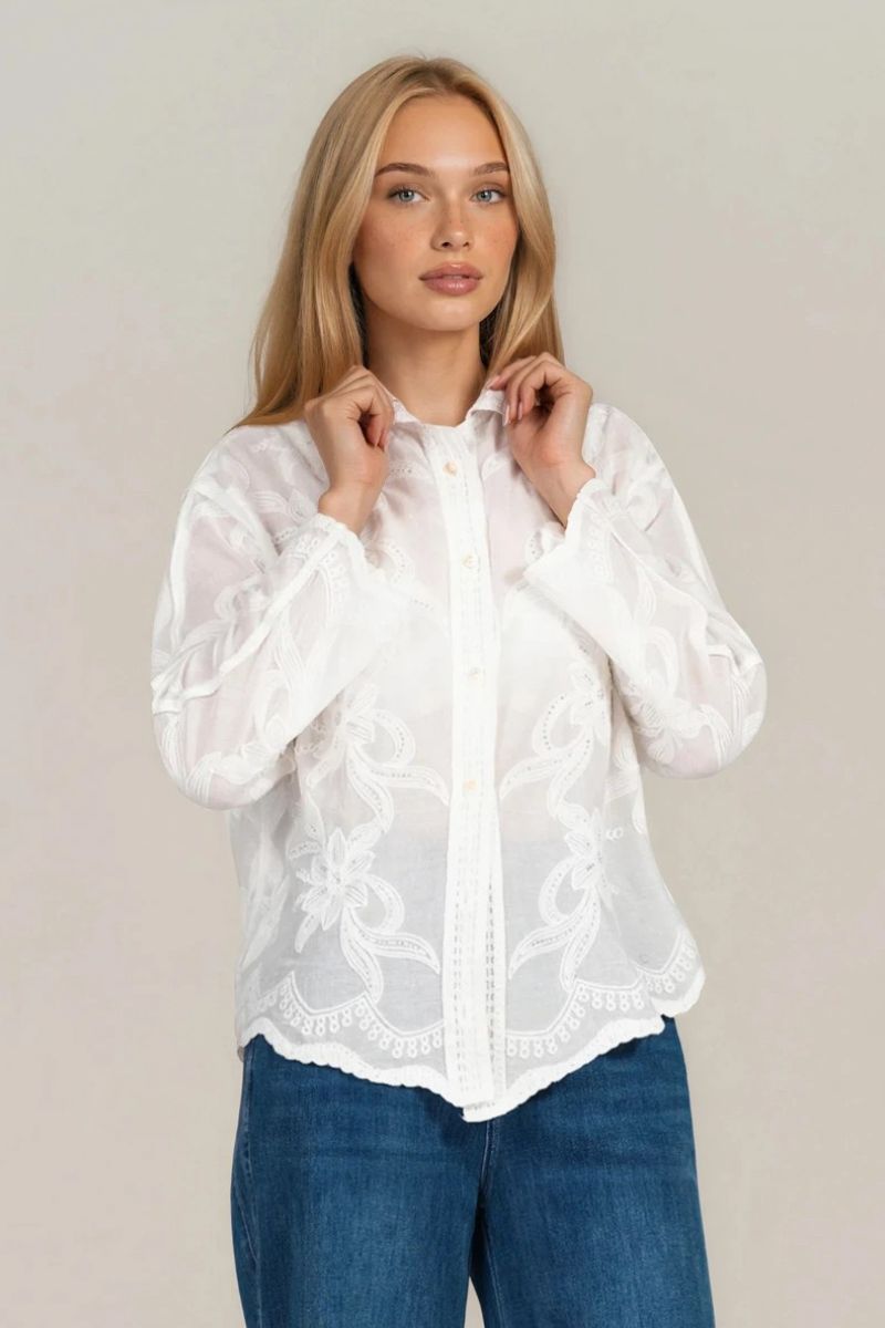 Стилна риза с ефирна визия и деликатна релефна бродерия, която създава усещане за лекота и женственост. Памучната материя е мека и приятна на допир, осигурявайки комфорт дори в по-топли дни. Свободният силует и фините детайли я превръщат в универсален избор за градска елегантност. Лесно се съчетава с дънки, панталони или поли.