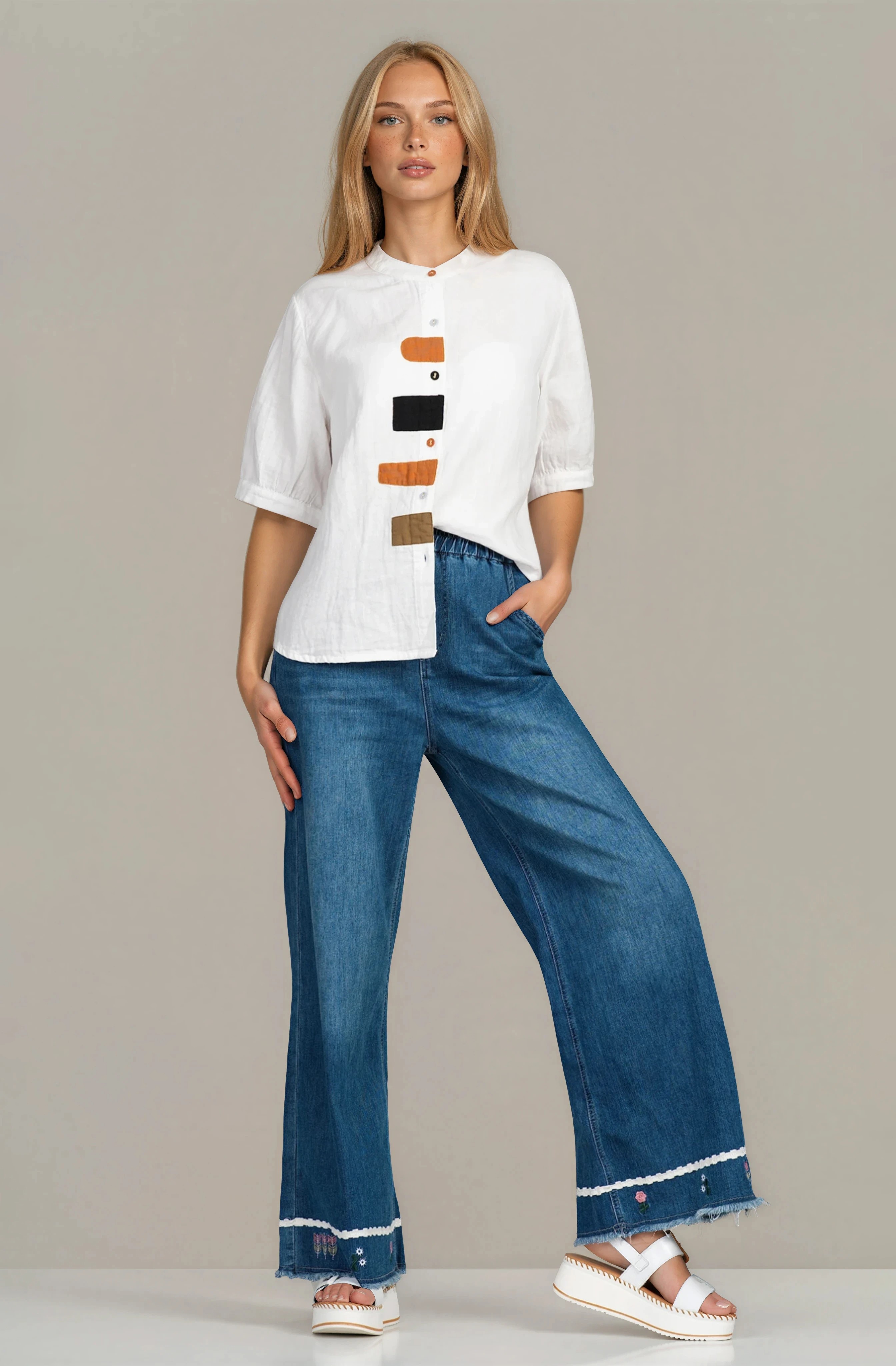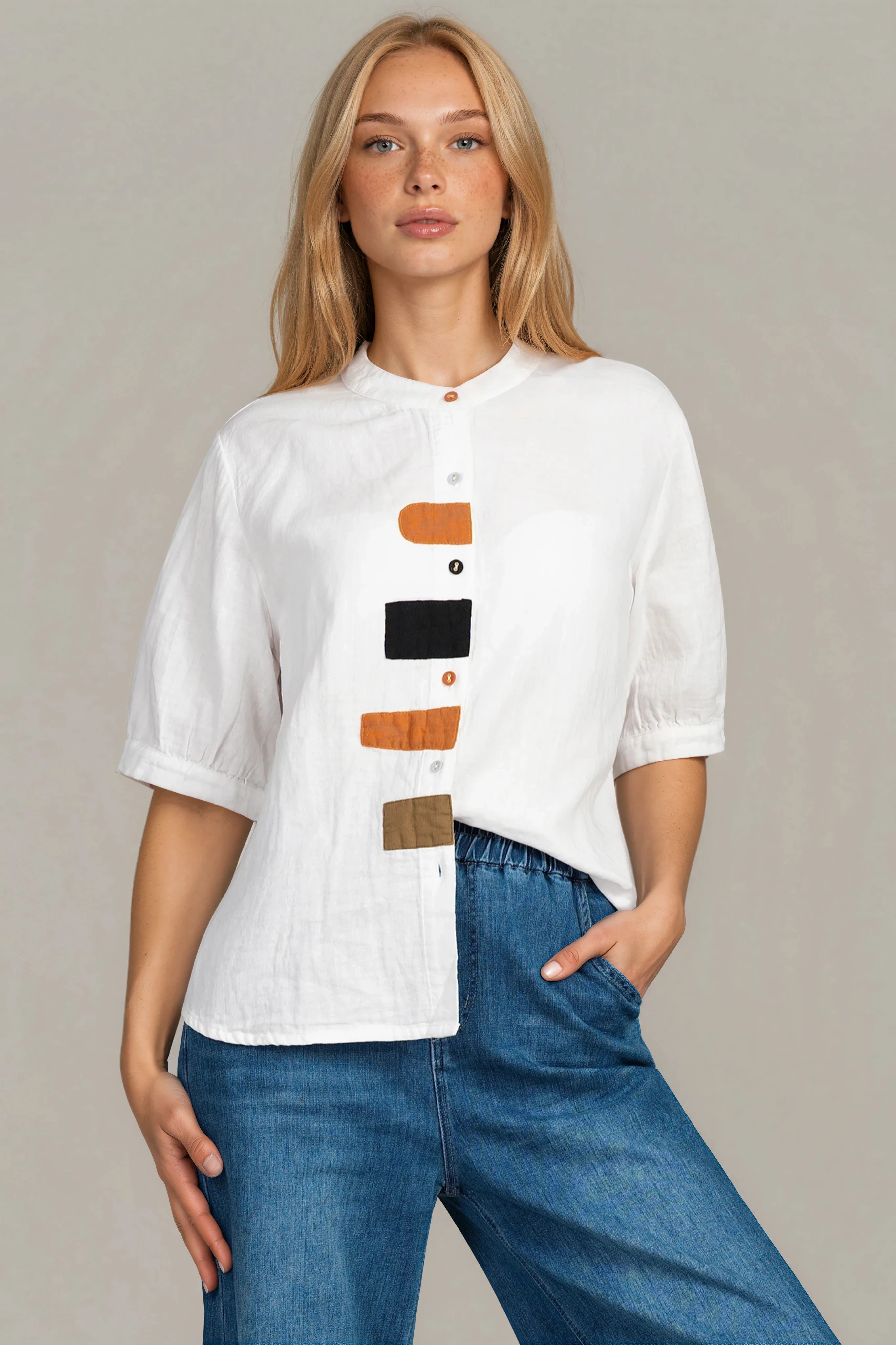 Елегантна дамска риза с изчистен силует и деликатни акцентни апликации, които придават характер на модела. Леката памучна материя позволява на кожата да диша и гарантира комфорт през всички сезони. Свободният силует създава модерно излъчване и удобство при носене. Лесно се комбинира с дънки, панталони или поли за разнообразни стилни визии.
