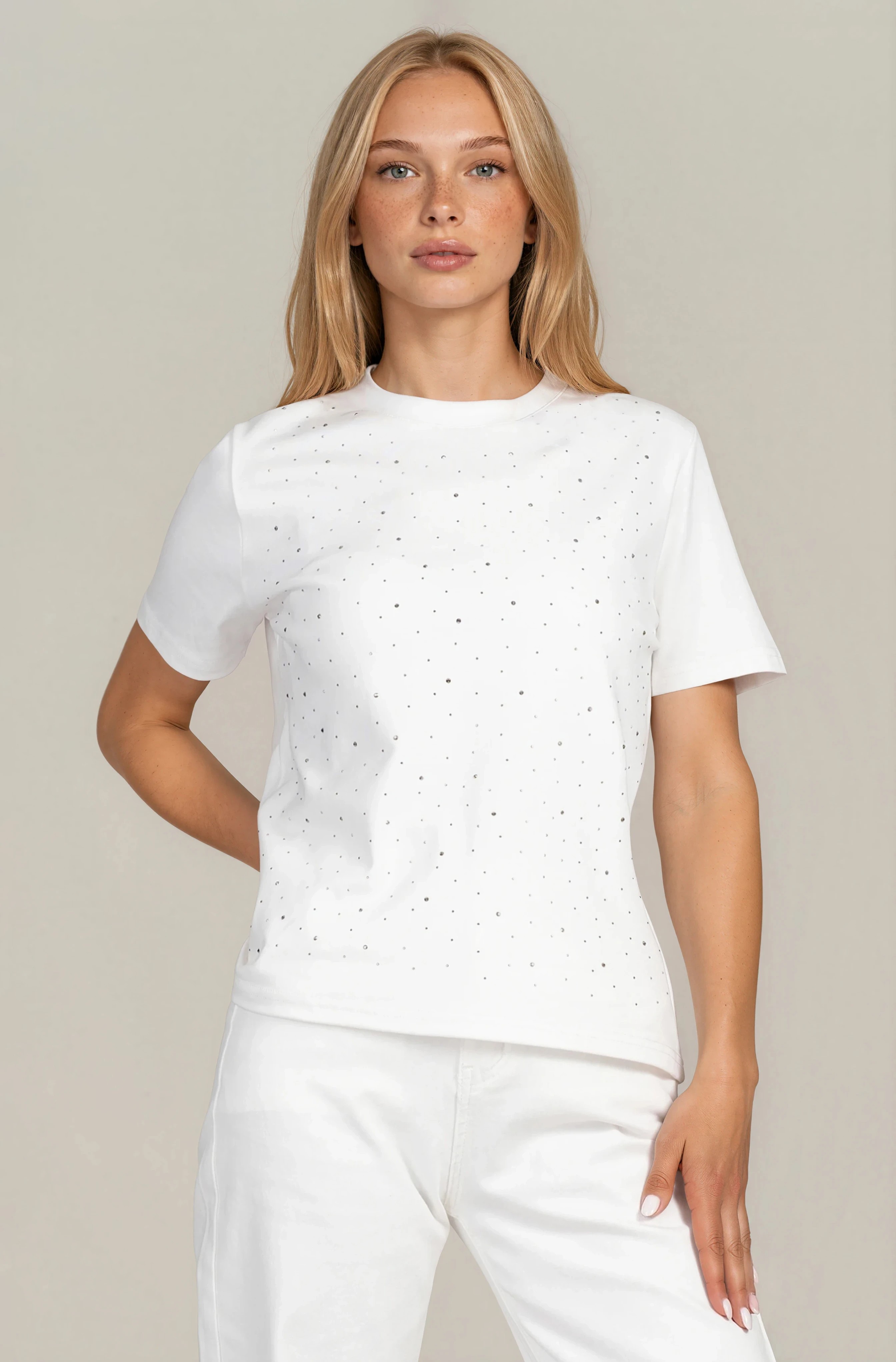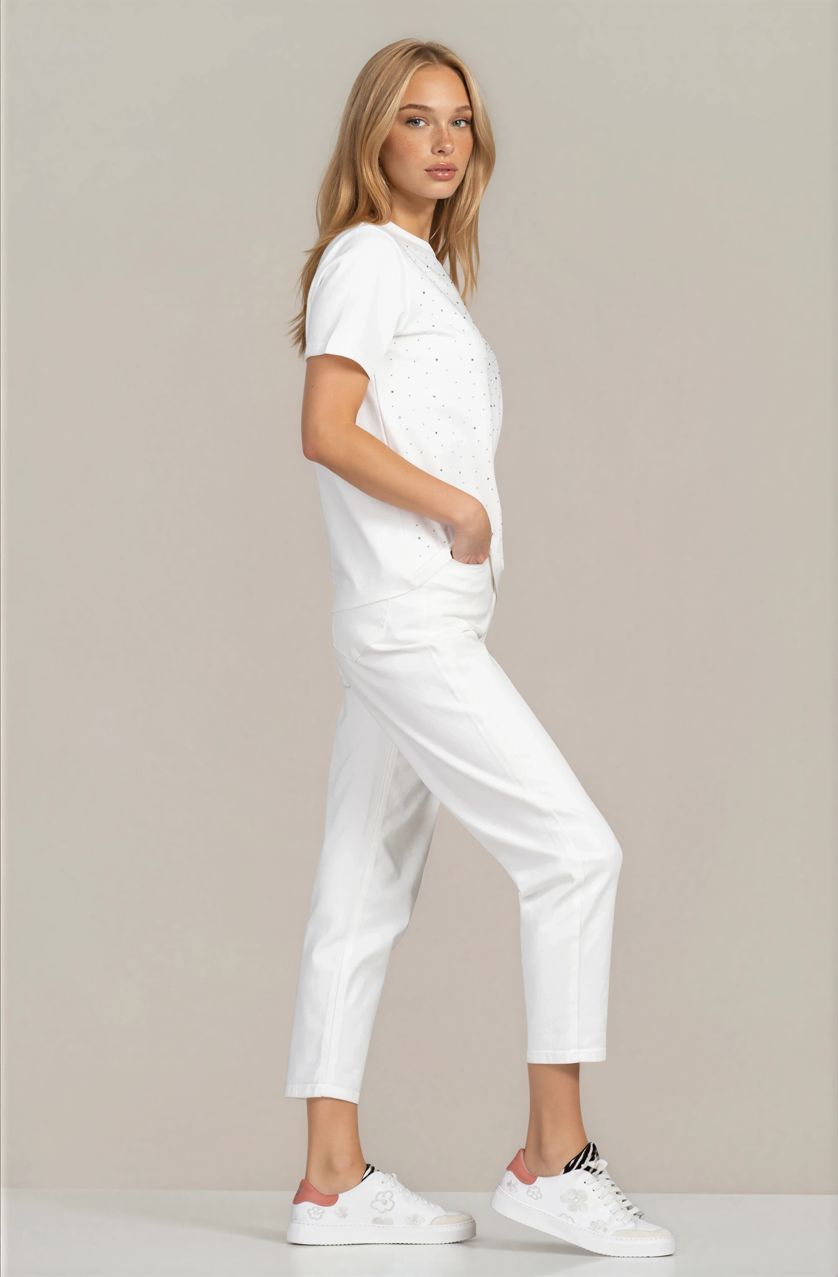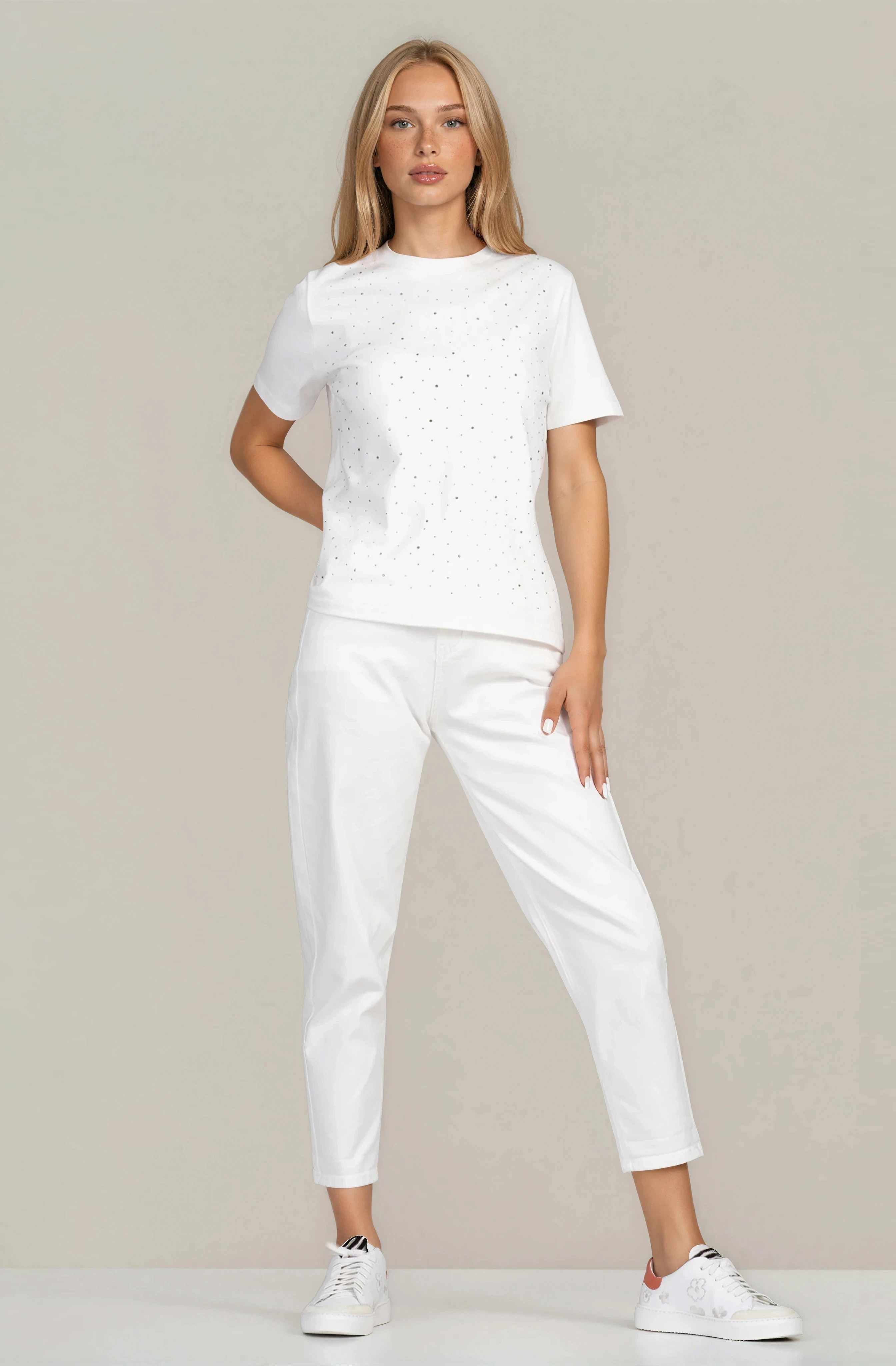 Дамска памучна тениска в бяло с декоративни камъни и права кройка