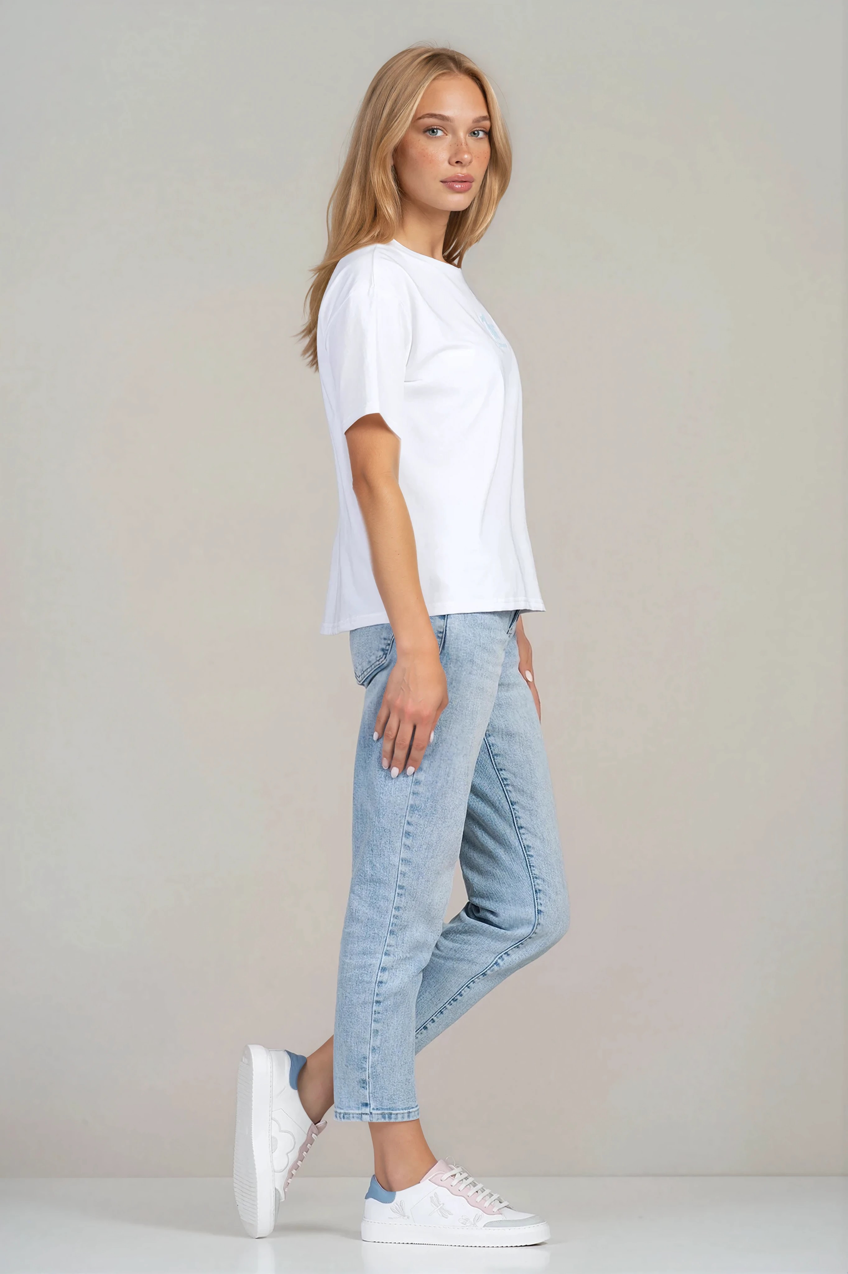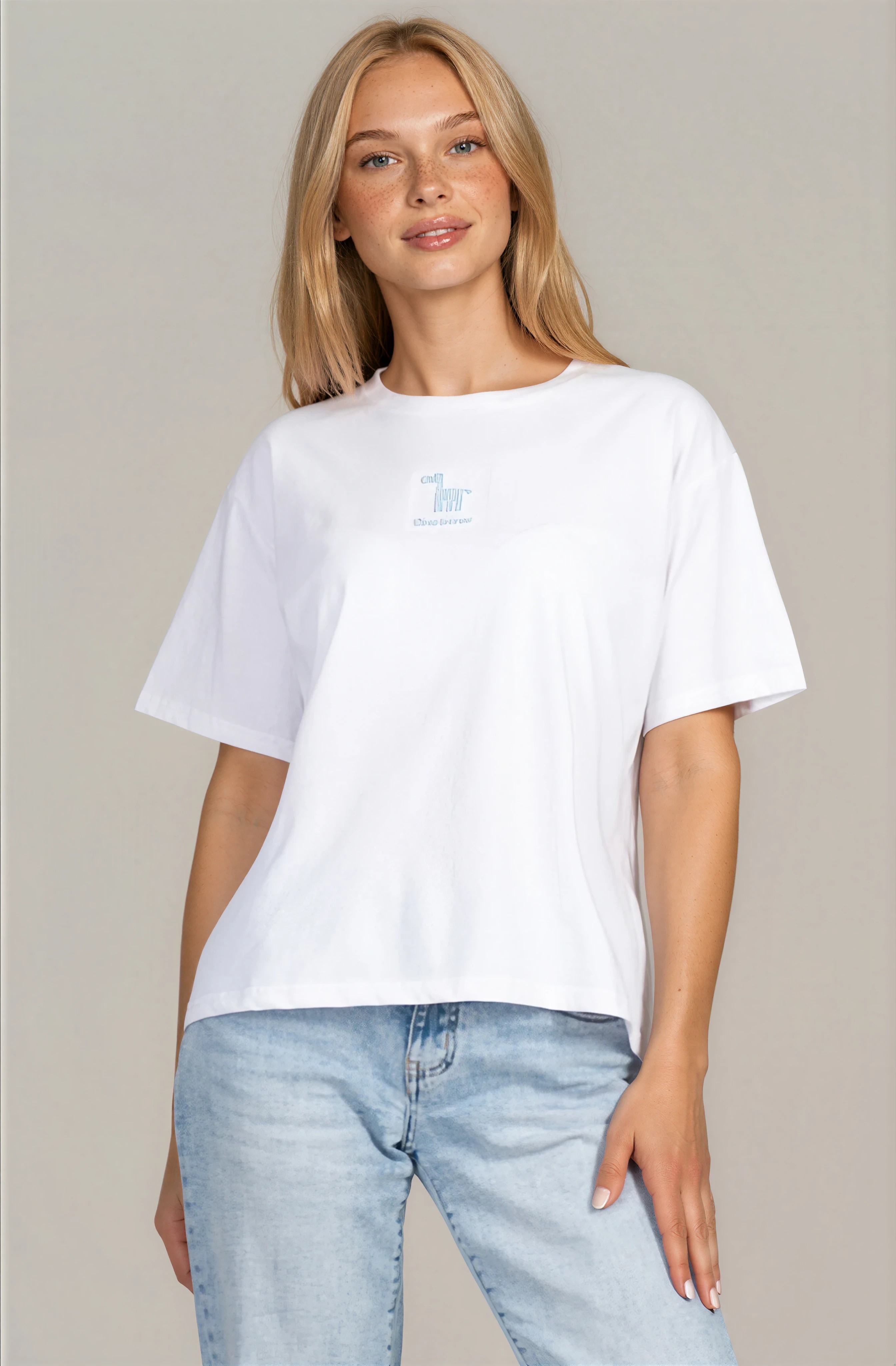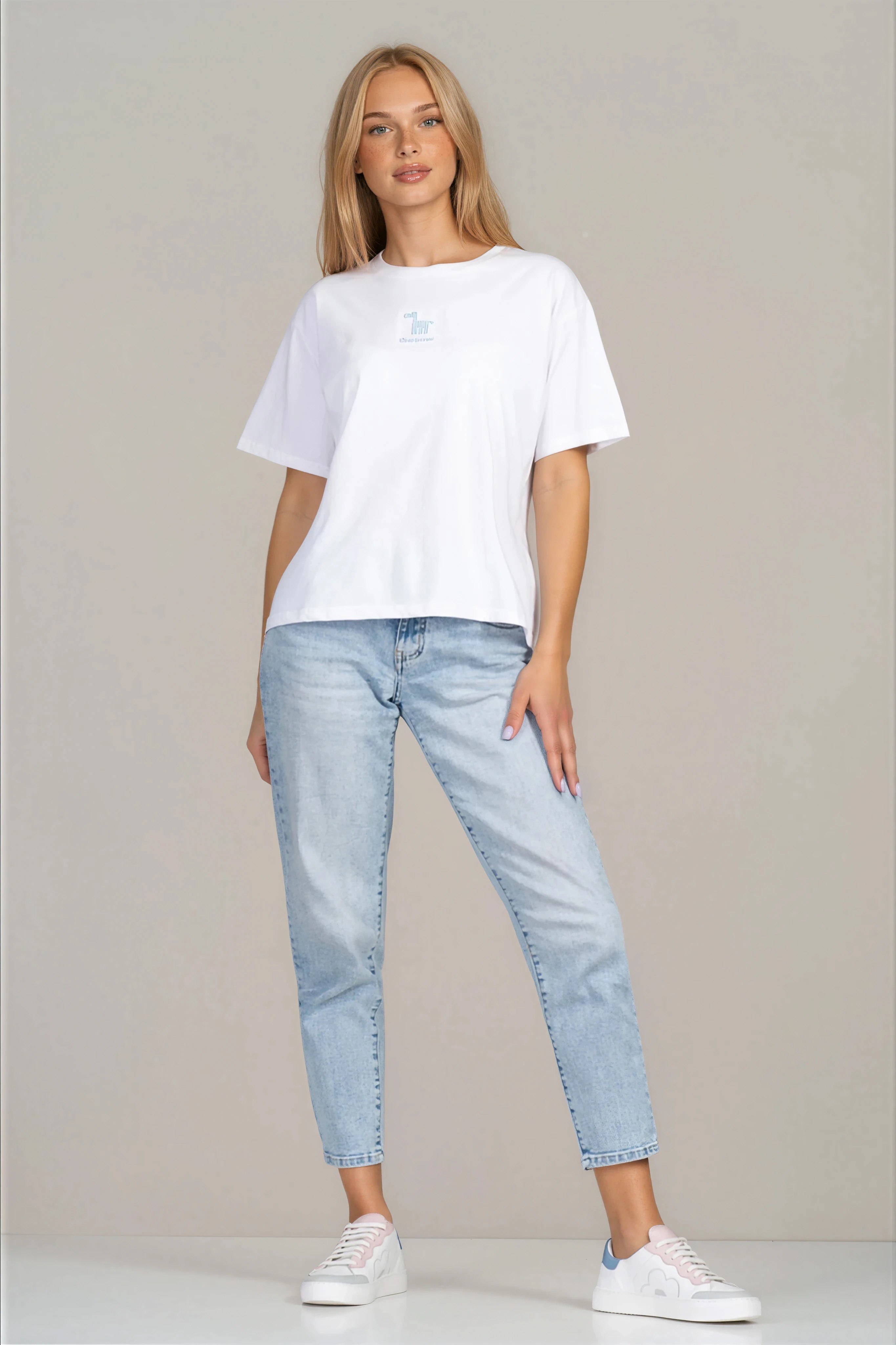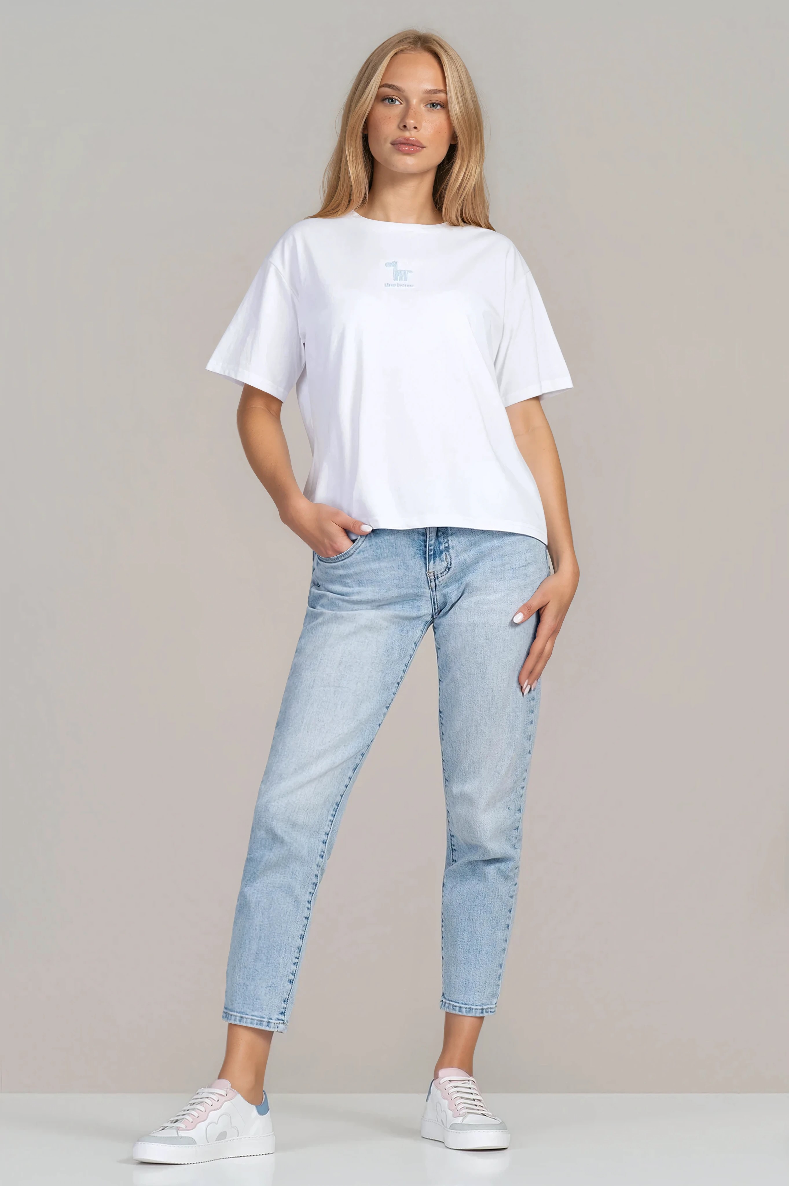 Лека дамска тениска в бял нюанс с деликатен минималистичена щампа, придаваща модерно излъчване. Памучната материя е мека, дишаща и комфортна за ежедневно носене. Свободната кройка осигурява удобство и естествено прилягане към тялото. Подходящ модел за свежи ежедневни визии през пролетно-летния сезон.