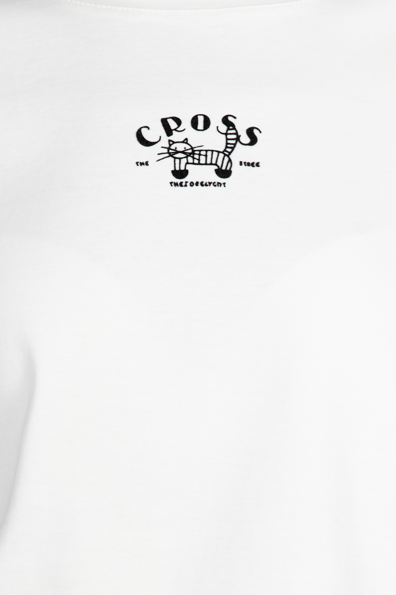 Дамска памучна тениска в бяло с минималистична щампа с котка и надпис