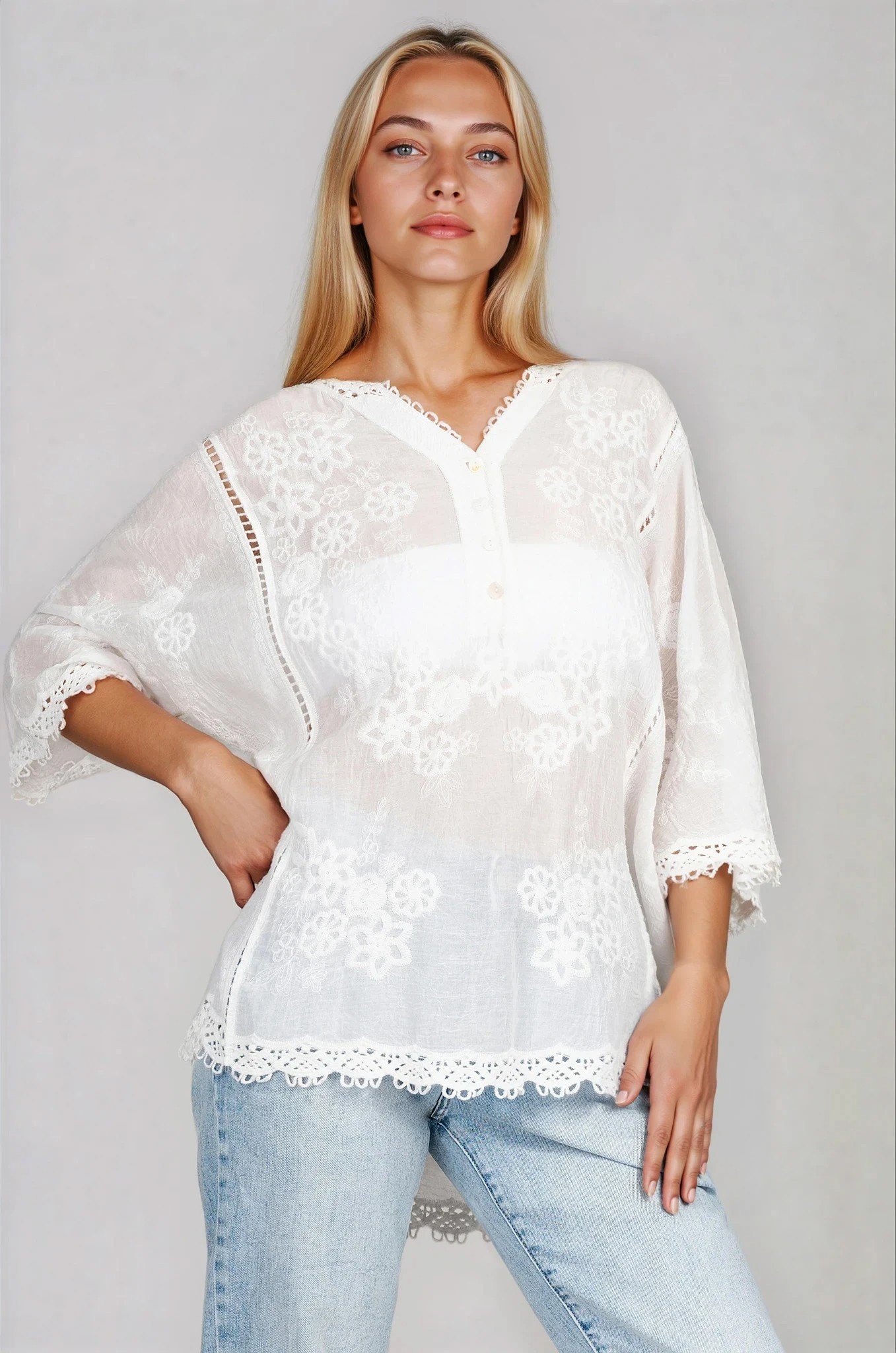 Дамска памучна туника в бяло с бродерия и 7/8 ръкав