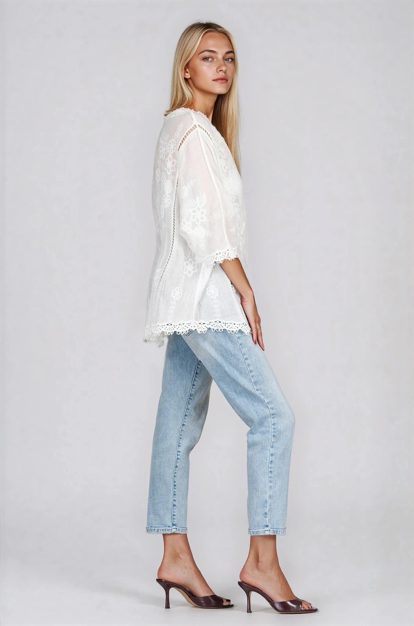 Eфектна туника от памук в класическо бяло, съчетаваща комфорт и деликатна женственост. Моделът е с остро деколте с копчета и 7/8 ръкав, завършен с фина бродерия. Свободният силует пада леко по тялото и осигурява удобство през целия ден. Памучната материя е дишаща и изключително приятна при допир, което прави модела подходящ за пролетно-летния сезон. Идеален избор за комбинация с деним или ленени панталони.