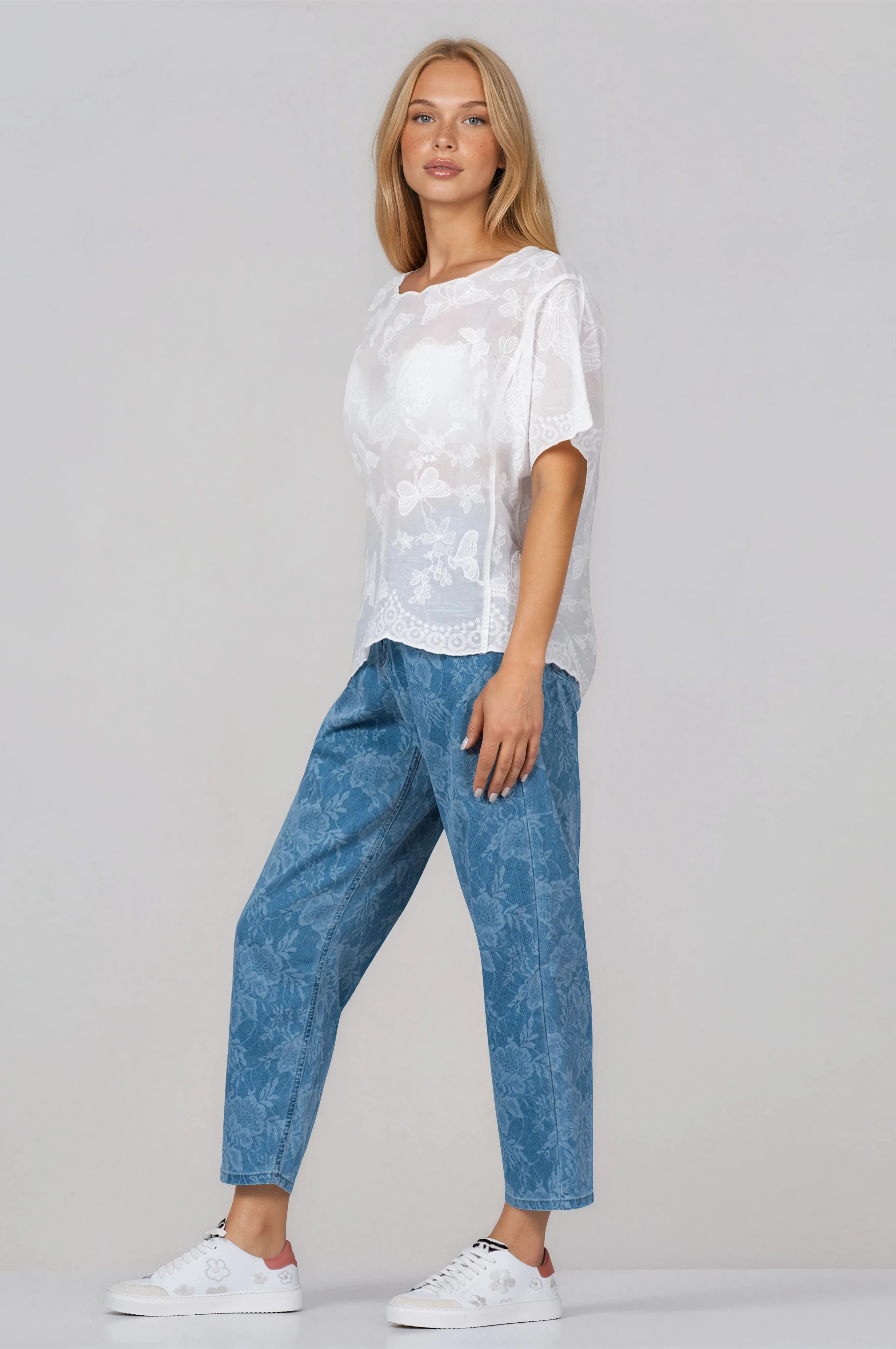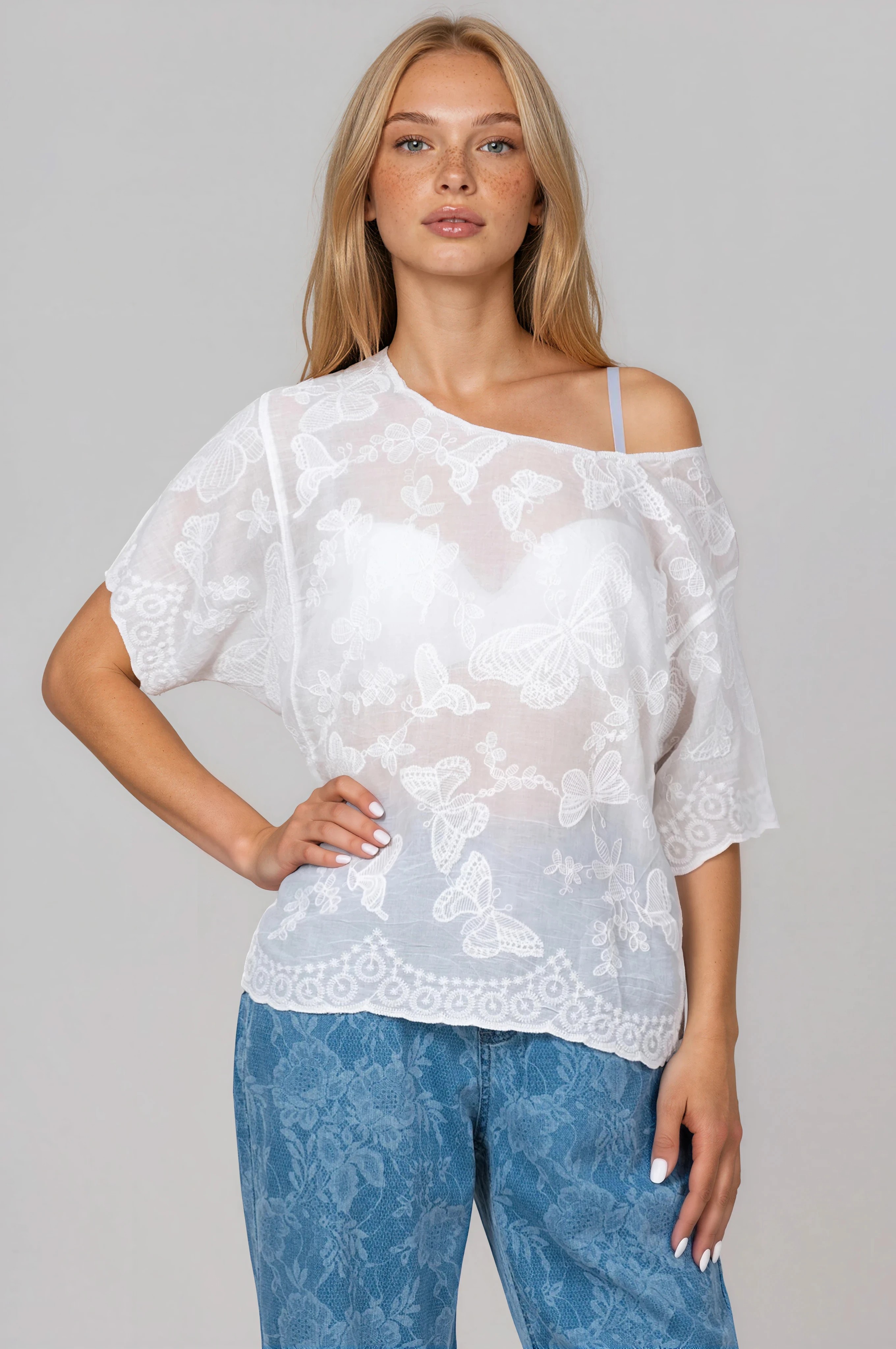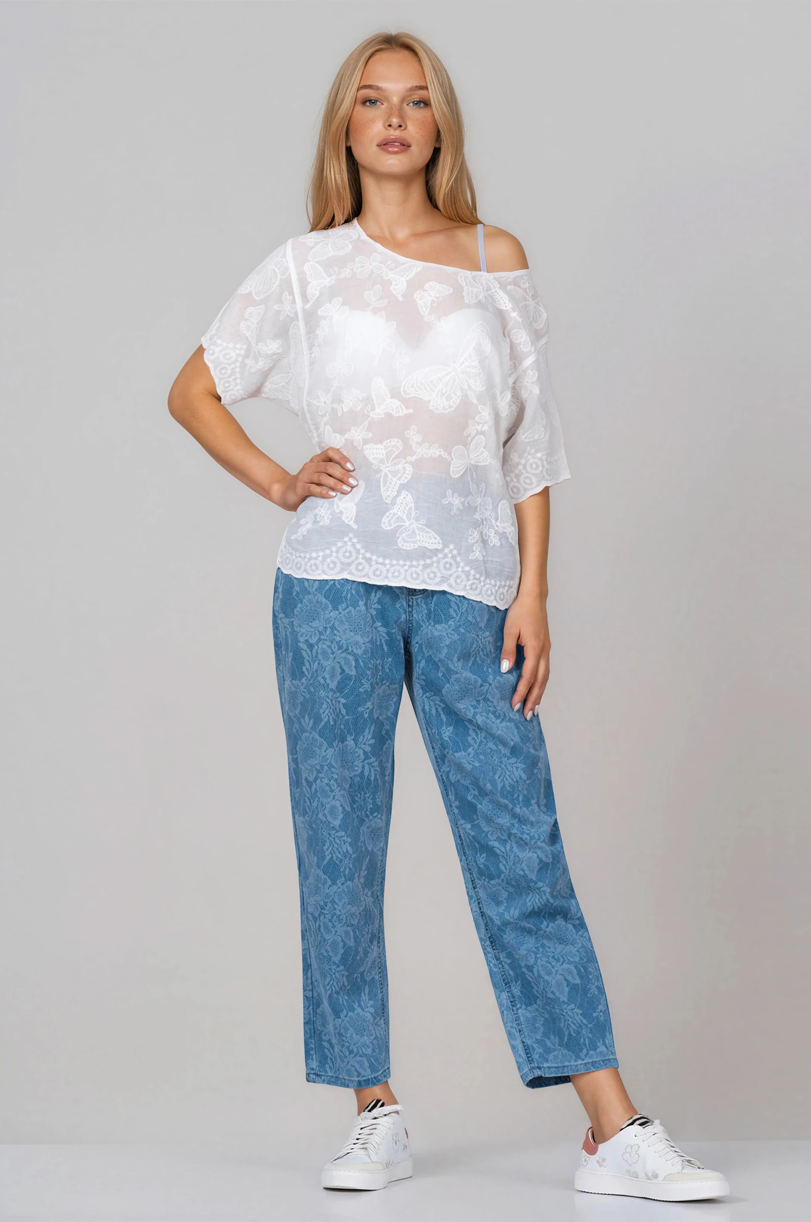 Елегантна блуза от памук с ефирно излъчване и деликатна бродерия с флорални мотиви и пеперуди. Свободната кройка осигурява комфорт през целия ден, а обло деколте придава мек и женствен силует. Материята е дишаща и подходяща за топлите сезони. Моделът се комбинира лесно с панталони или дънки за стилна ежедневна визия.